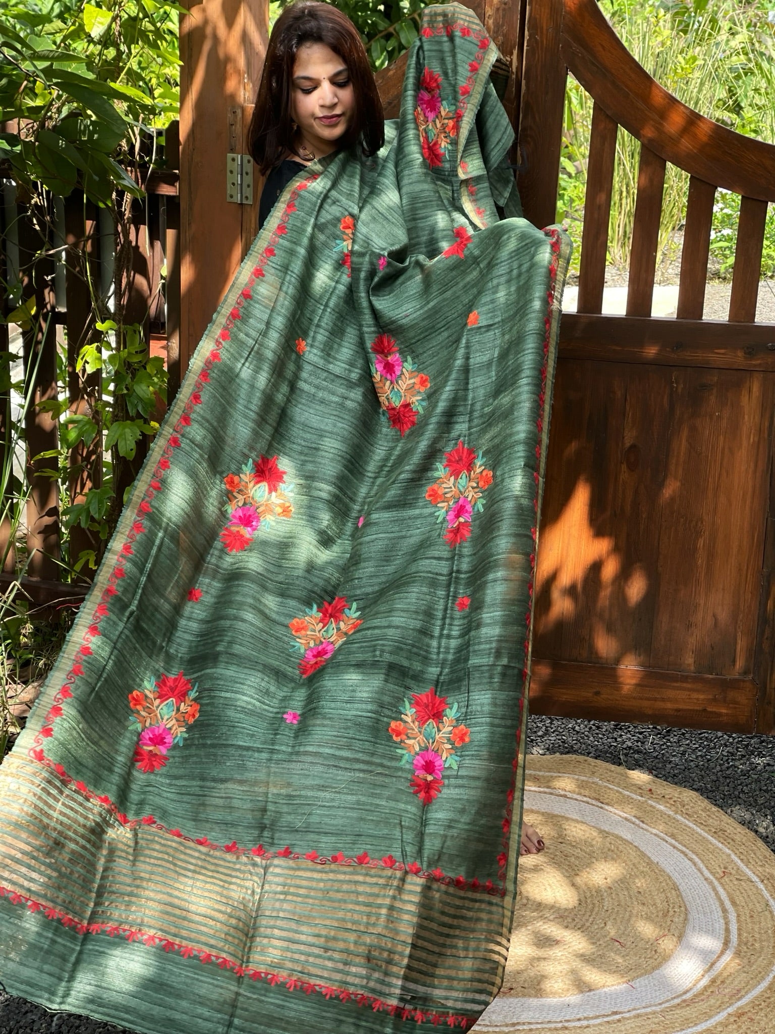 Unleash elegance and sophistication in this Kashmiri Aari Dupatta. Made from pure Geecha Silk, its intricate embroidery and stunning colors make it a timeless classic. A must-have for your wardrobe, this head-turner exudes sheer luxury and opulence. Perfect for any occasion, elevate your style with this exquisite piece.