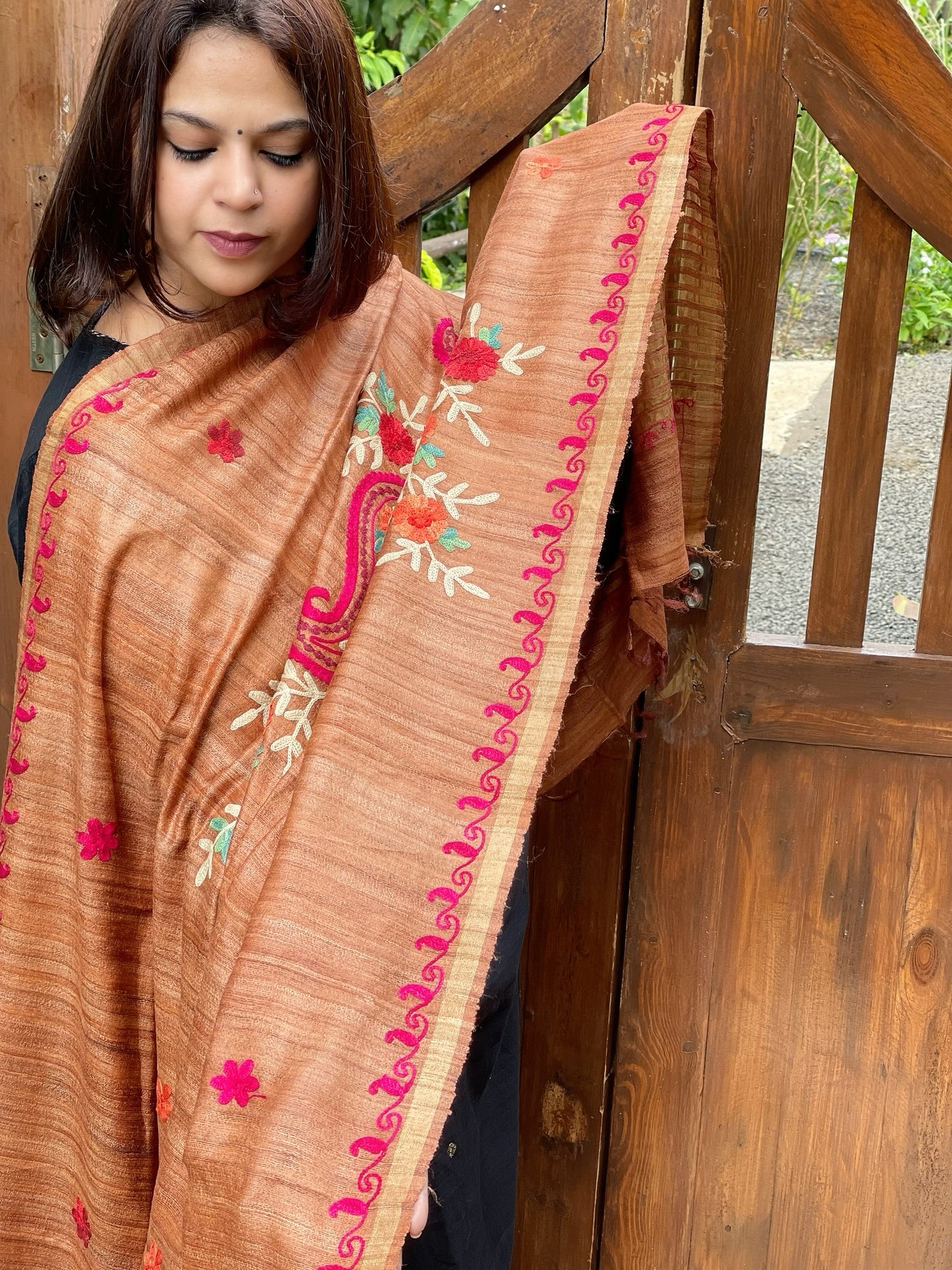 Dull Orange Kashmiri Aari Embroidered Dupatta in Geecha Silk