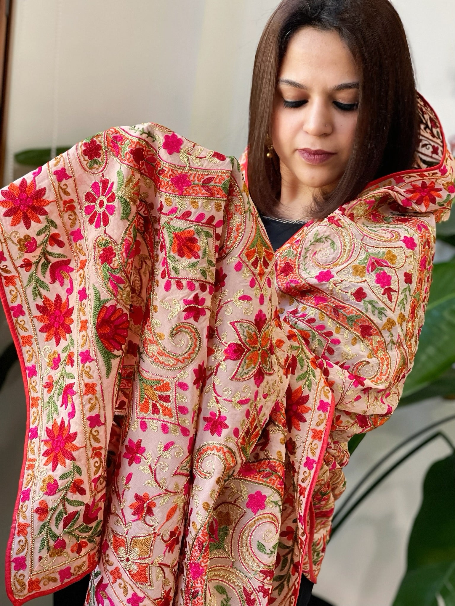 Peach Kashmiri Aari Embroidery dupatta in Georgette