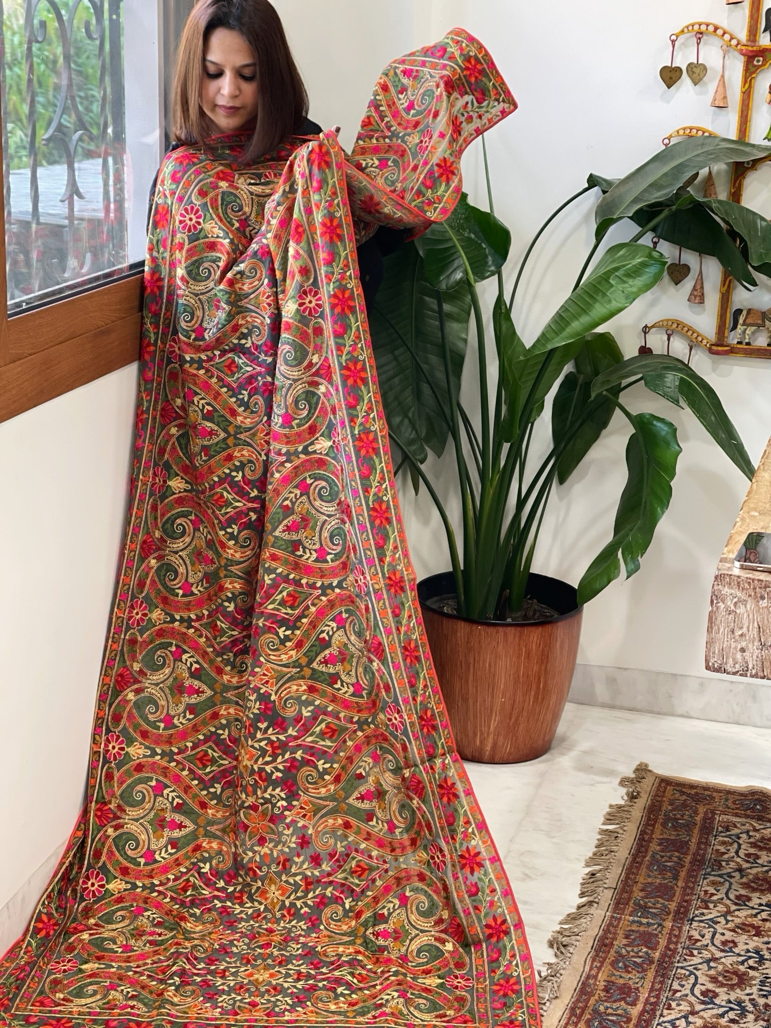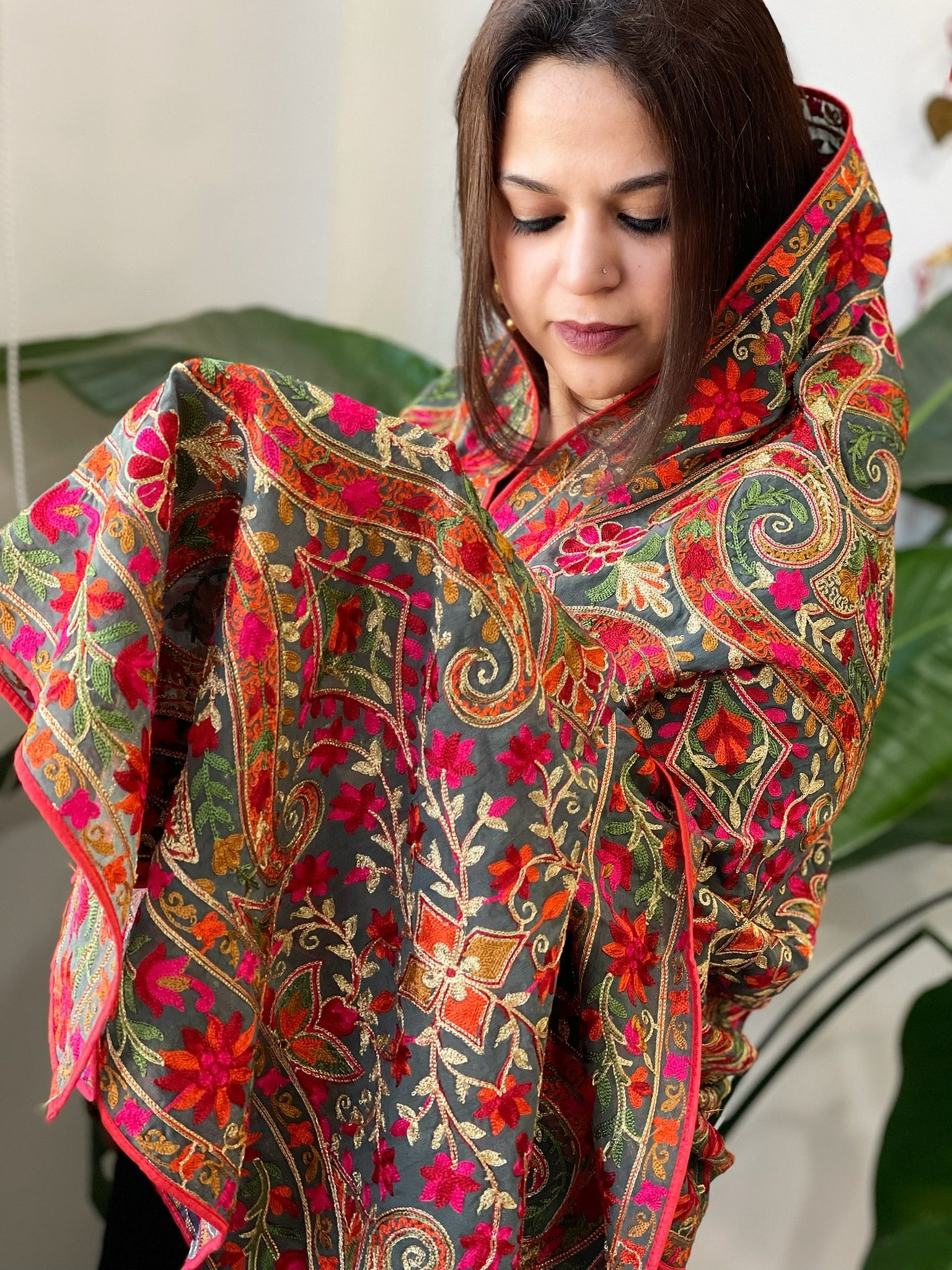 Expertly crafted, this Kashmiri Aari embroidered dupatta in georgettevshowcases stunning thread work. Perfect for the wedding season. Very versatile and royal embroidered dupatta