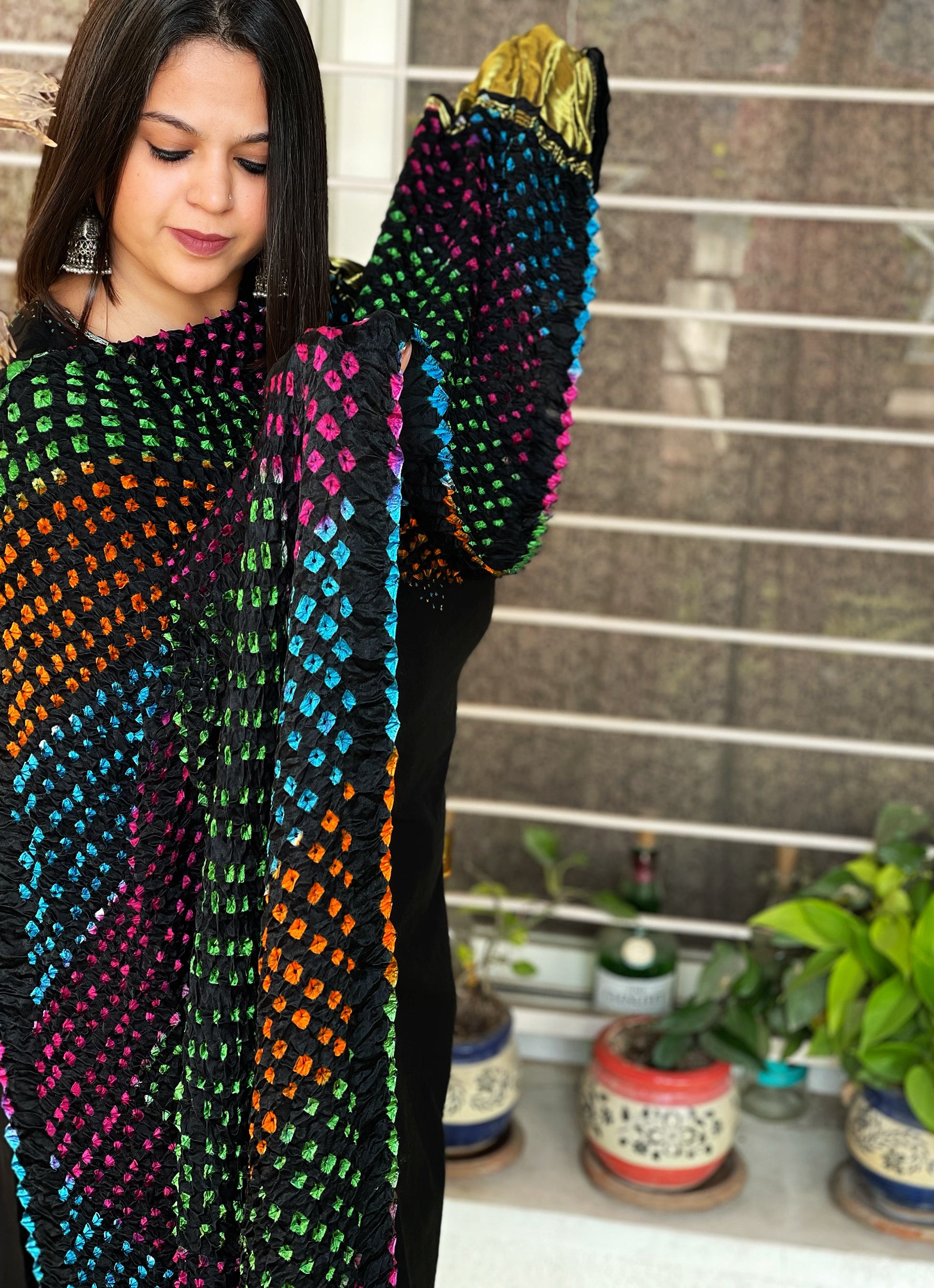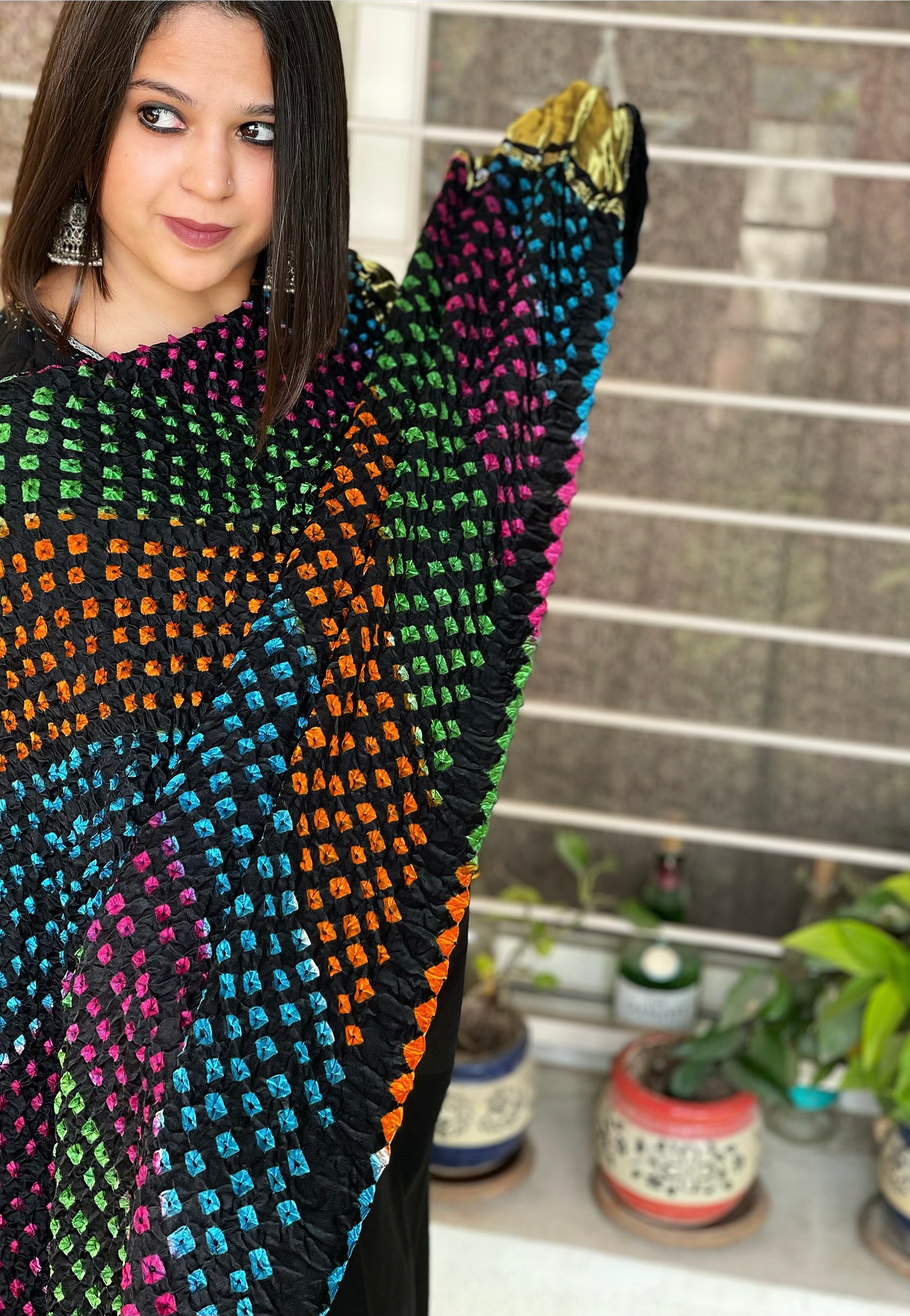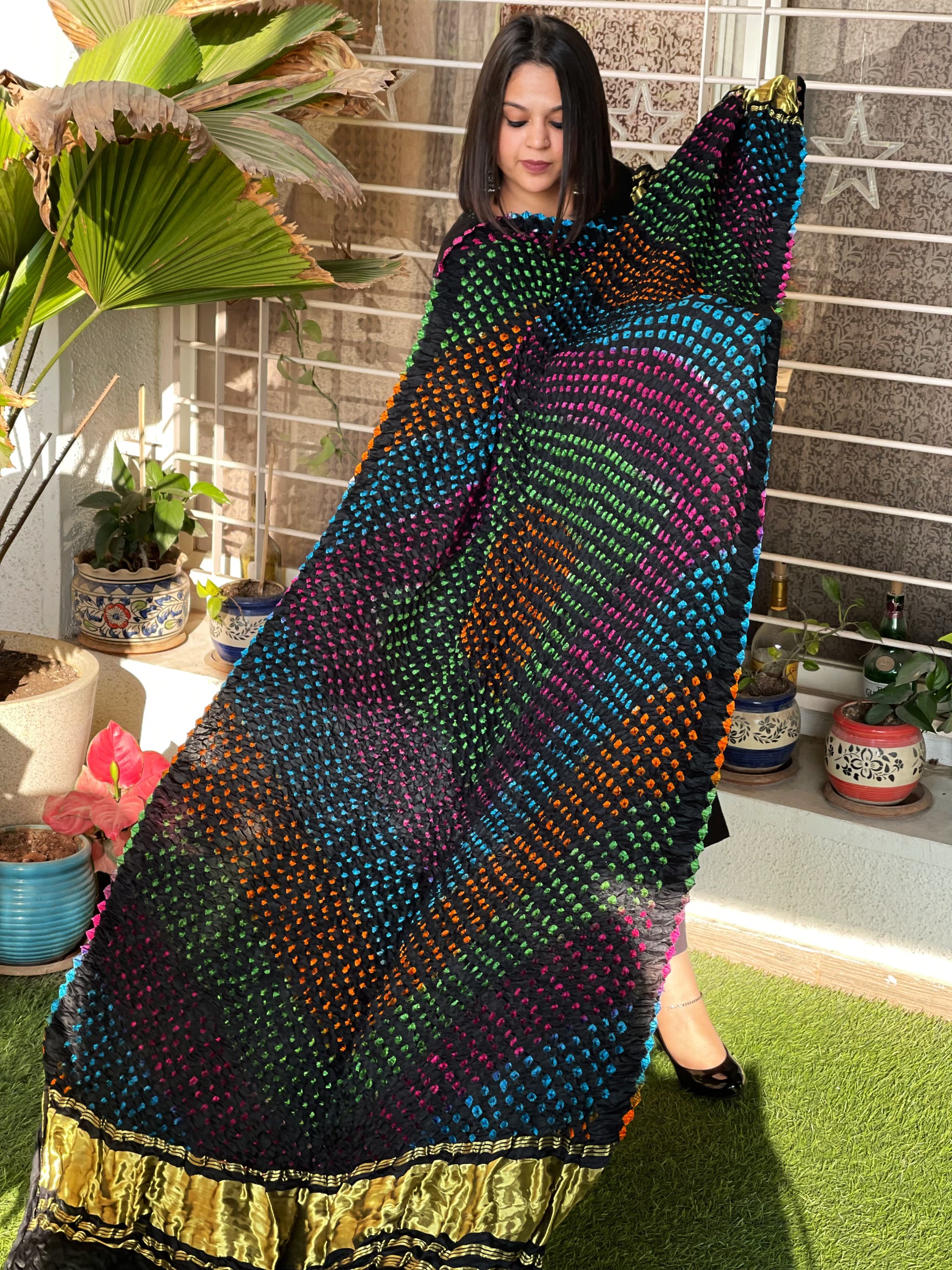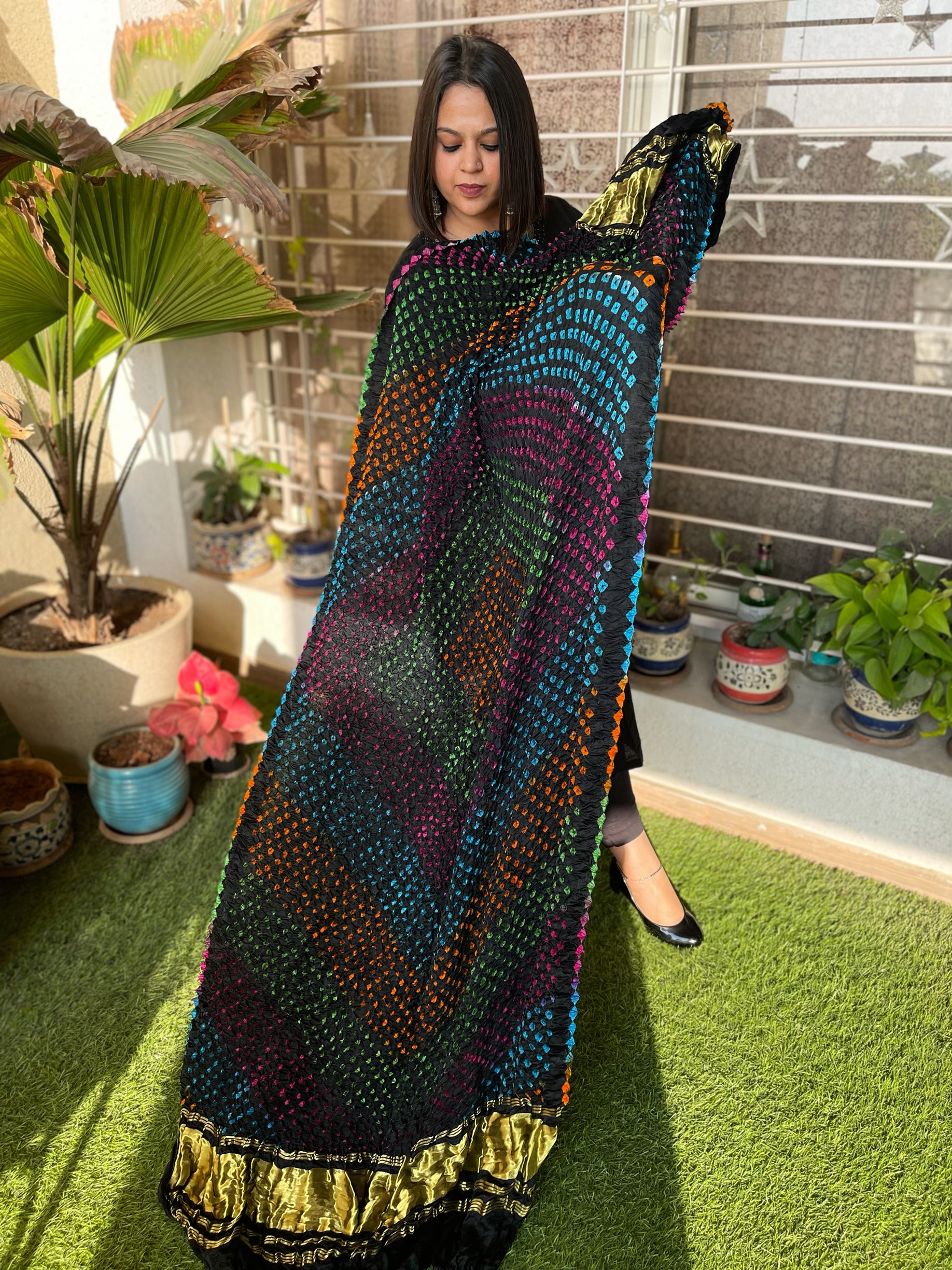 Handcrafted in India, the exquisite Kodi Bandhej Dupatta is made of pure Gajji silk and features a stunning Zari Pallu. Its gorgeous multi-color combination adds versatility to this beautiful piece, while its fall and drape enhance its overall elegance. Elevate any outfit with this one-of-a-kind, expertly crafted dupatta.