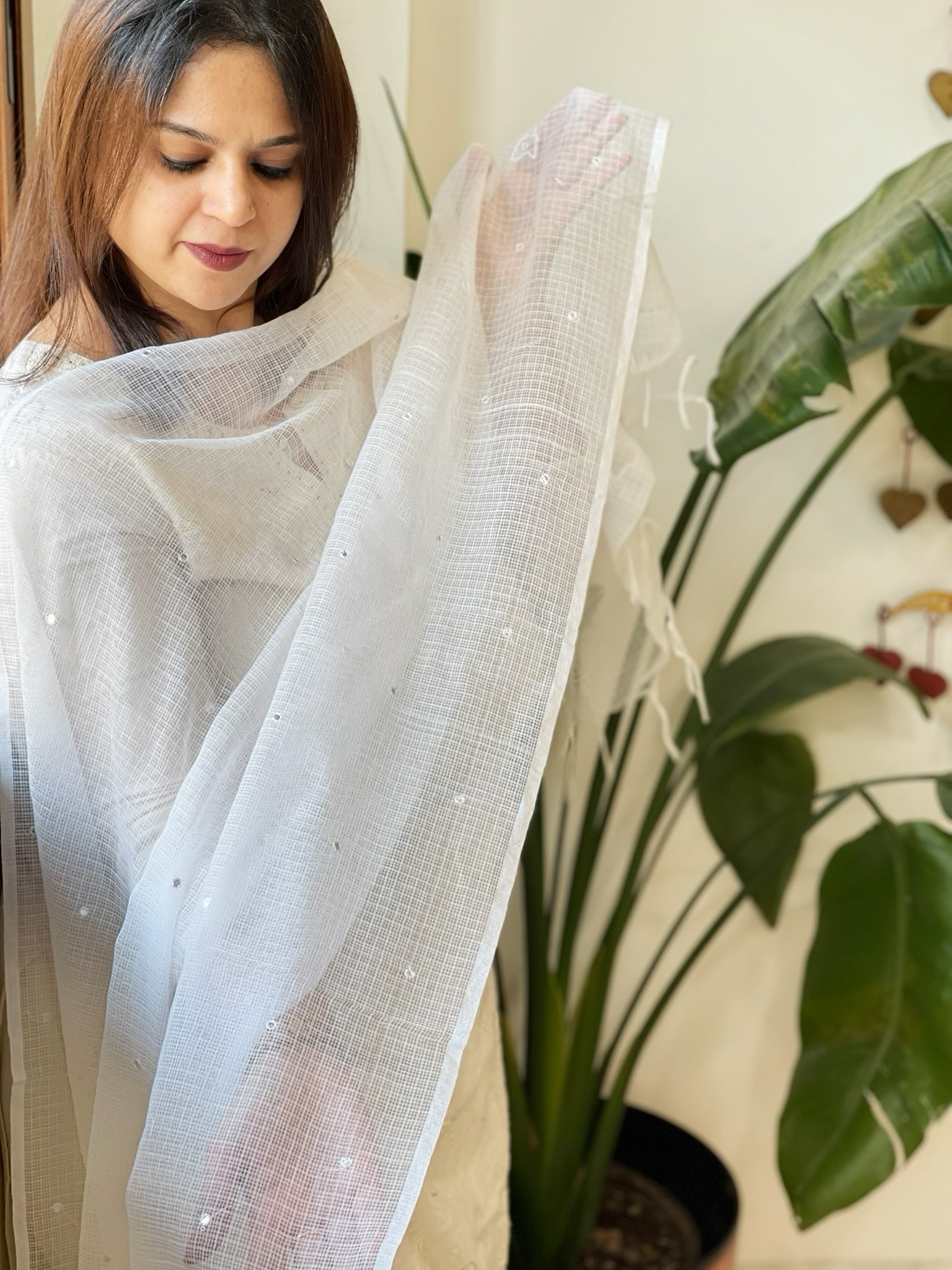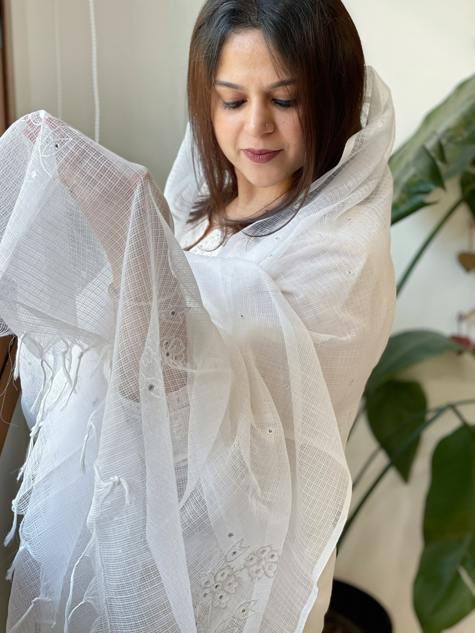 This White Kota Cotton Dupatta with Thread Embroidery and Mirror Work is a handmade piece of art that exudes summery and lite vibes. Made from high-quality Kota cotton, it features delicate thread embroidery and mirror work that adds a touch of elegance. Perfect for any occasion, this dupatta is both stylish and comfortable.