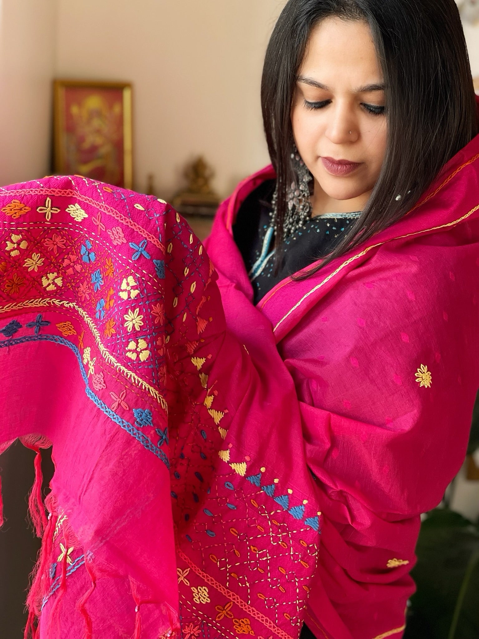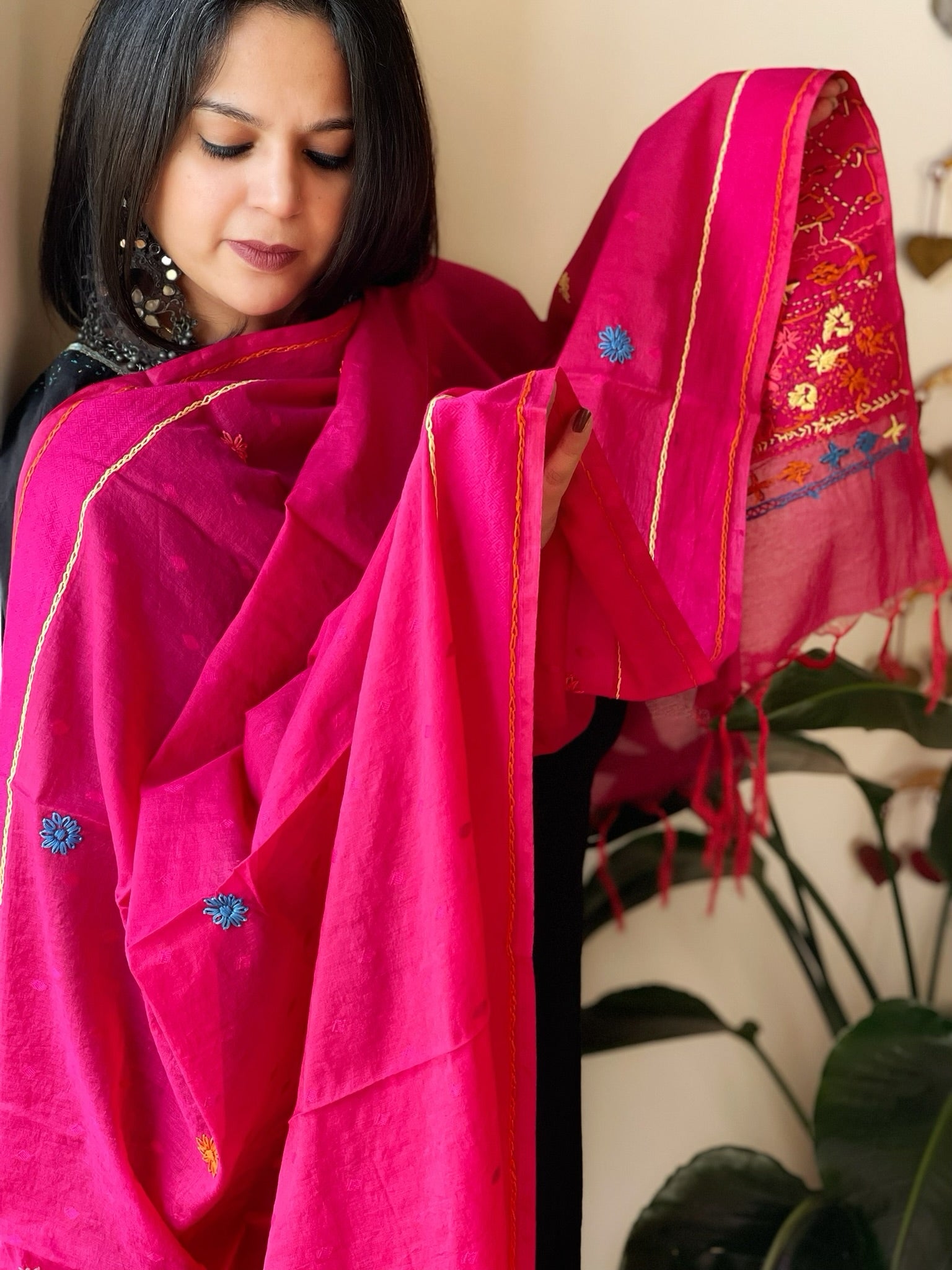 Hot Pink Lambani Handwork Dupatta with Self in Pure Handwoven Cotton