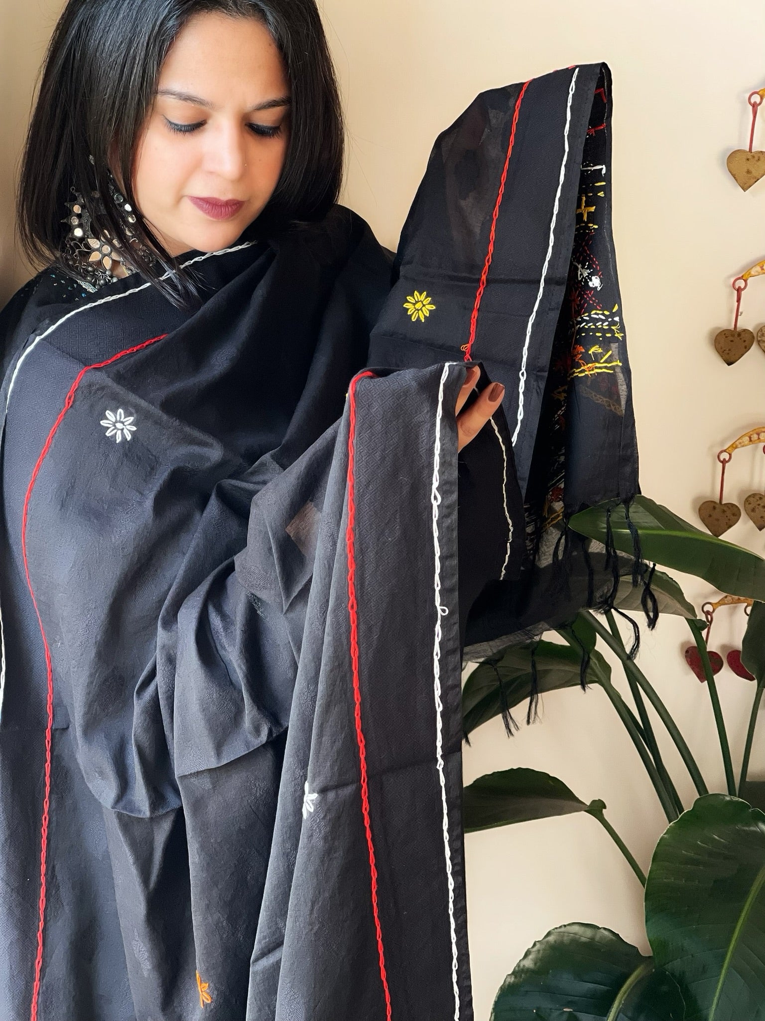 This Handwoven Cotton Dupatta showcases intricate Self and Lambani Handwork, adding a unique touch to the exclusive design. Made from high-quality cotton, it offers both comfort and style. Elevate any outfit with this expertly crafted piece.