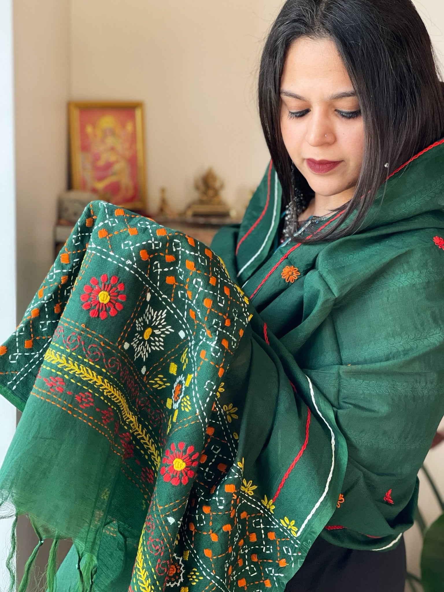 This Handwoven Cotton Dupatta showcases intricate Self and Lambani Handwork, adding a unique touch to the exclusive design. Made from high-quality cotton, it offers both comfort and style. Elevate any outfit with this expertly crafted piece.