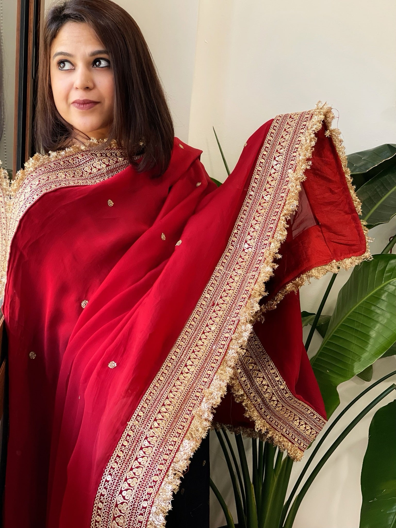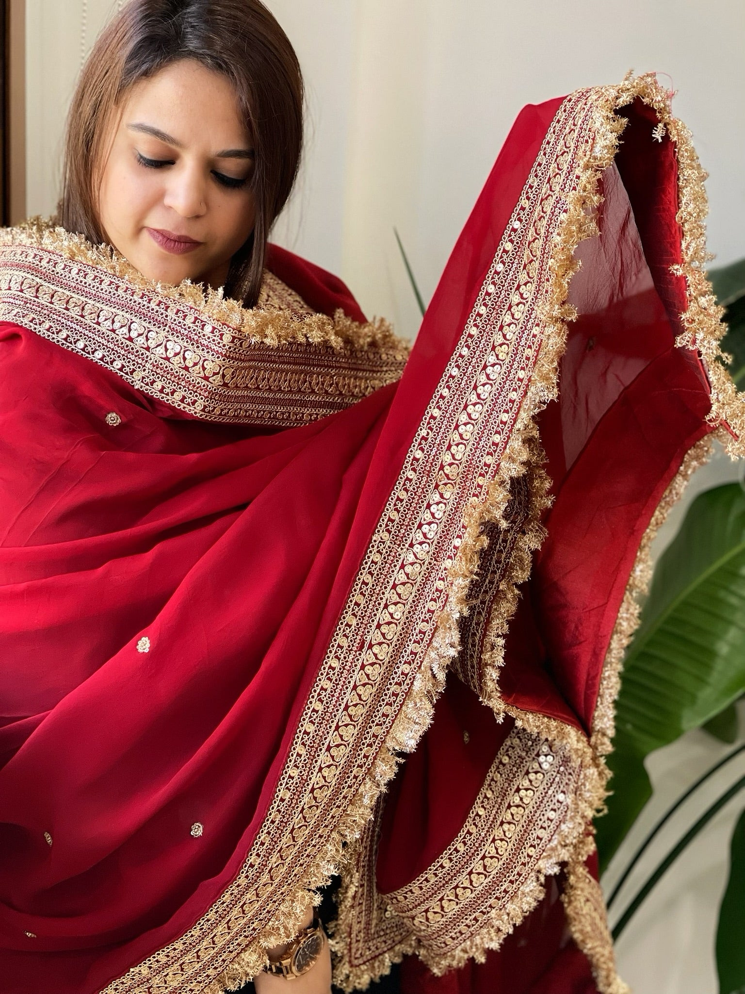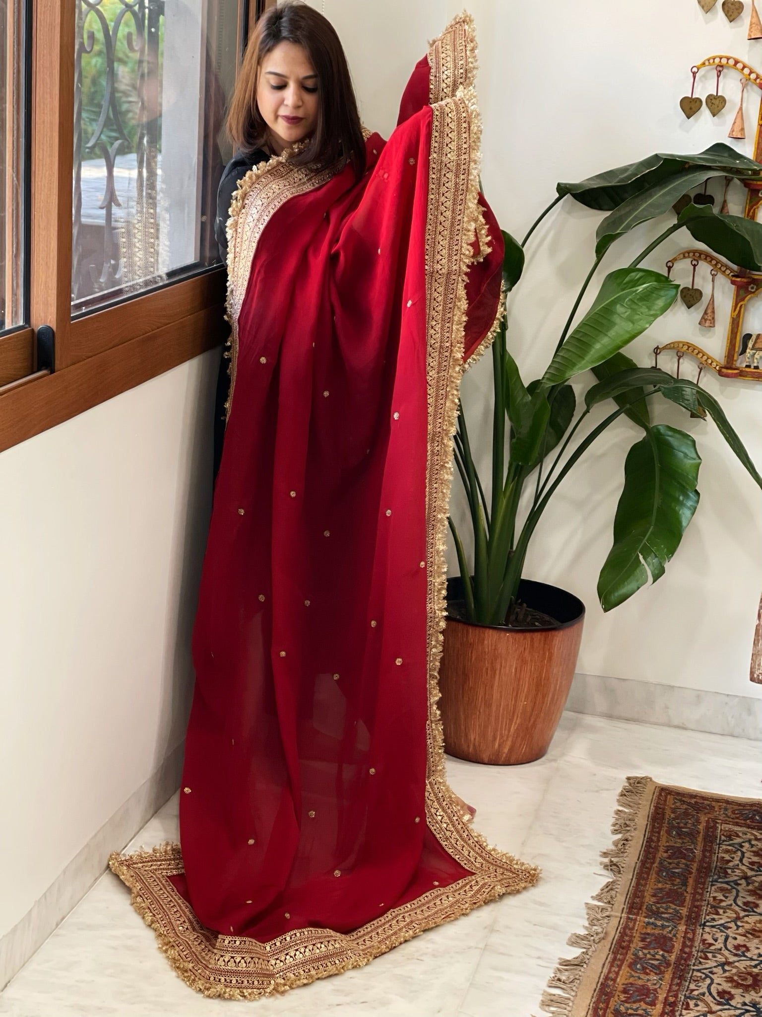 Elevate your festive wardrobe with this exquisite Chiffon Georgette Dupatta, featuring sequin buta embellishments that catch the light beautifully. The intricately heavy embroidered border adds a regal touch, making it ideal for special occasions. Crafted from lightweight georgette chiffon, it ensures graceful drape and comfort while enhancing any traditional ensemble with sophistication and charm.