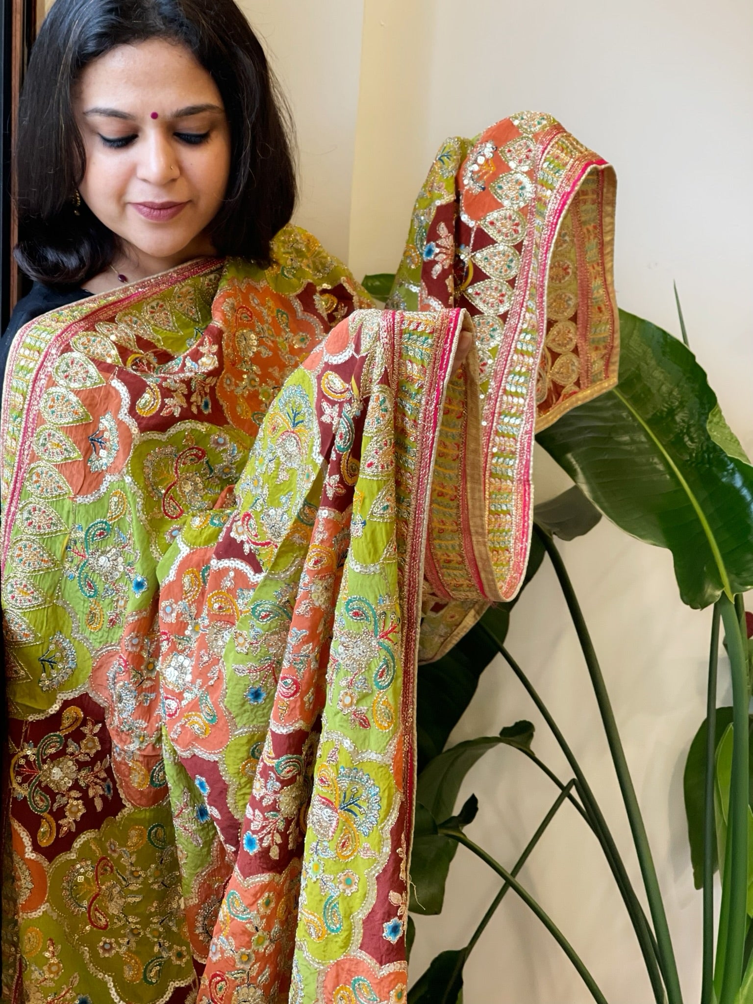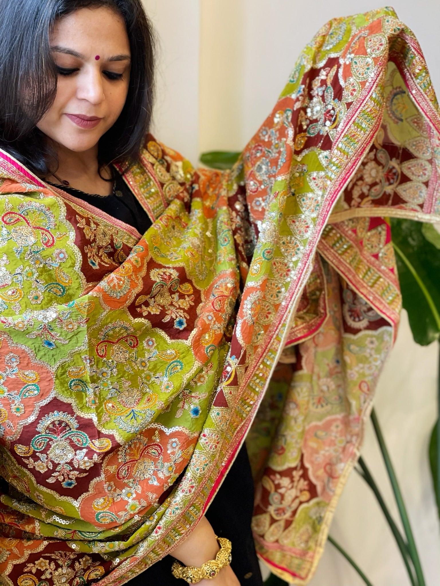 Green, Orange, Brown Chinon Dupatta with Gold Thread & Aari Embroidery