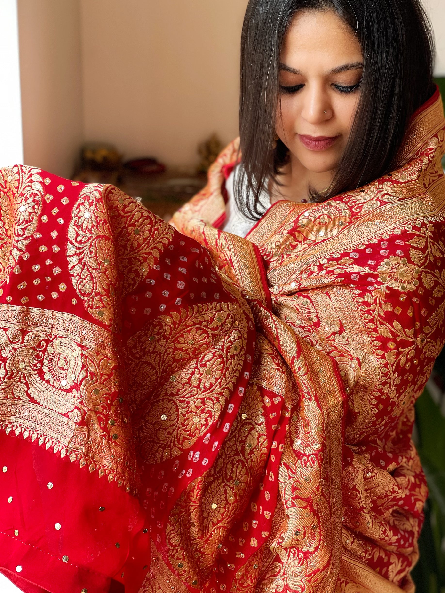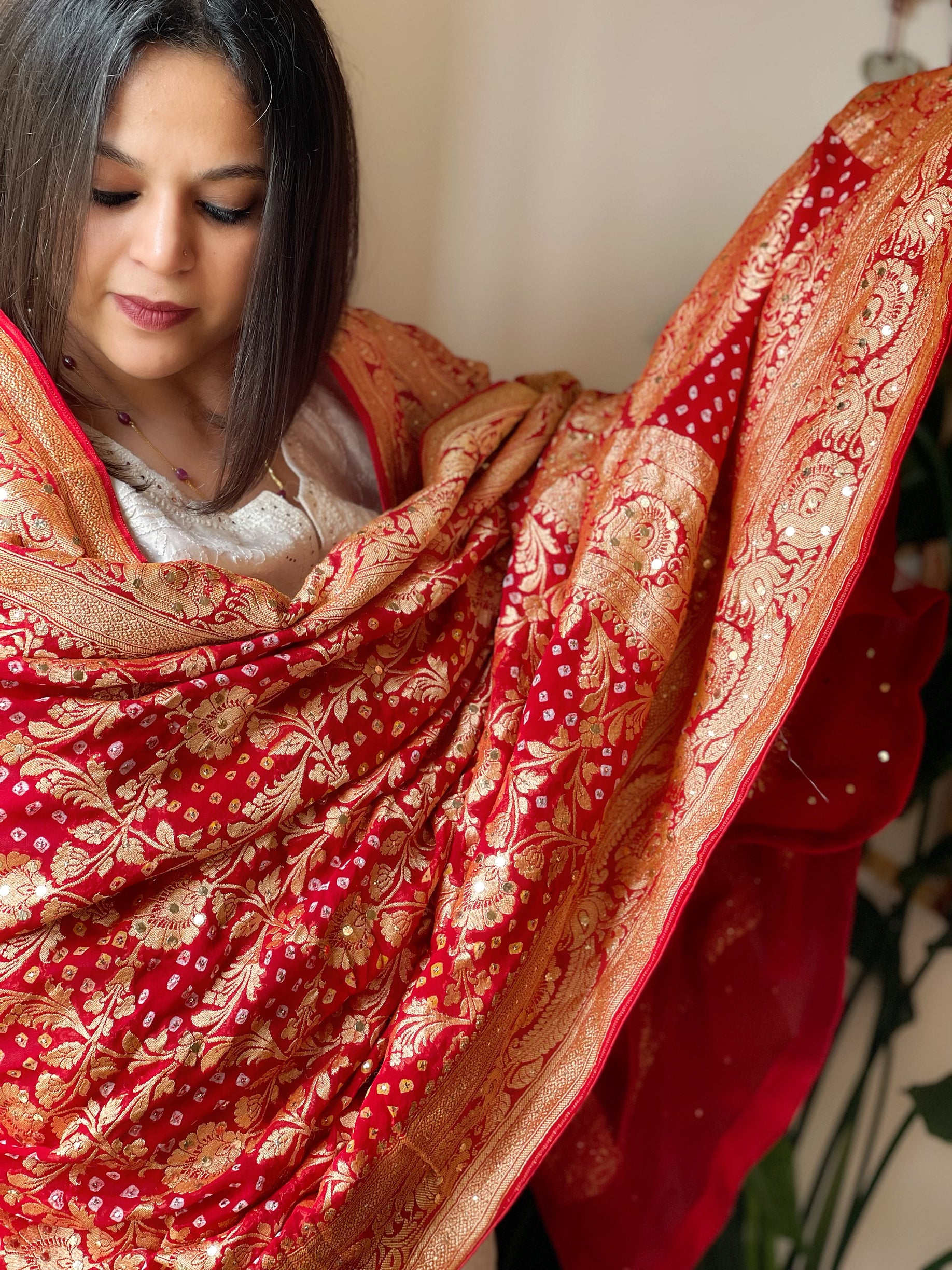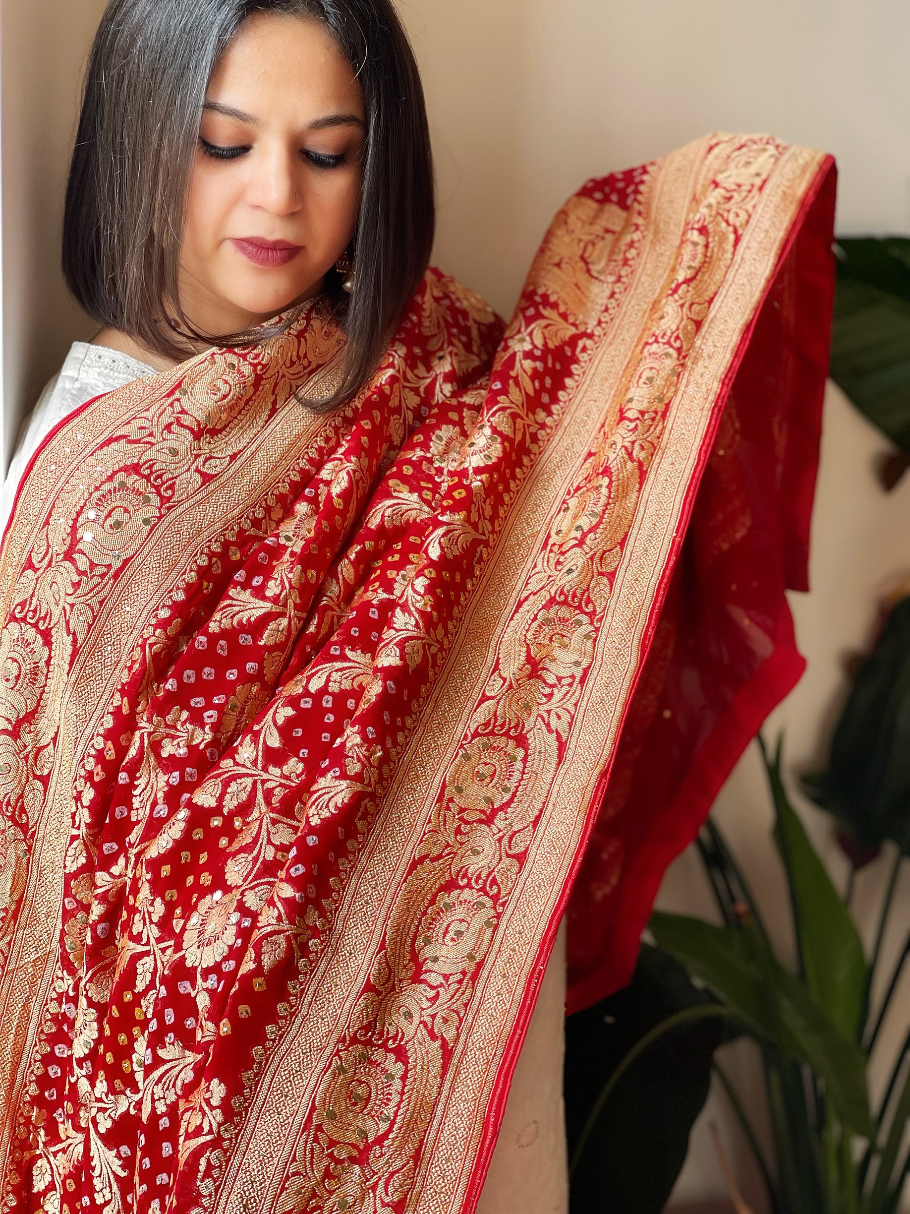 Expertly handwoven with pure georgette fabric, this Neemzari Bandhani Dupatta showcases exquisite bareek bandhani craftsmanship and delicate mukaish handwork. Elevate your wardrobe with this timeless accessory that exudes elegance and sophistication.