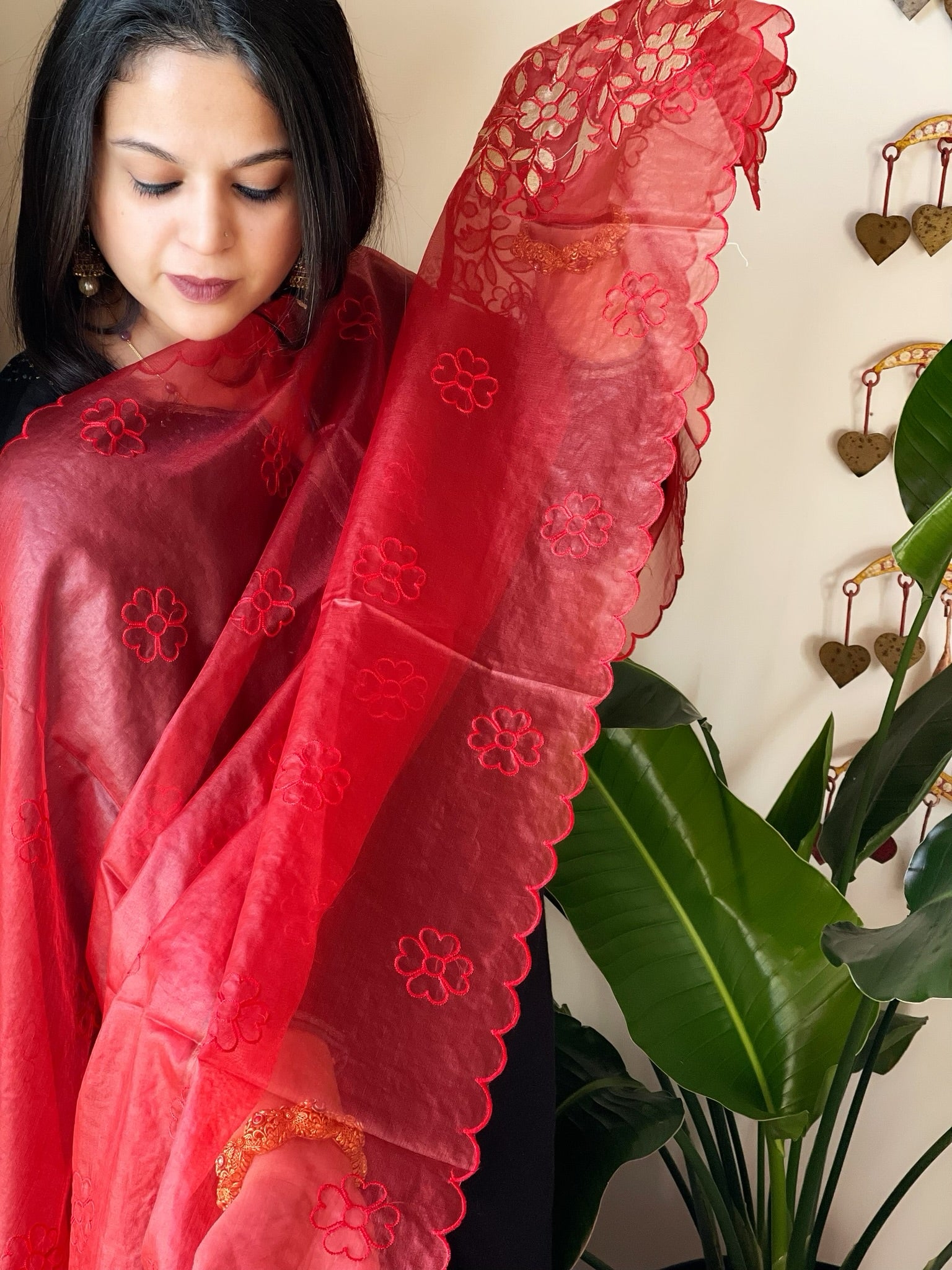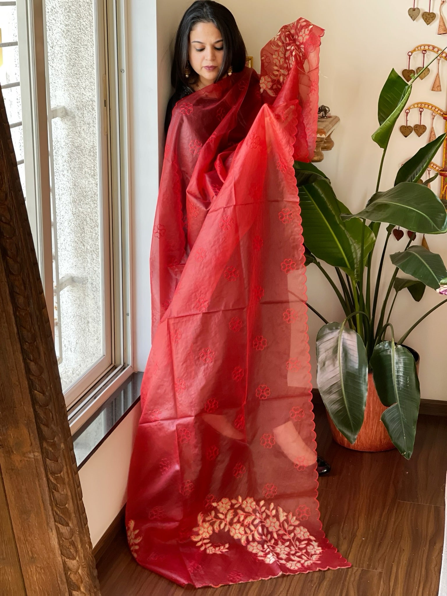 Red Organza dupatta with Applique Work