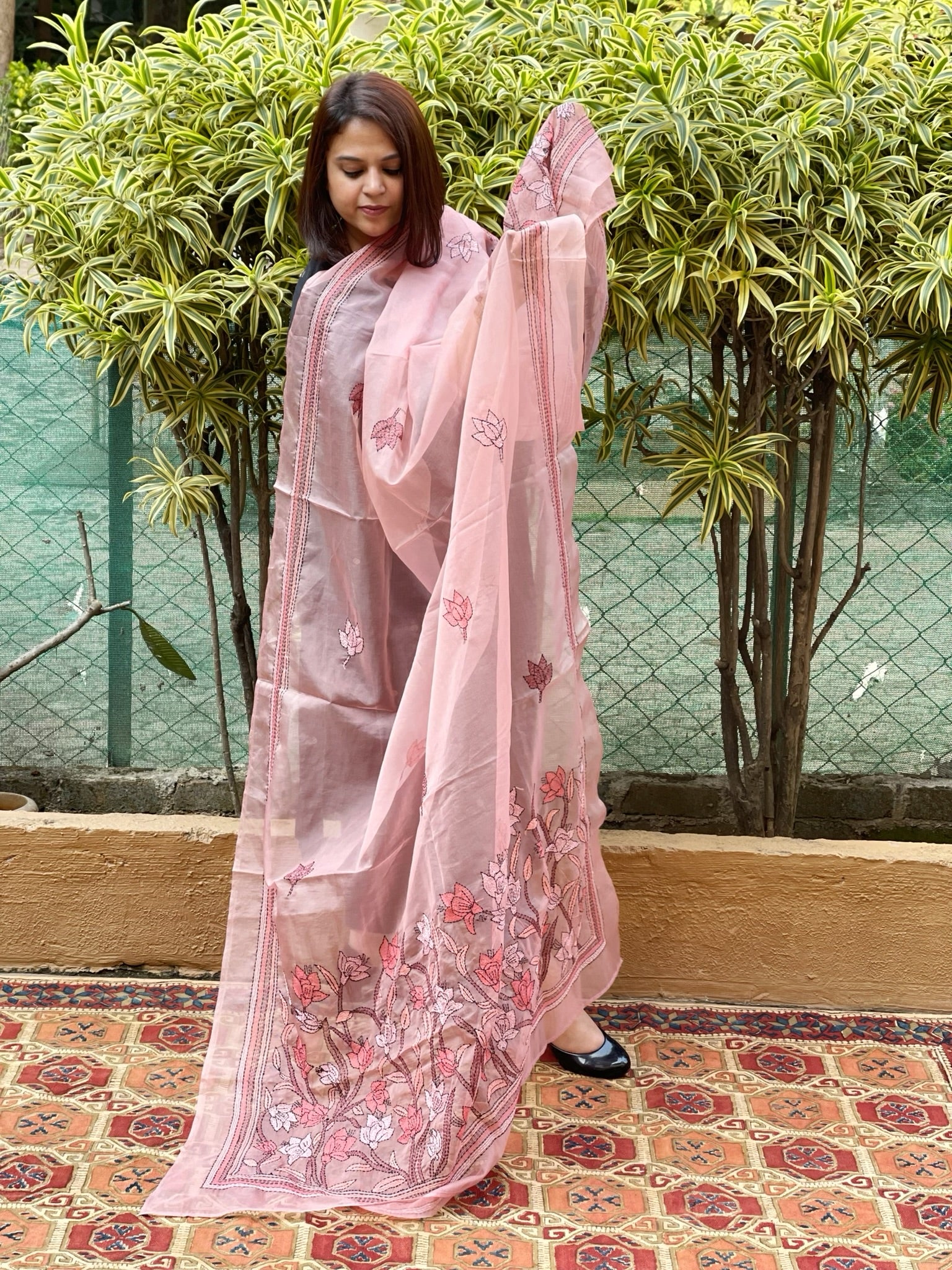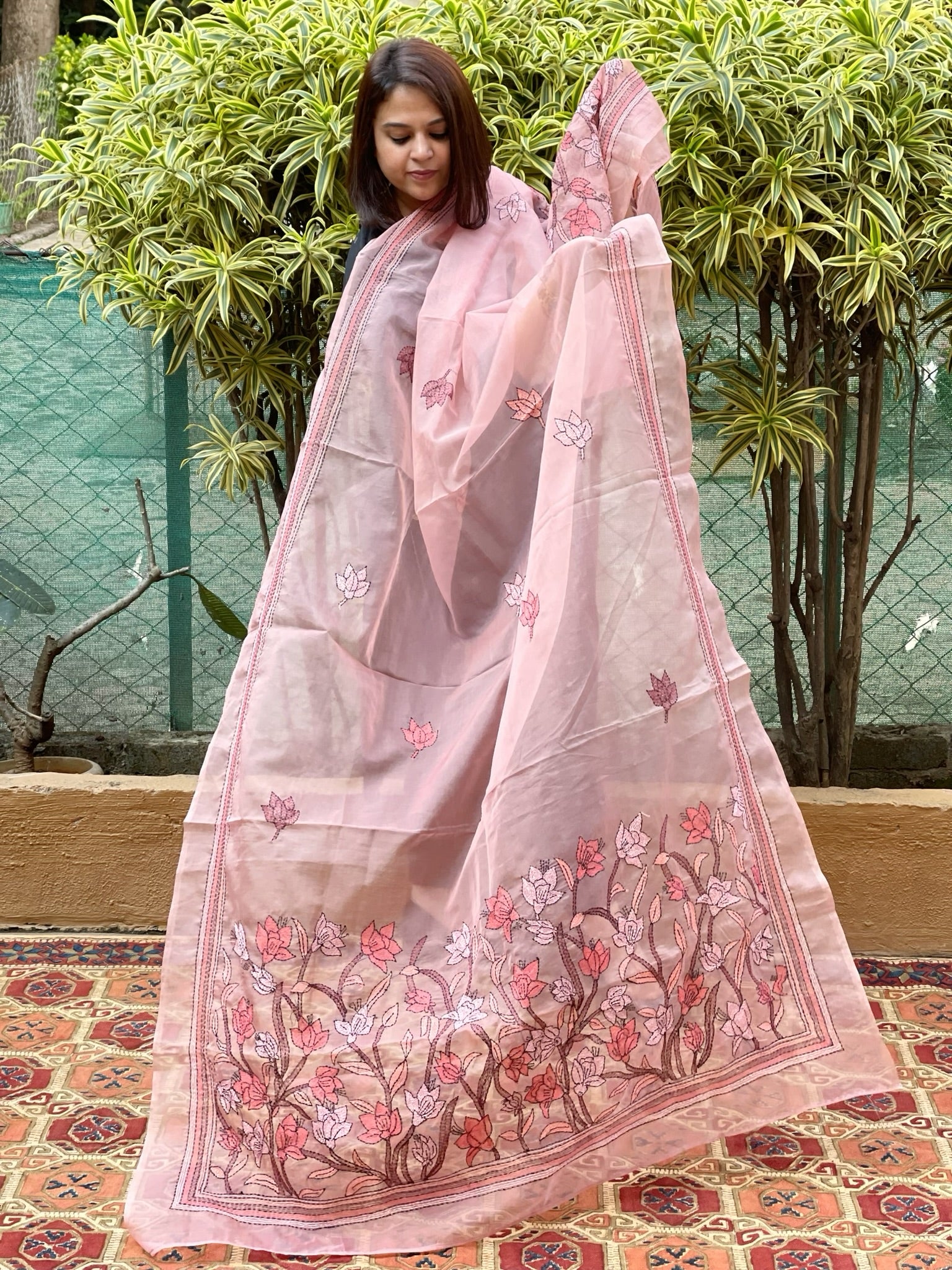 Pink Organza dupatta with Kantha Stitch Handwork