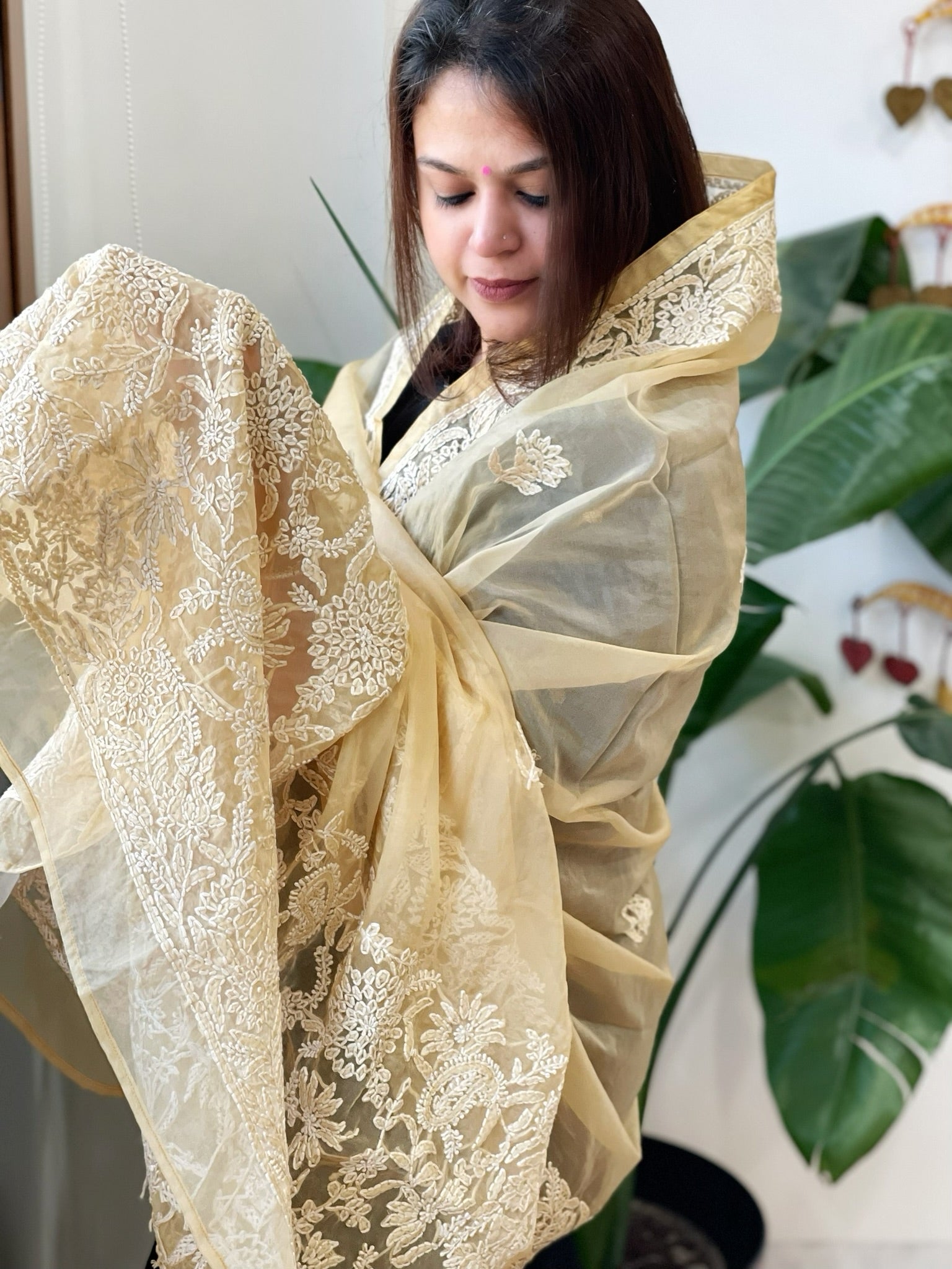 Elevate your ethnic ensemble with this exquisite organza dupatta, meticulously crafted with traditional Lucknowi stitch handwork. Perfect for weddings, festivals, or special occasions, this dupatta adds a refined touch to sarees and traditional wear. The handwoven detailing ensures every piece is uniquely authentic, making it a timeless addition to your wardrobe.