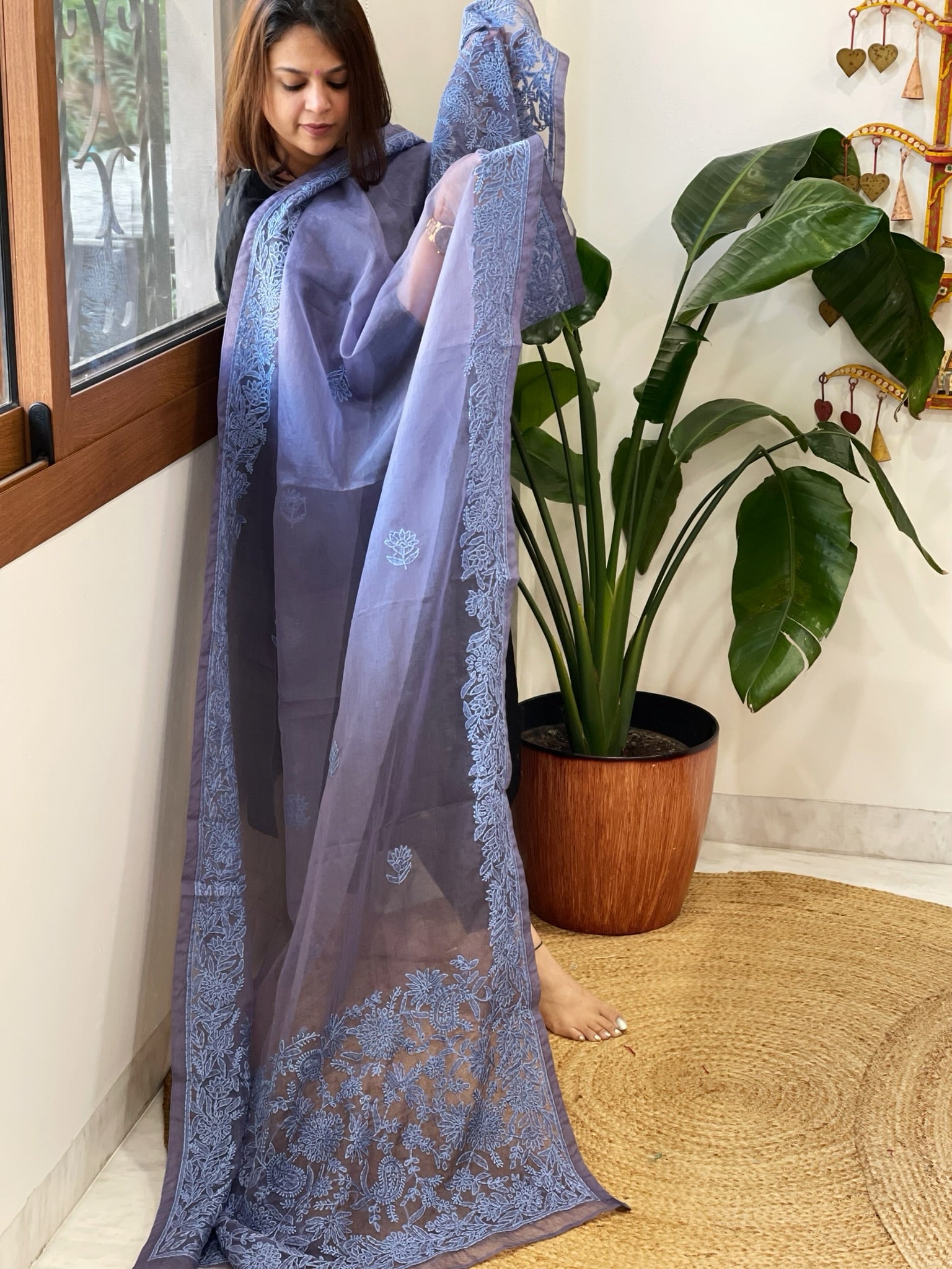 Elevate your ethnic ensemble with this exquisite organza dupatta, meticulously crafted with traditional Lucknowi stitch handwork. Perfect for weddings, festivals, or special occasions, this dupatta adds a refined touch to sarees and traditional wear. The handwoven detailing ensures every piece is uniquely authentic, making it a timeless addition to your wardrobe.