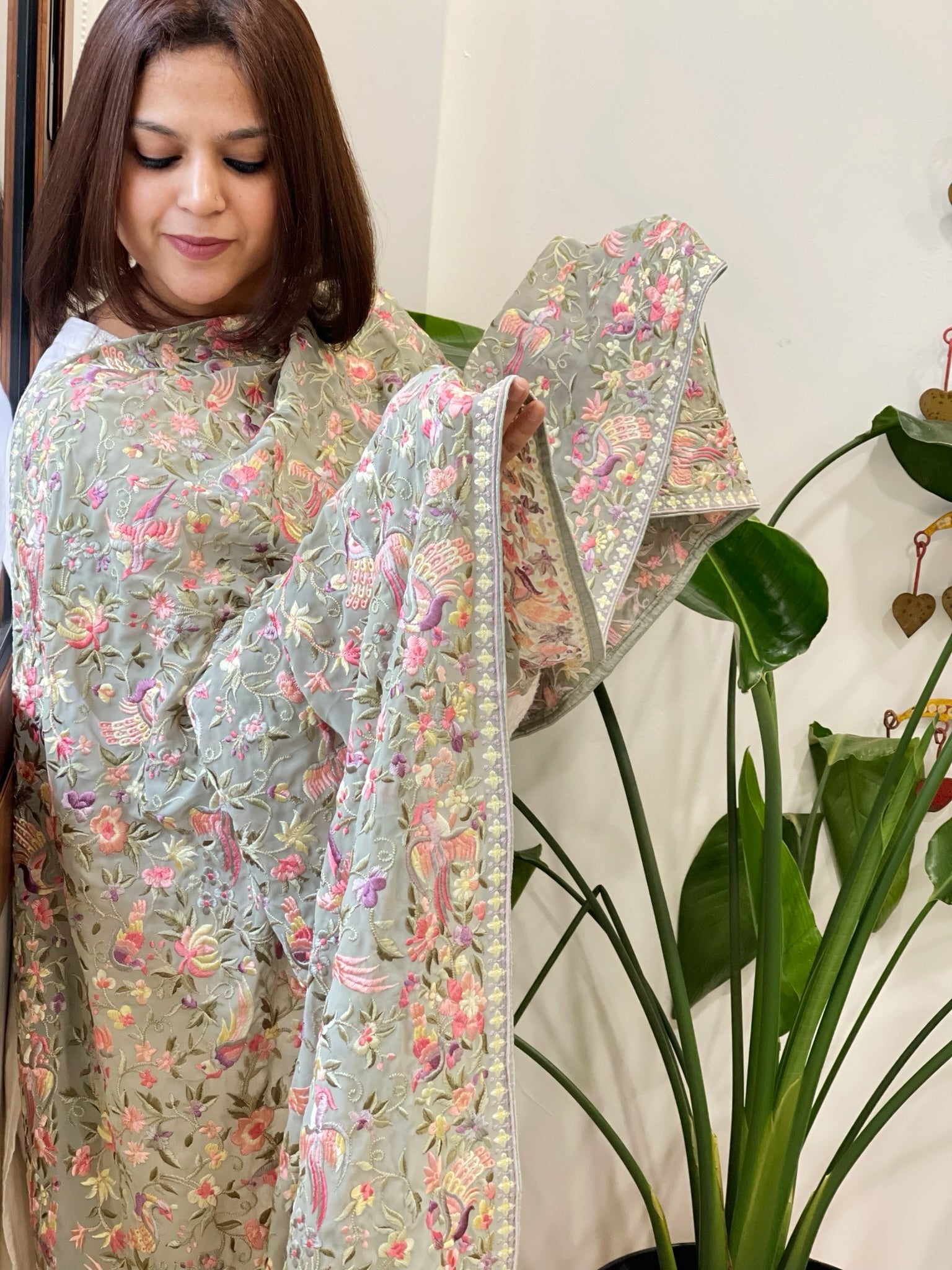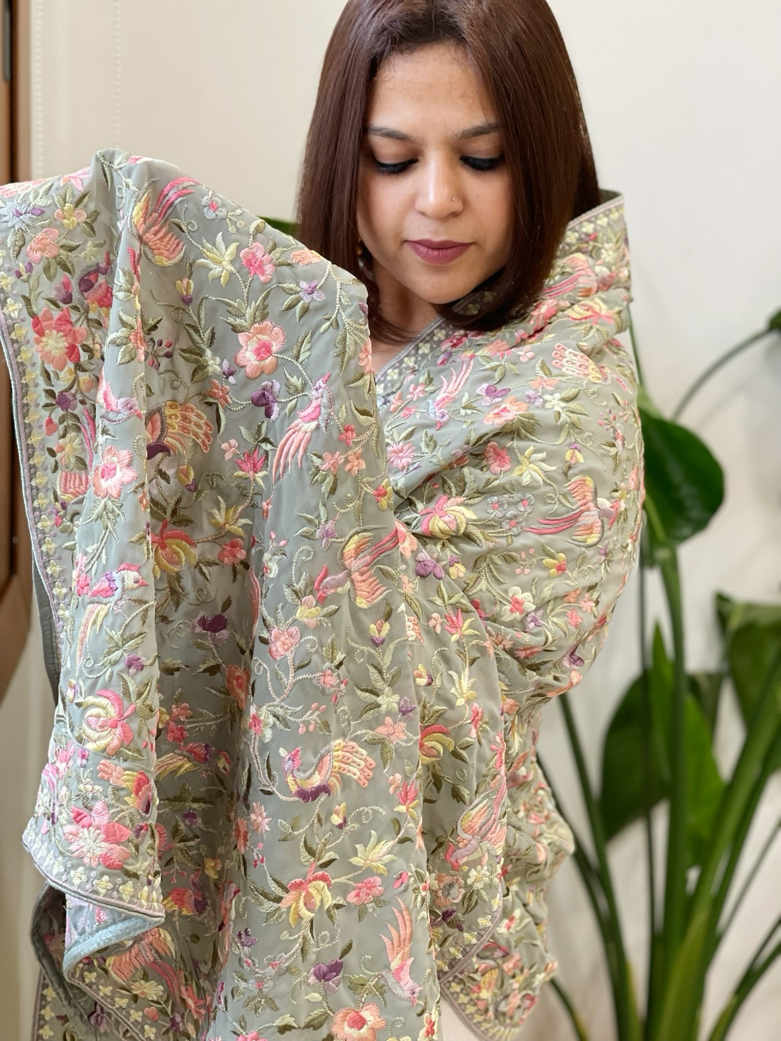 Grey Parsi Gara Embroidery Dupatta in Georgette