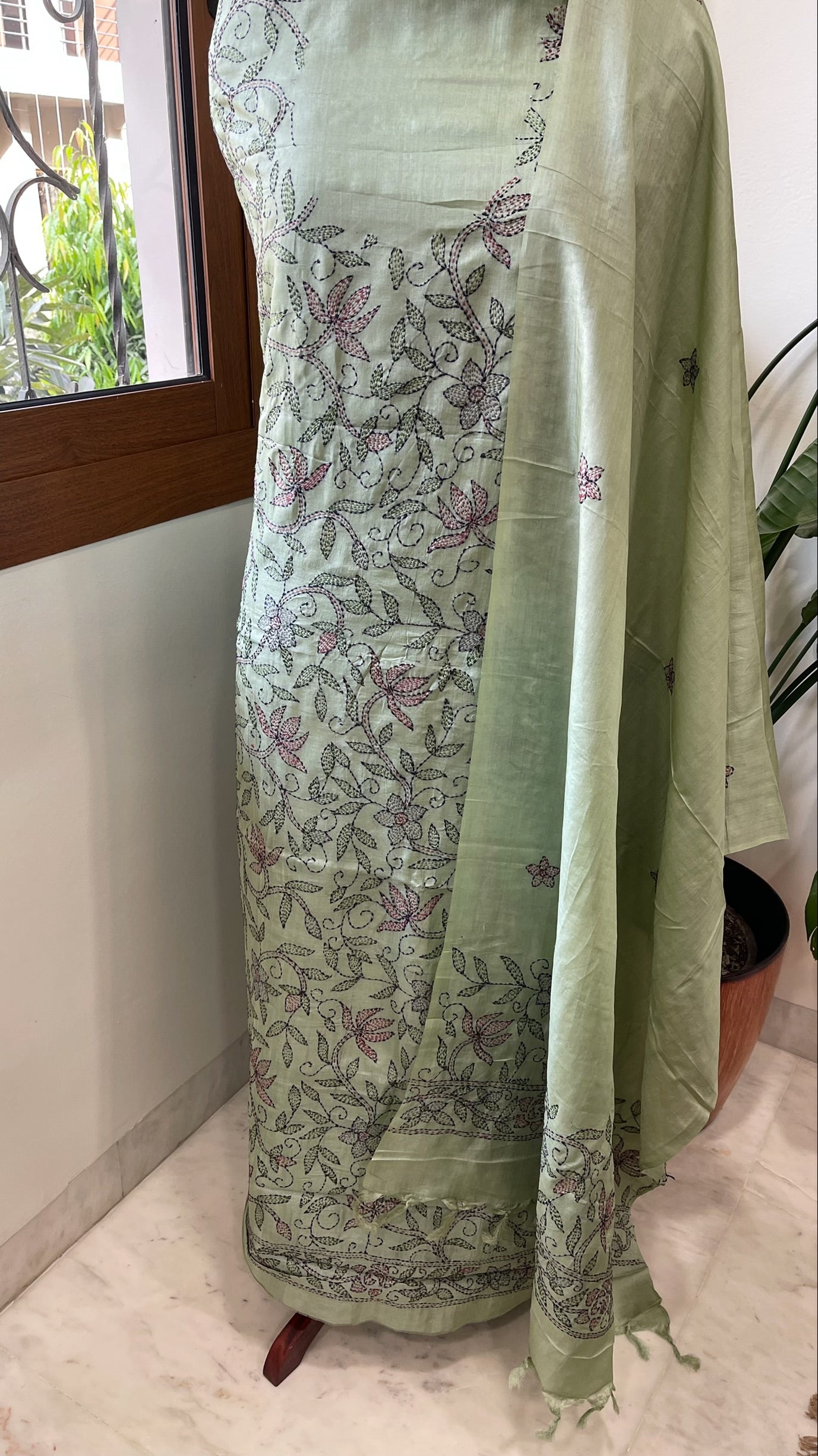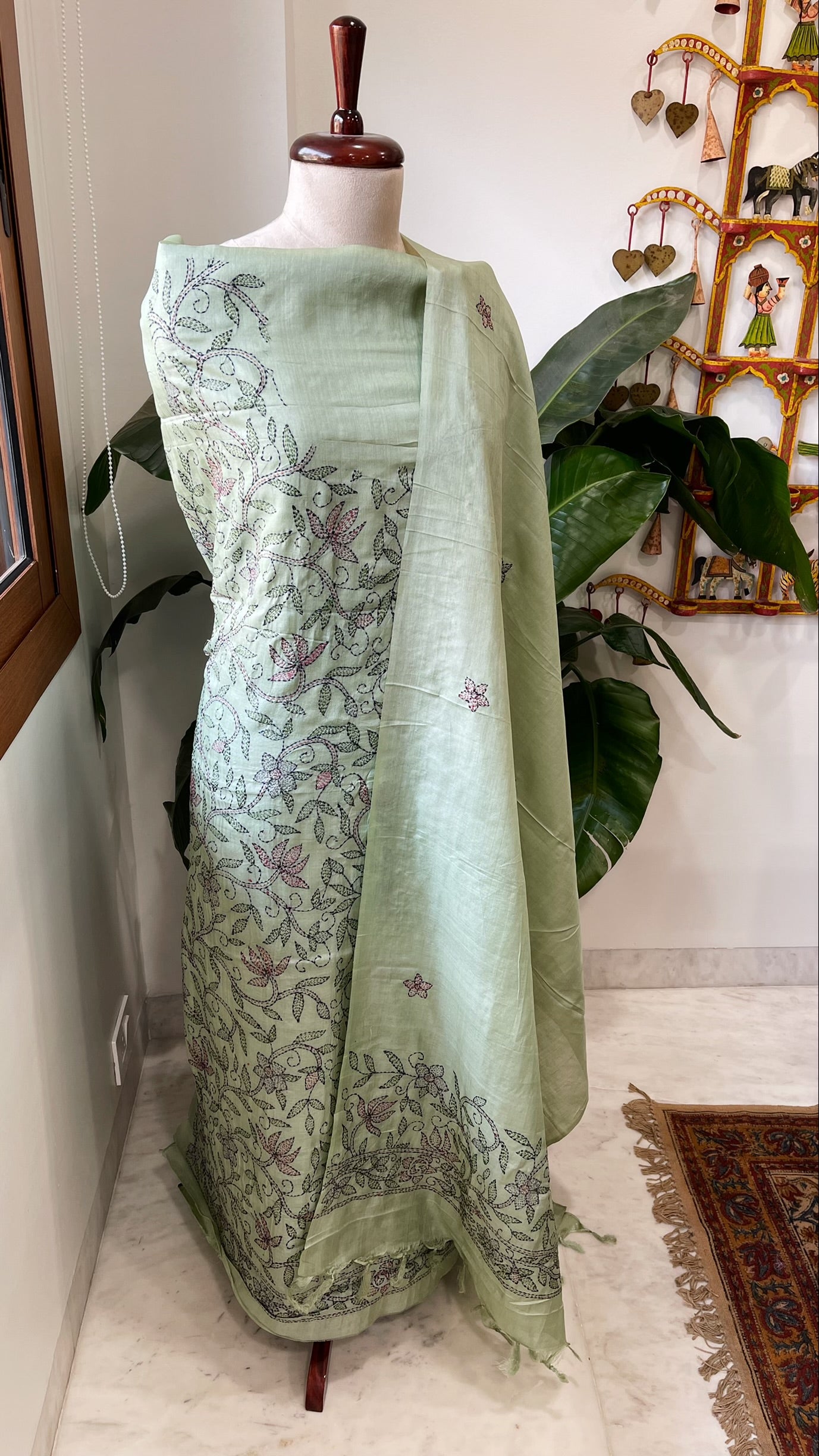 Experience the elegance of traditional craftsmanship with this exquisite 3-piece suit set featuring intricate Kantha handwork on pure tussar silk. Perfect for celebrations, this suit set offers a luxurious look that honors the Bengal heritage while ensuring you stand out with grace.