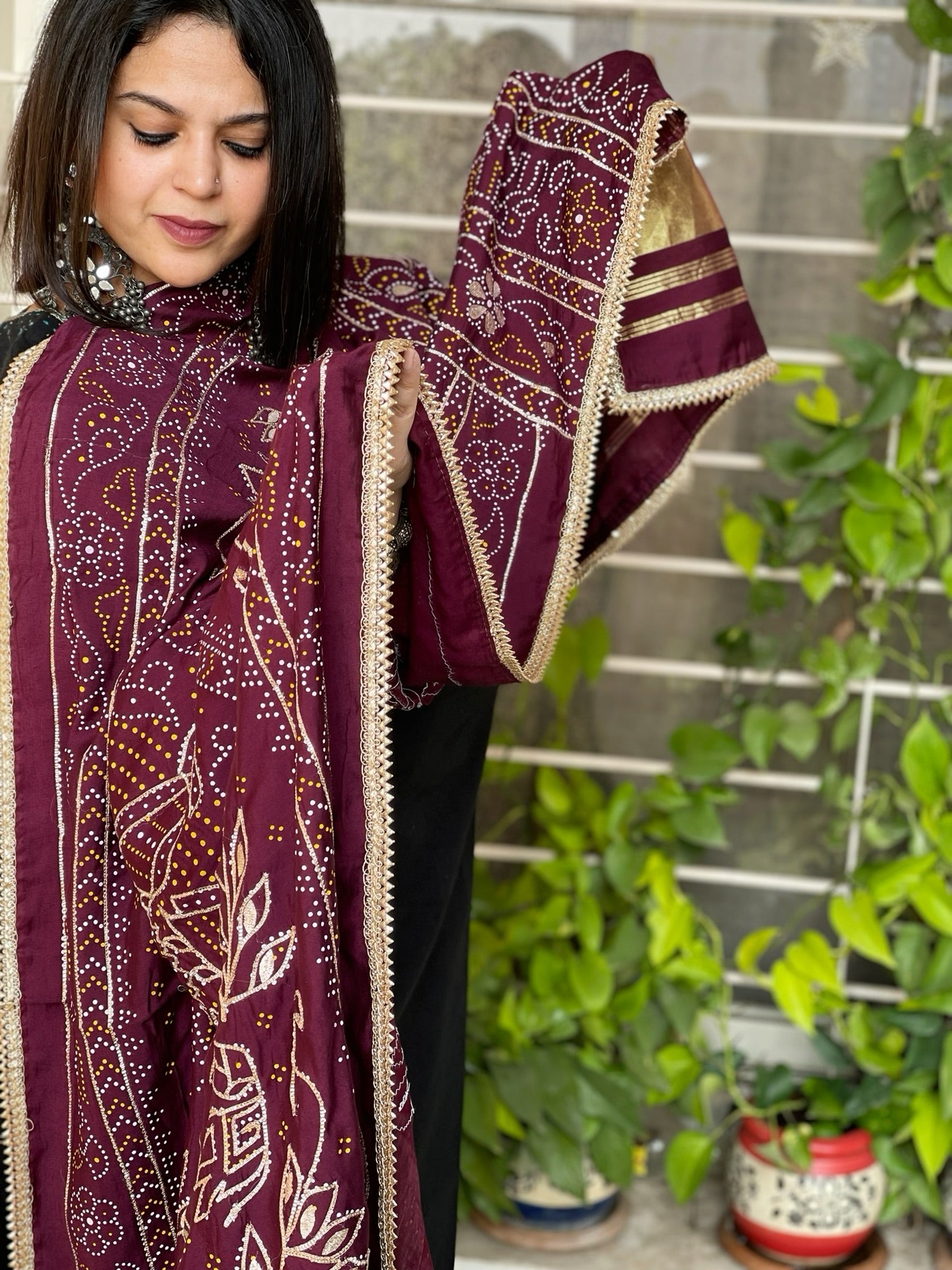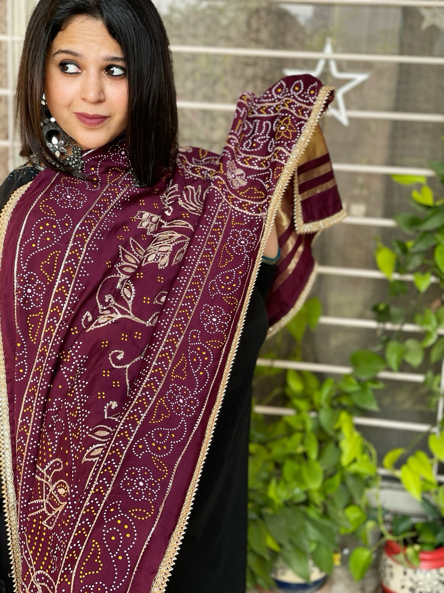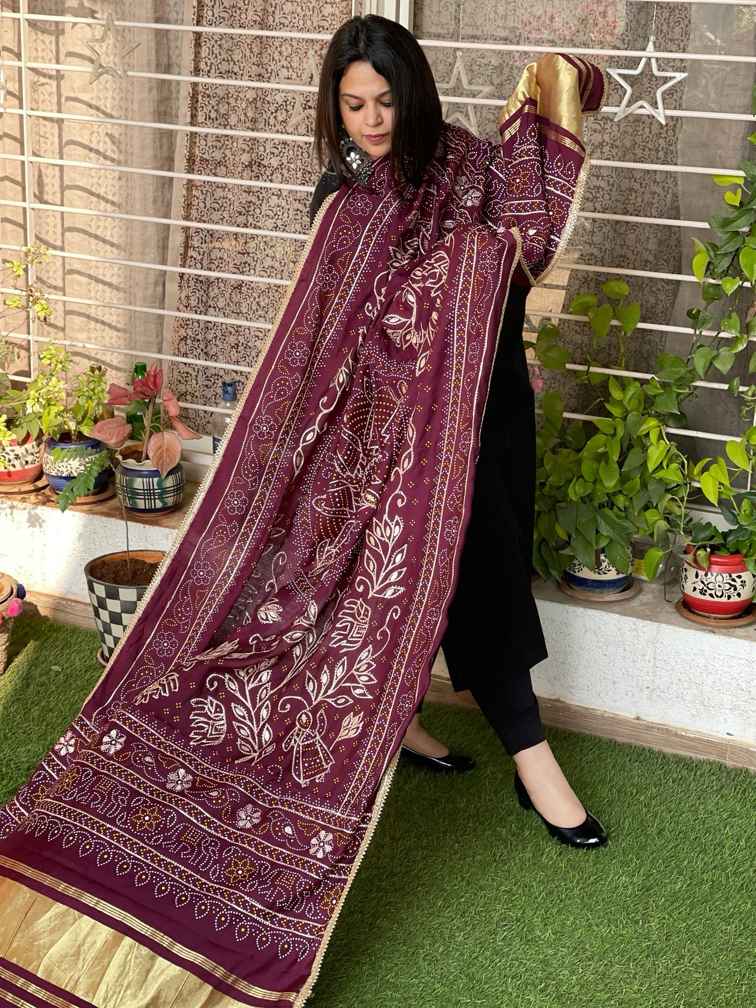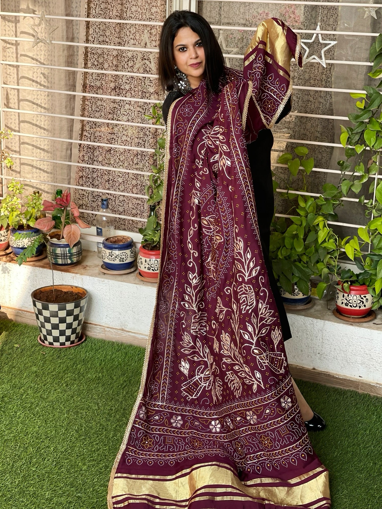 This printed bandhej dupatta features intricate gotapatti work, adding a touch of elegance to any outfit. Made with high-quality modal silk, it offers a soft and luxurious feel. Perfect for any occasion, this dupatta is a versatile accessory that effortlessly elevates your style.