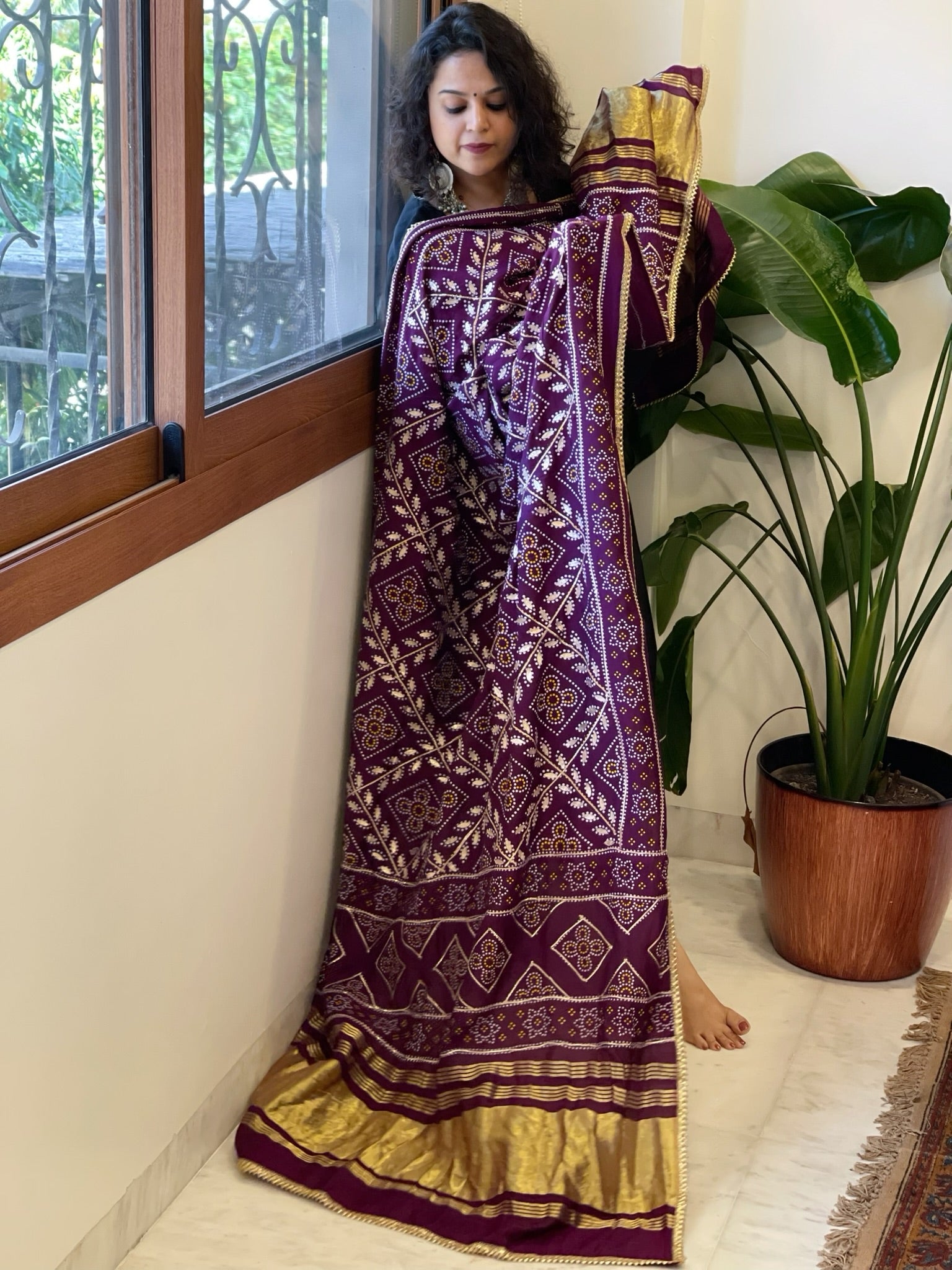 This printed bandhej dupatta features intricate leather gotapatti work, adding a touch of elegance to any outfit. Made with high-quality modal silk, it offers a soft and luxurious feel. Perfect for any occasion, this dupatta is a versatile accessory that effortlessly elevates your style.