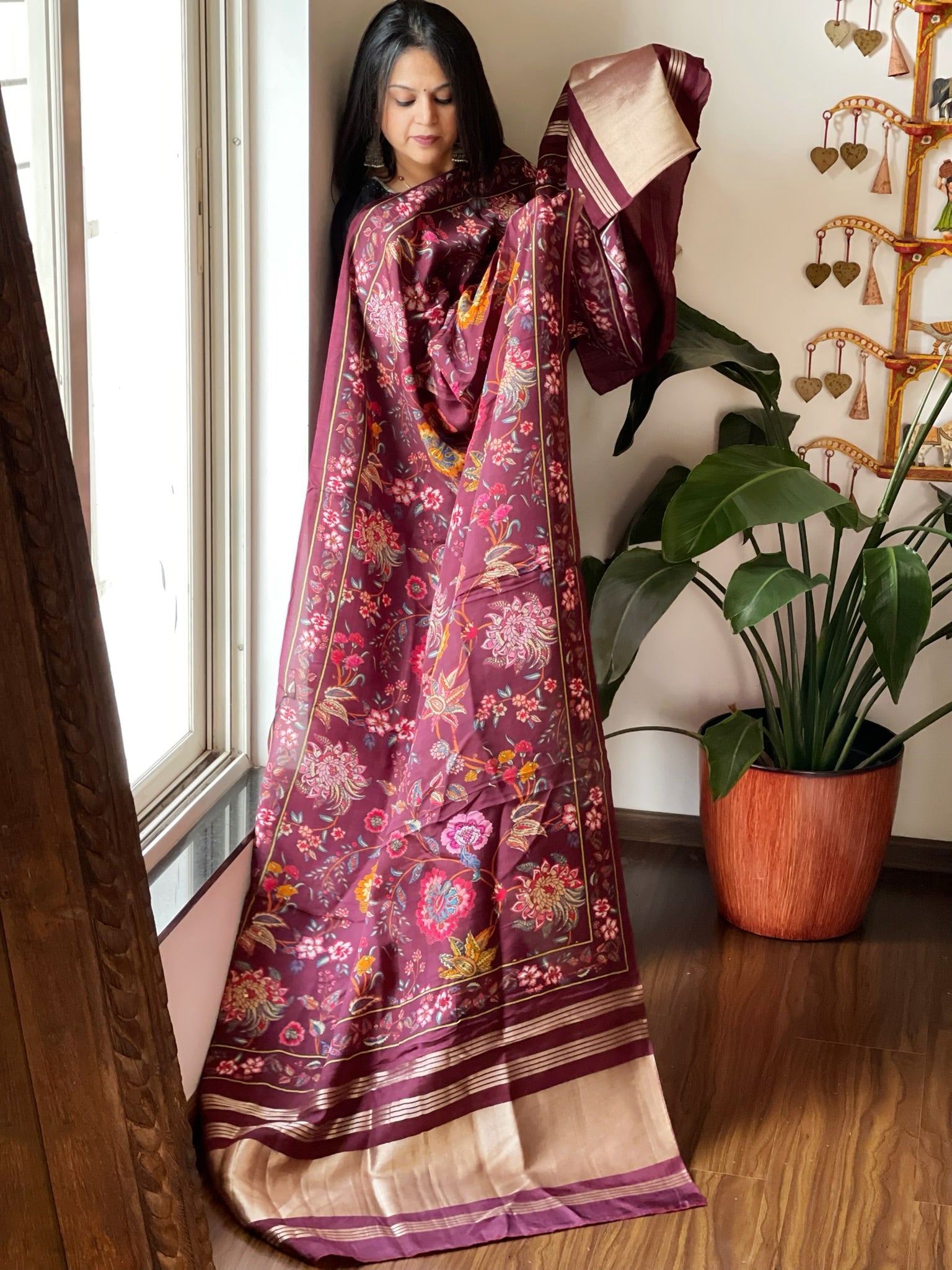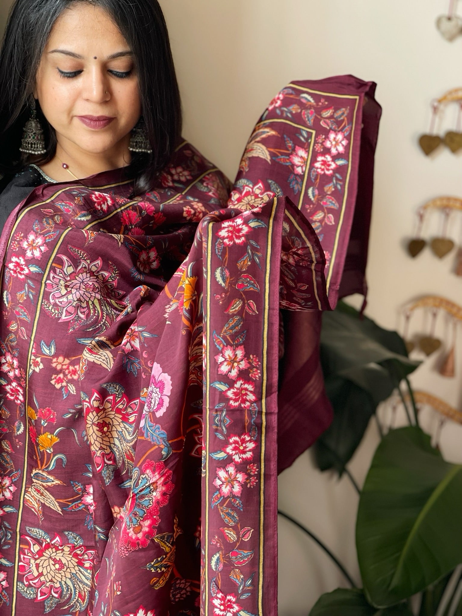 Experience the elegance and softness of our Printed Kalamkari Dupatta with Sequin Work and Zari Pallu in Dola Silk. Embrace the lightweight and smooth texture of this dupatta, featuring intricate sequin pasting and a rich zari pallu.