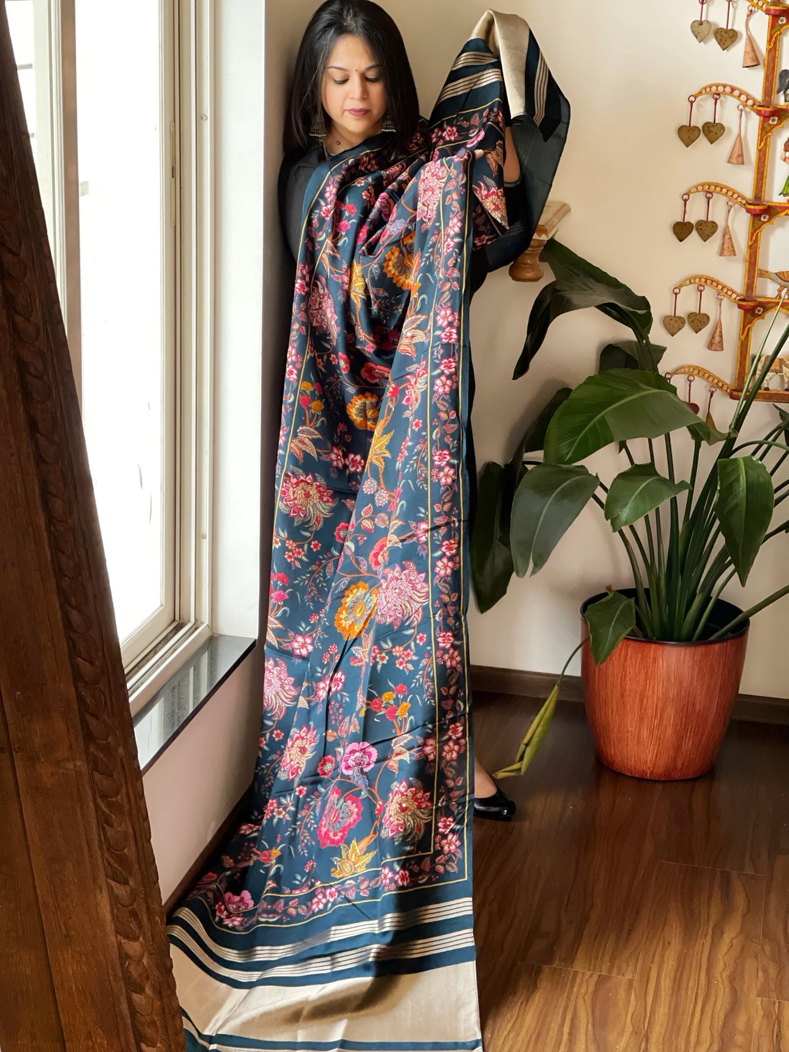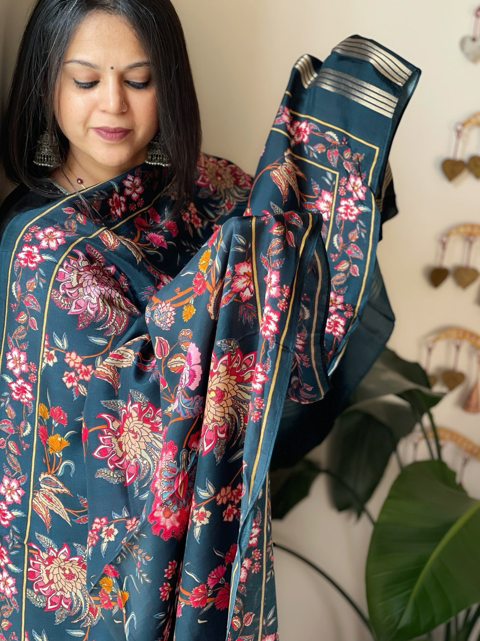 Teal Printed Kalamkari Dupatta with Sequin Work and Zari Pallu in Dola Silk