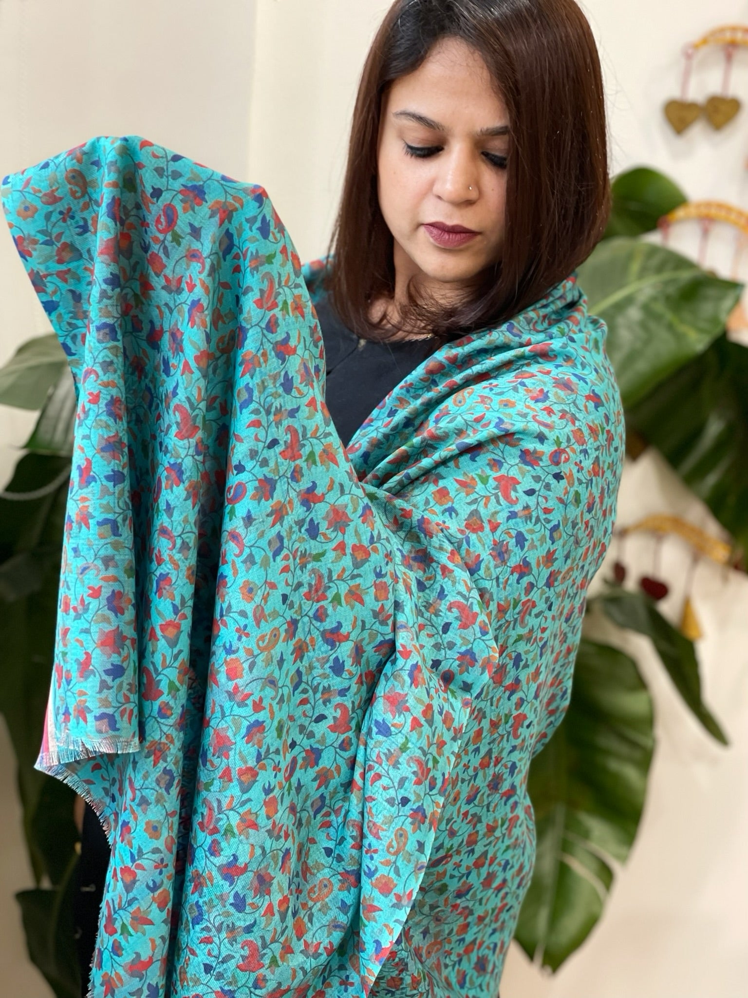 Turquoise Printed Reversible Kalamkari Stoles in Premium Wool