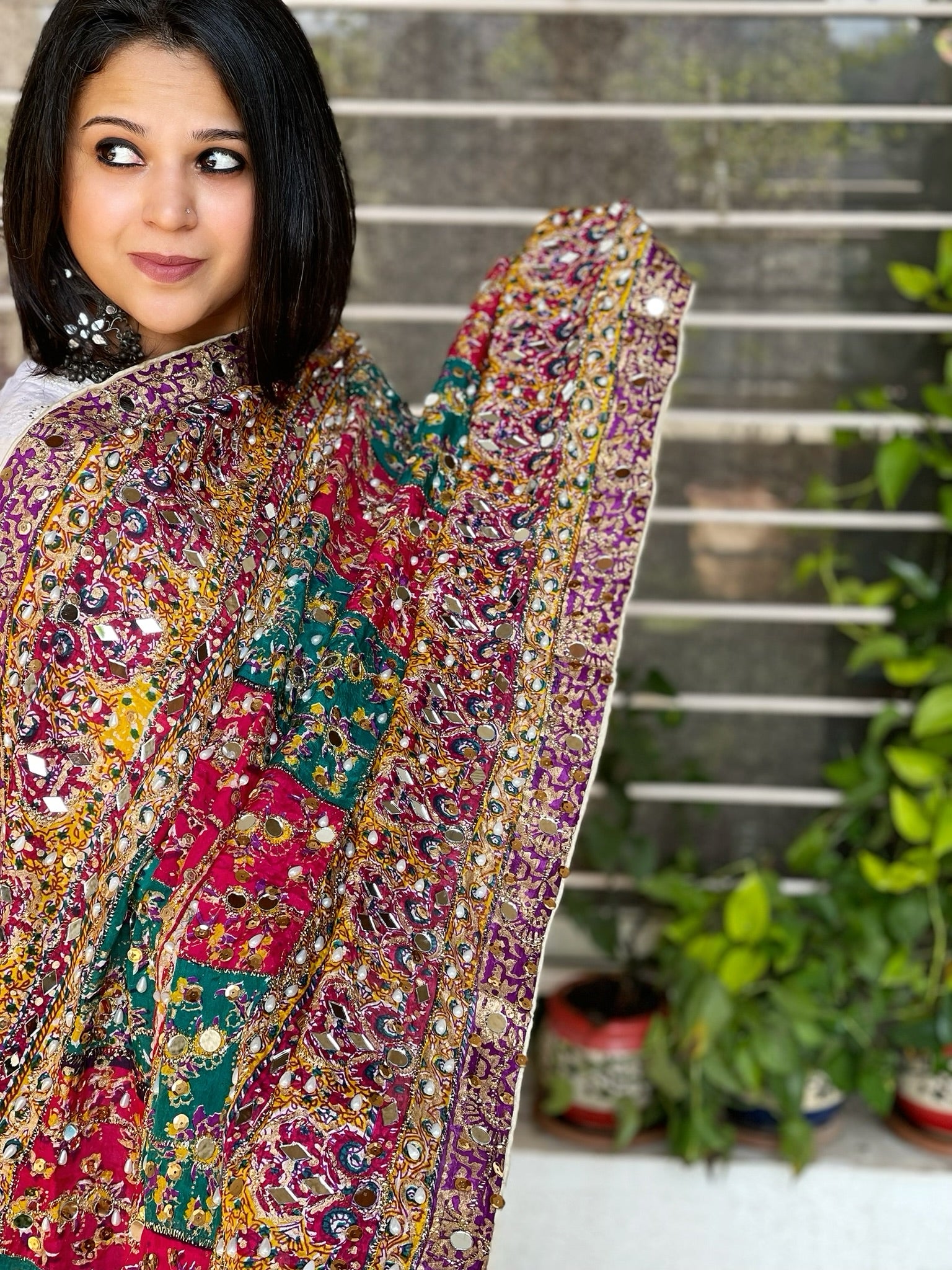 Due to extensive 'pasting' handwork of beads, sequins and real mirrors; the work may come off, with use. Since the work is extensive across the dupatta, the dupatta bling will stay. It will not be considered a defect since this is the nature of the craft.