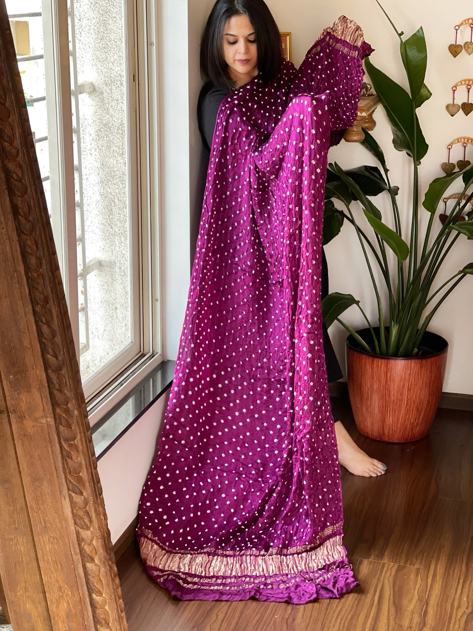 This stunning bandhani dupatta boasts a luxurious zari pallu in modal silk. Its vibrant colors and versatility make it a perfect addition to both office and occasion wear. Elevate your wardrobe with this elegant and stylish piece.