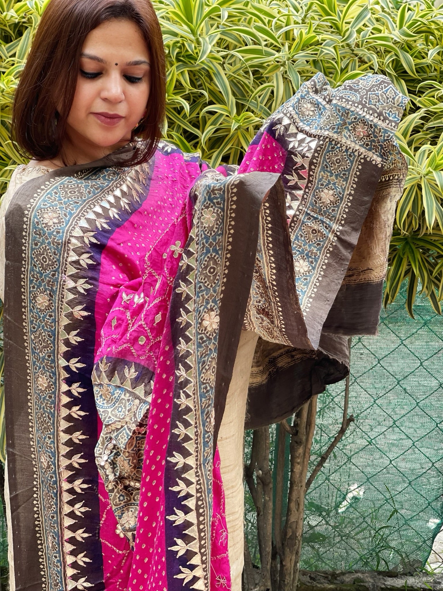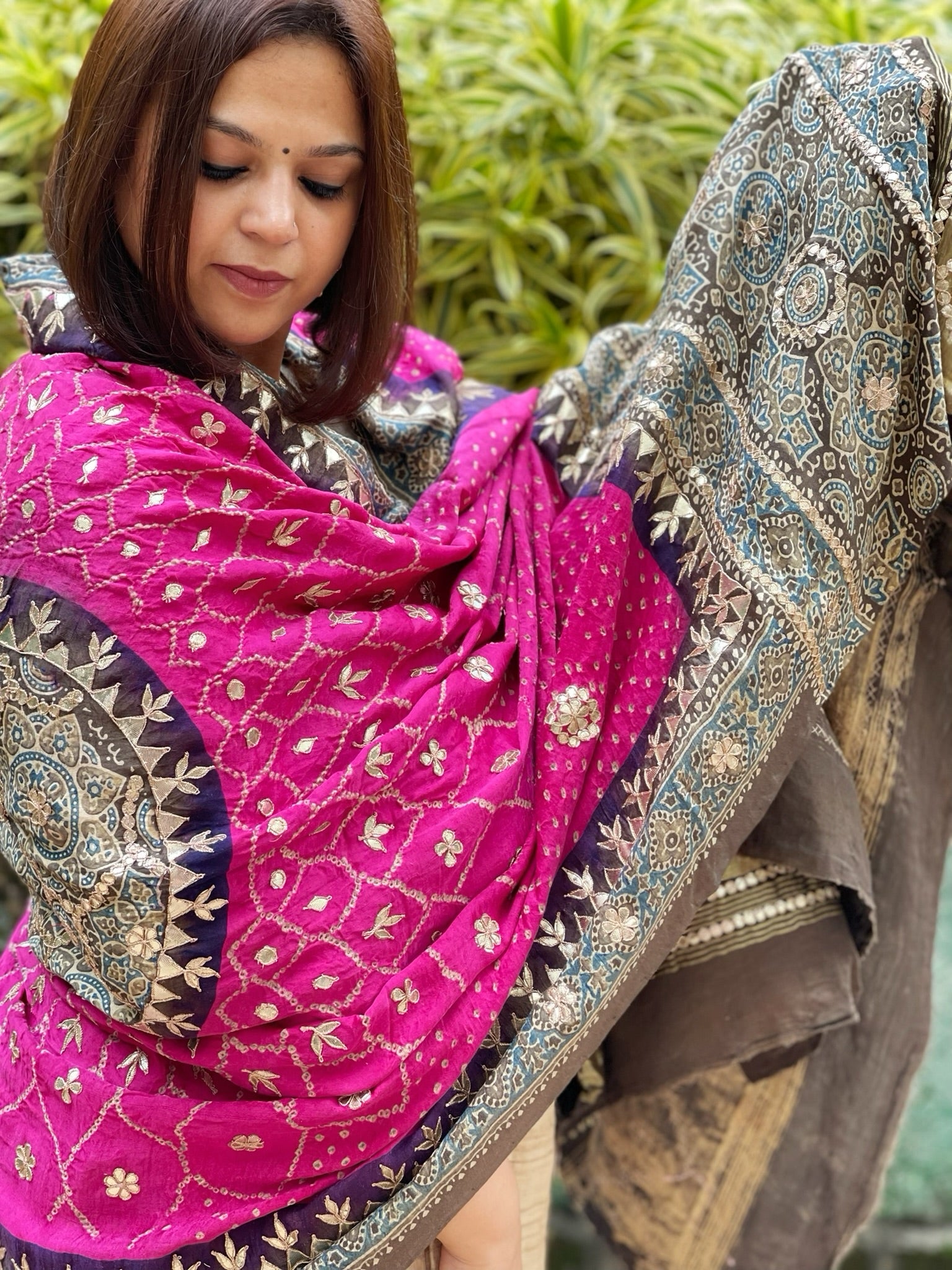 Pink Rai Bandhani, Ajrakh Dupatta with Gotapatti Handwork in Gajji Silk