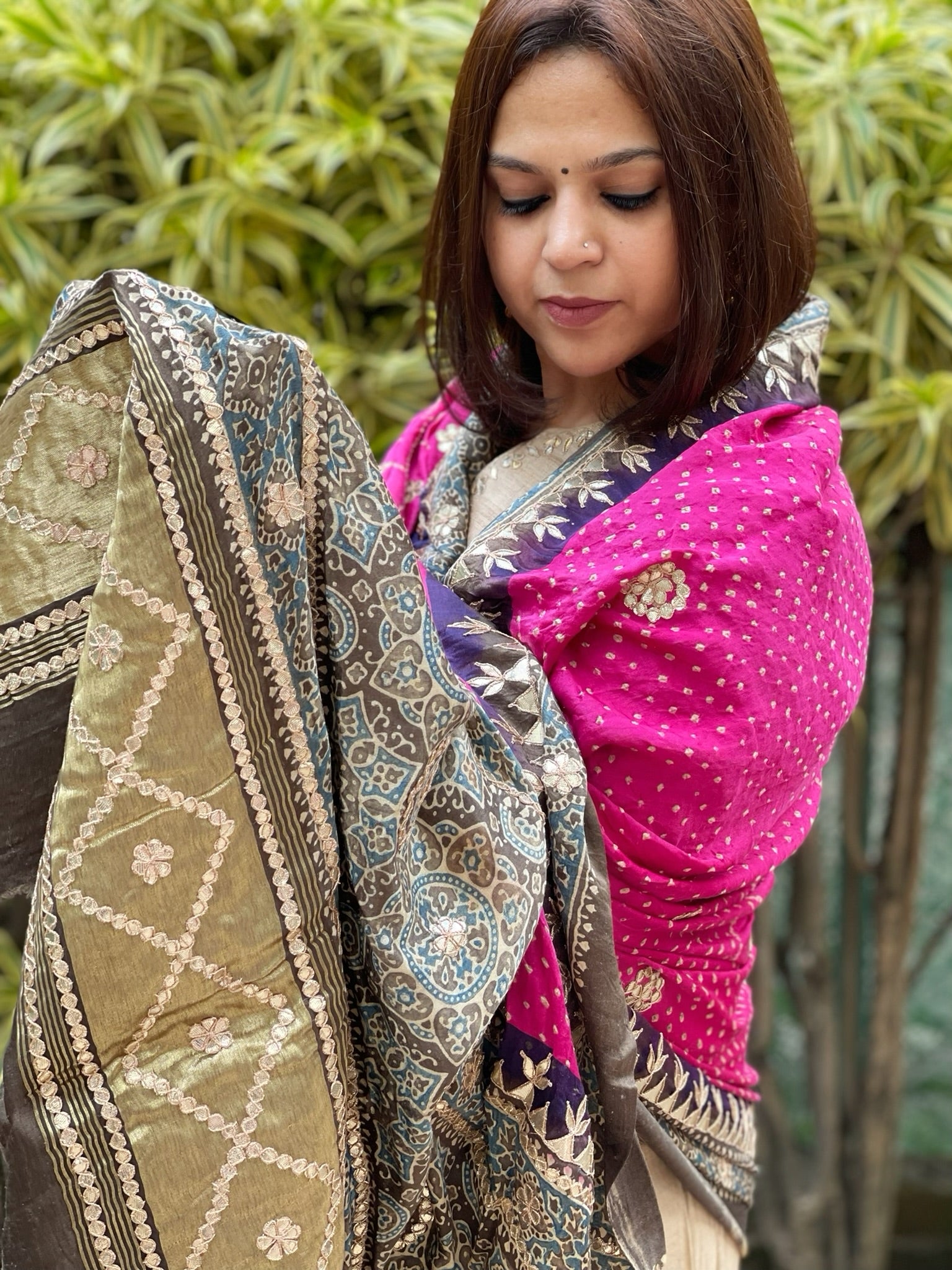 Elevate your style with our Handmade Rai Bandhej Dupatta. Made from Pure Gajji Silk, the Ajrakh Handblock printed pallu boasts exquisite craftsmanship. Complete with intricate Gotapatti handwork, this unique piece is perfect for special occasions.