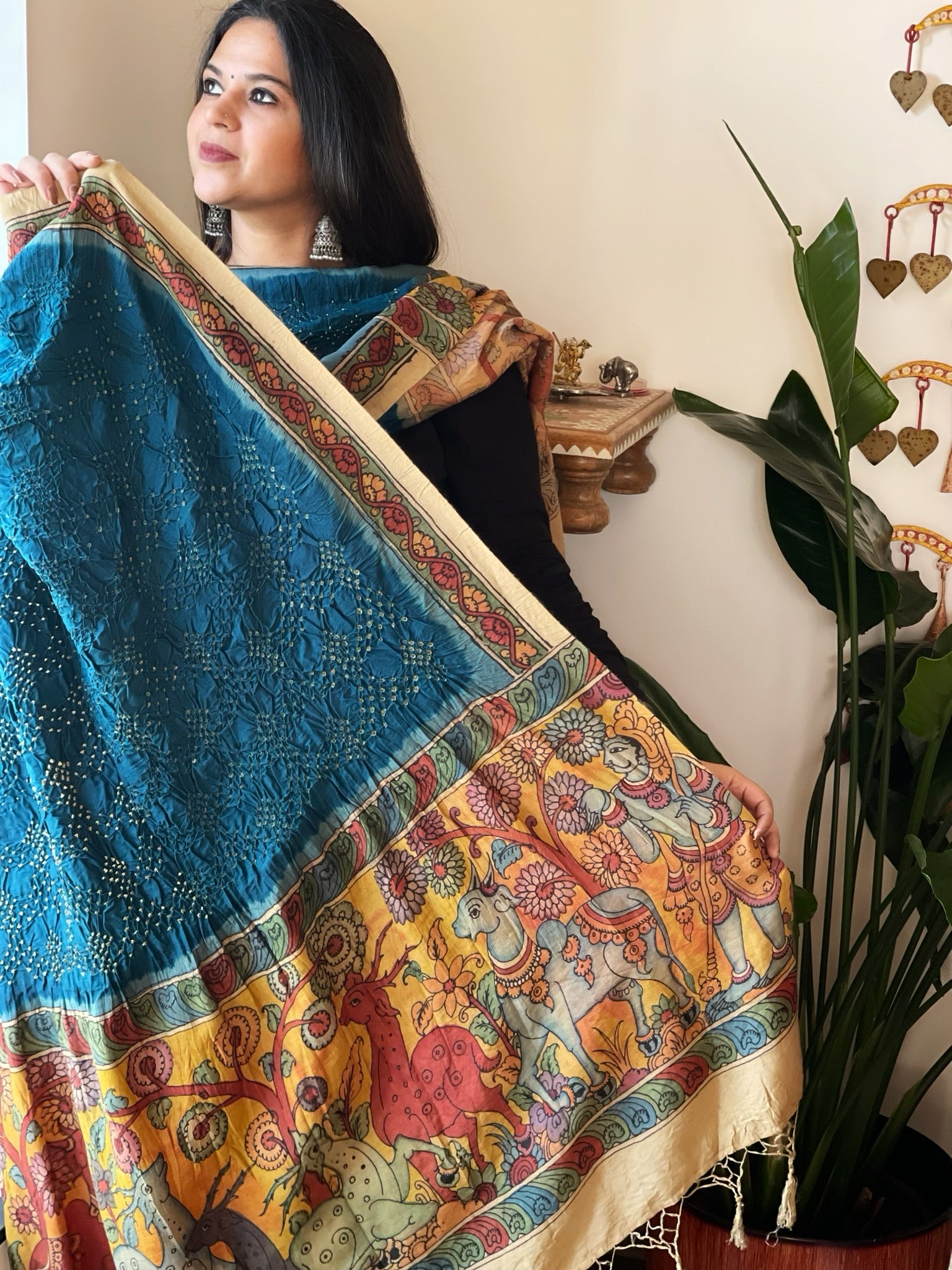 Infuse elegance and luxury into your wardrobe with our Rai Bandhej Dupatta. Crafted from pure Muga Silk, this stunning piece features a beautiful Kalamkari Pallu, showcasing the fusion of two exquisite art forms. Elevate any outfit with the gorgeous combination of traditional bandhani and handpainted Kalamkari.