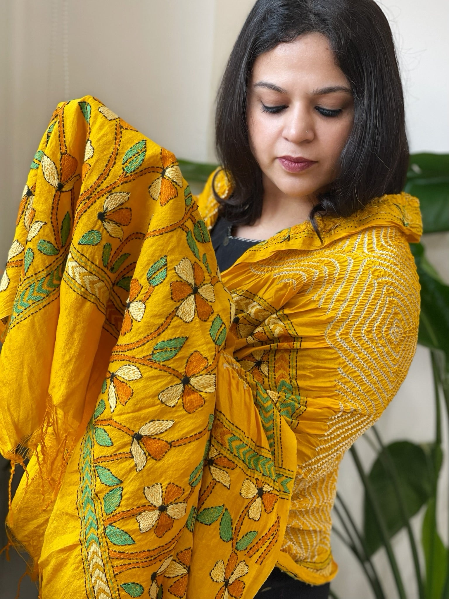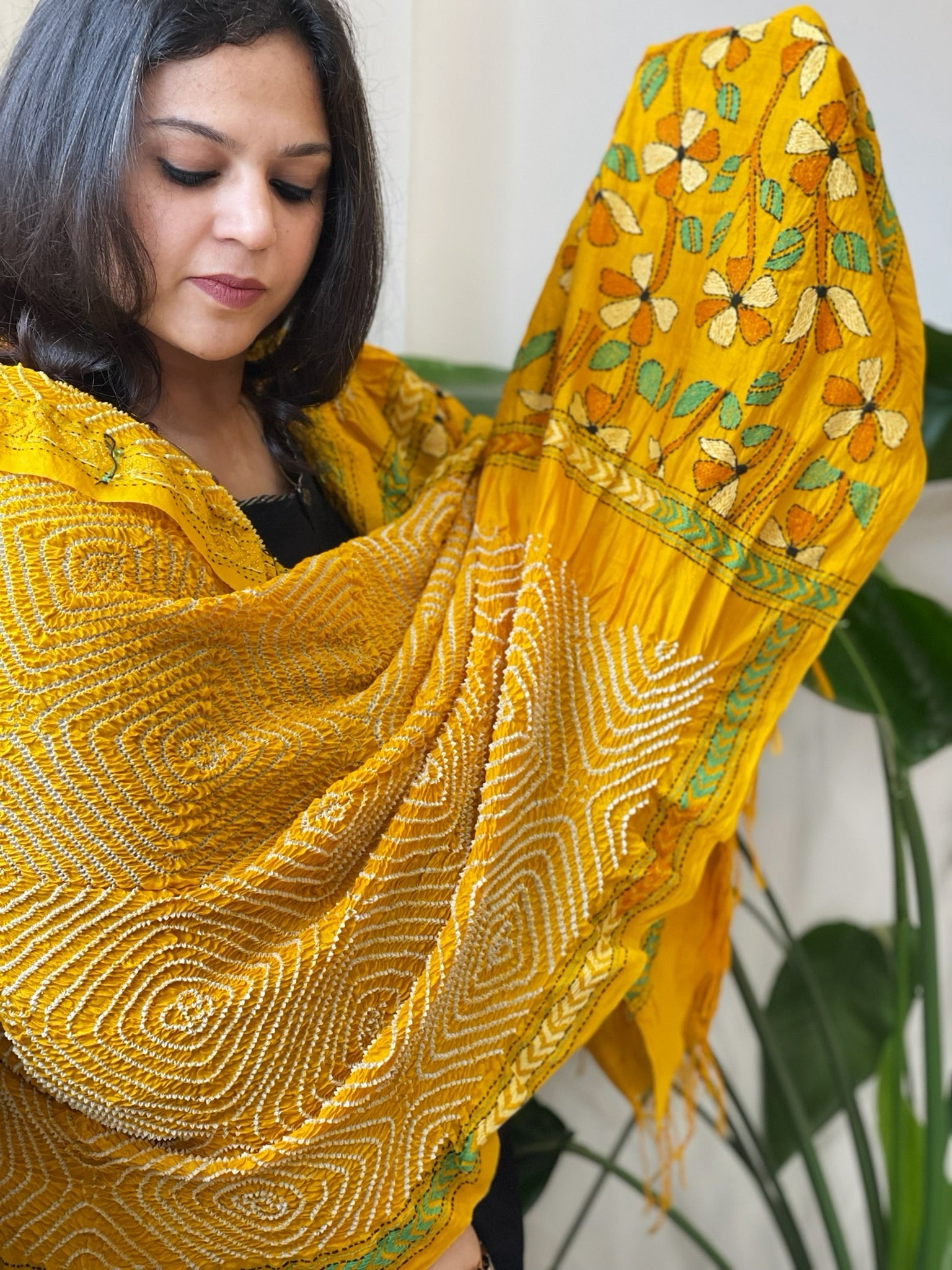 Infuse elegance and luxury into your wardrobe with our Rai Bandhej/Bandhani Dupatta. Crafted from pure Munga-Tussar Silk, this stunning piece features beautiful Kantha Hand Embroidery on the Pallu and Borders, showcasing the fusion of two exquisite art forms. Elevate any outfit with the gorgeous combination of traditional bandhani and Lucknowi handwork.