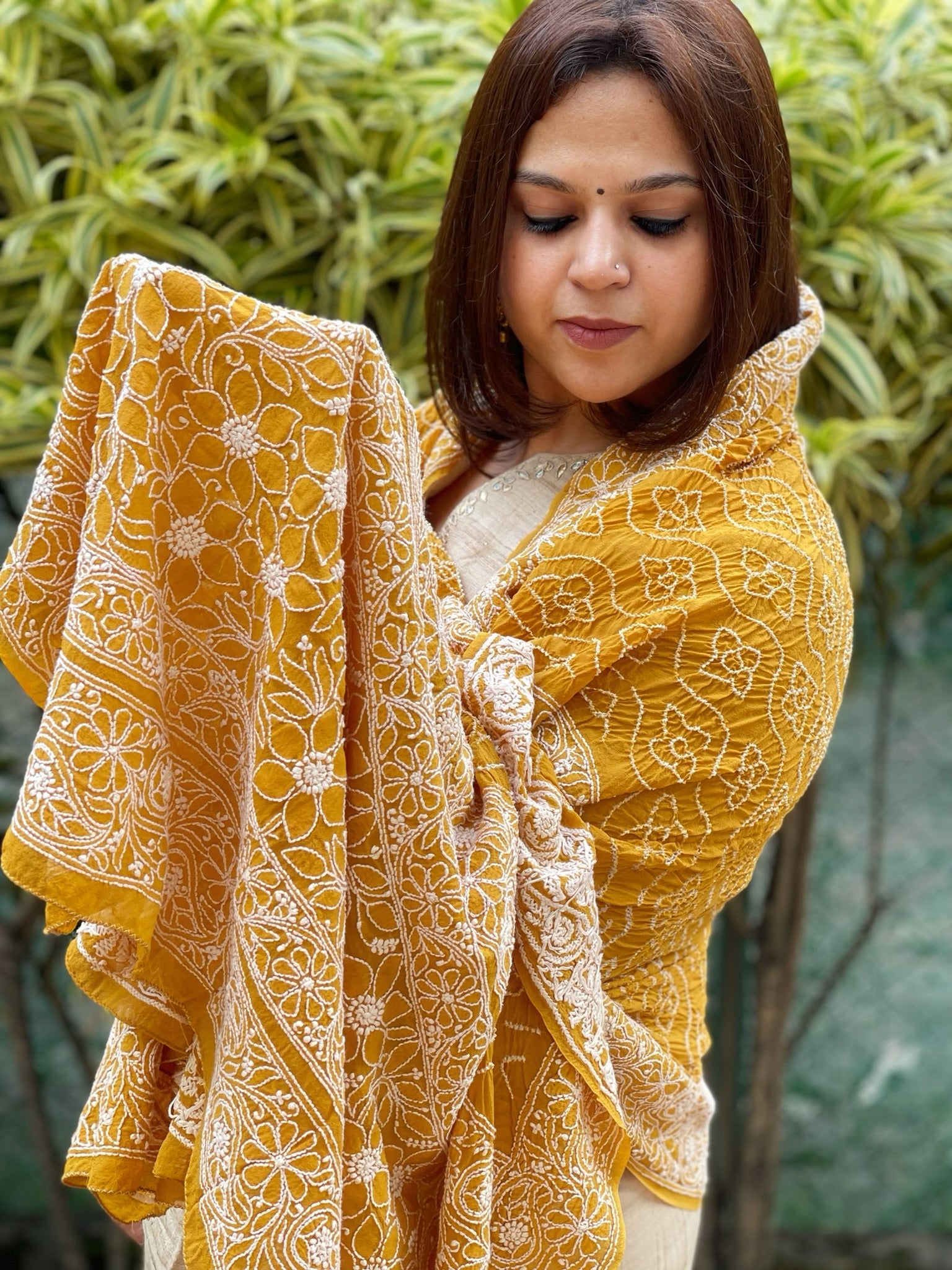 Infuse elegance and luxury into your wardrobe with our Rai Bandhej Dupatta. Crafted from pure georgtte, this stunning piece features beautiful Lucknowi Handwork, showcasing the fusion of two exquisite art forms. Elevate any outfit with the gorgeous combination of traditional bandhani and Lucknowi handwork.