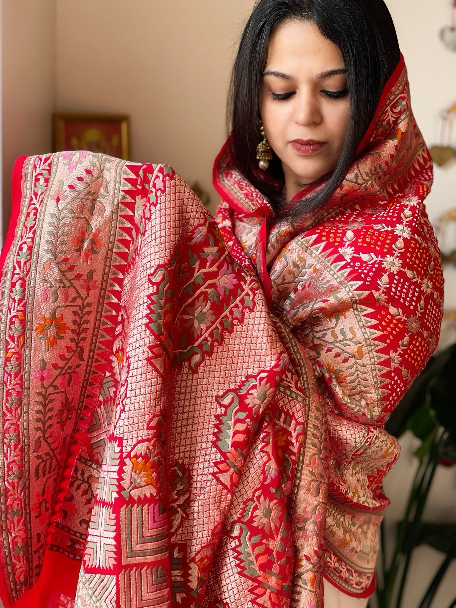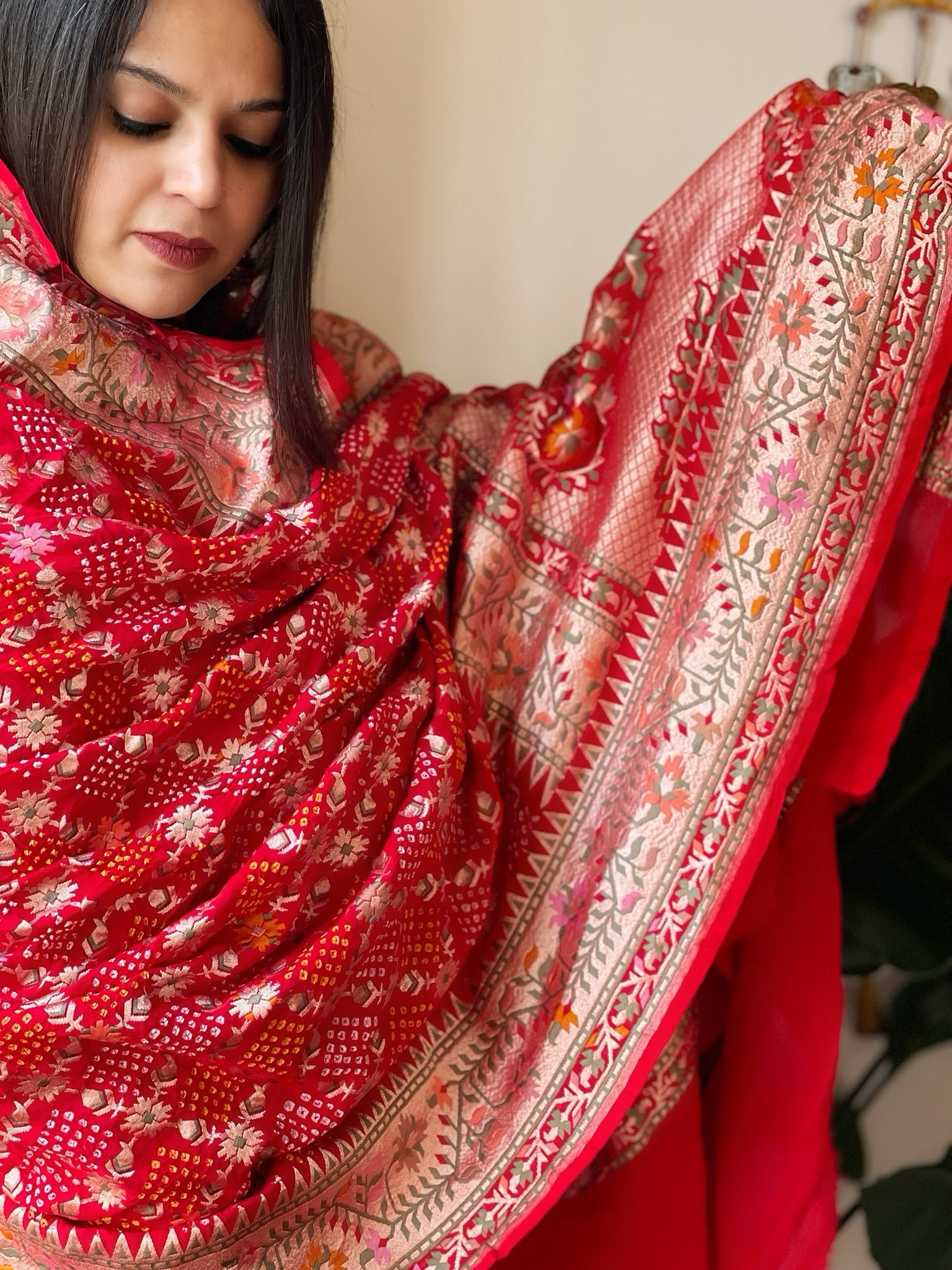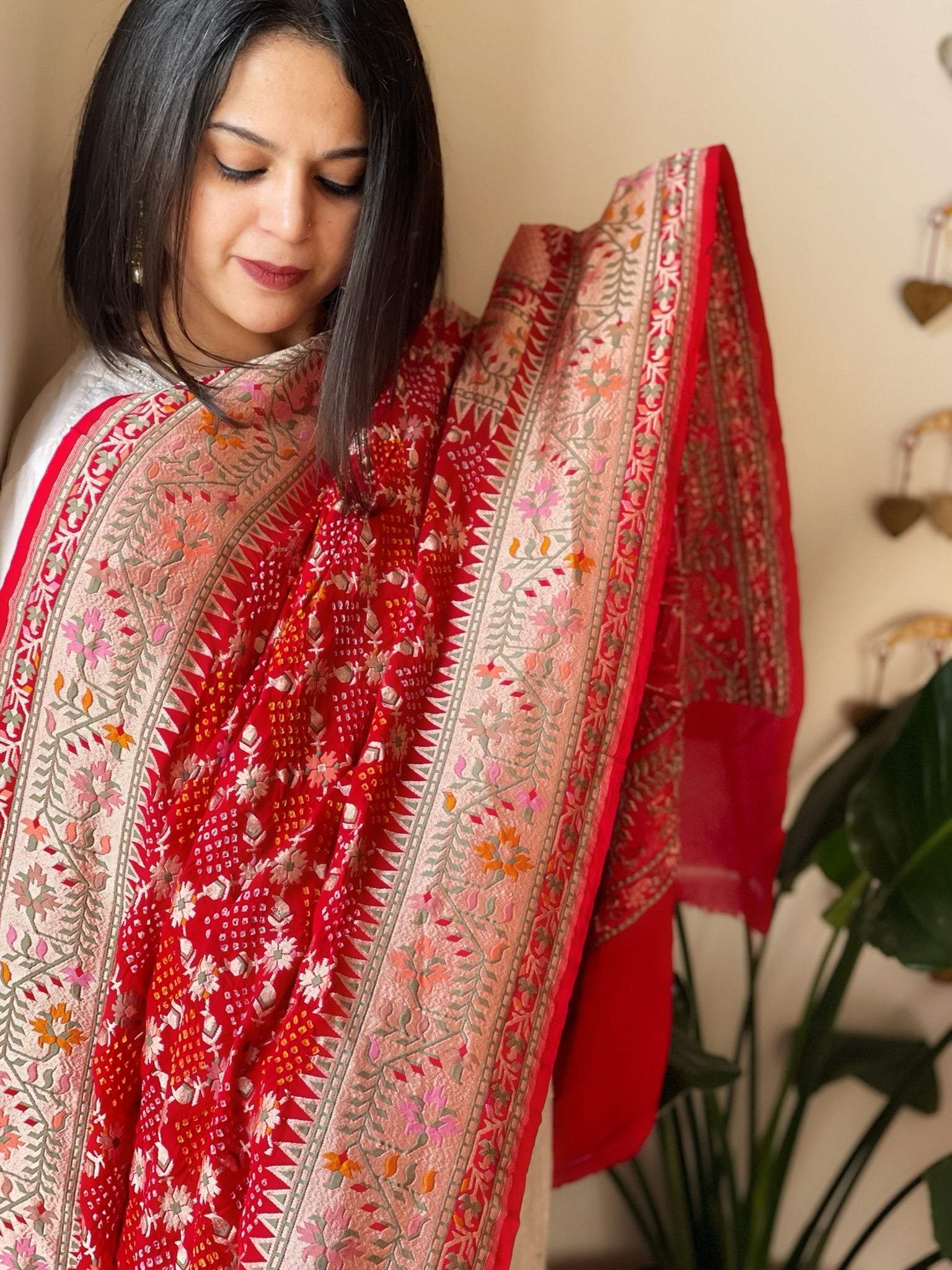Red Rai Bandhej Dupatta with Meenakari Jaal design in Georgette