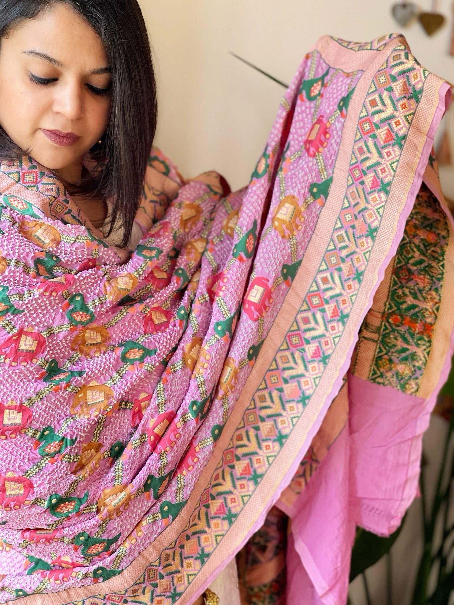 This Rai Bandhej Dupatta is crafted from pure Georgette and features a stunning handwoven Meenakari Jaal design. Perfect for special occasions, this bandhani dupatta exudes elegance and adds a touch of royalty to any outfit. Made with absolute precision, it is a must-have for those seeking a sophisticated and luxurious look.