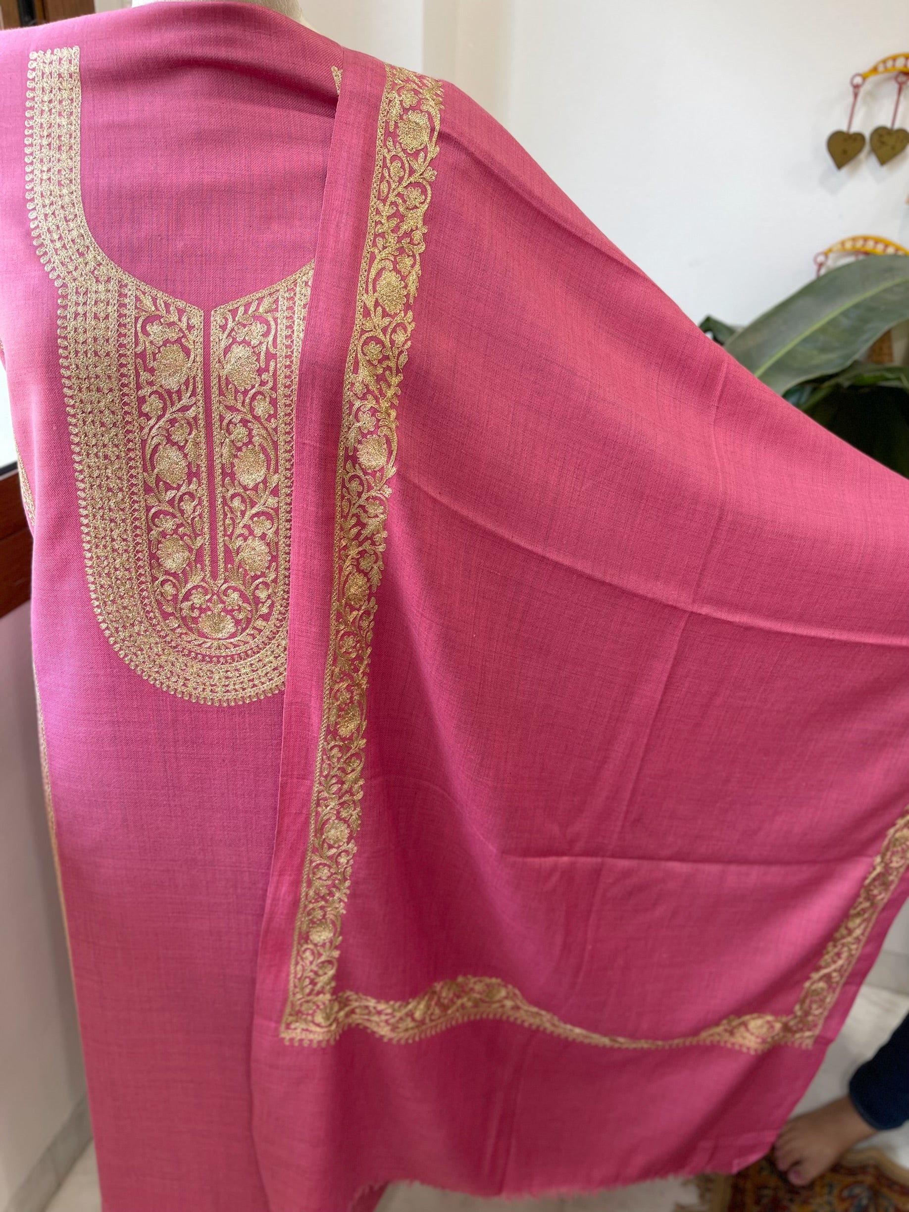Embrace winter elegance with this sophisticated 3-piece suit set, expertly crafted from lightweight pashmina wool that delivers warmth without bulk. Adorned with intricate Aari embroidery, it is warm, stylish and graceful.