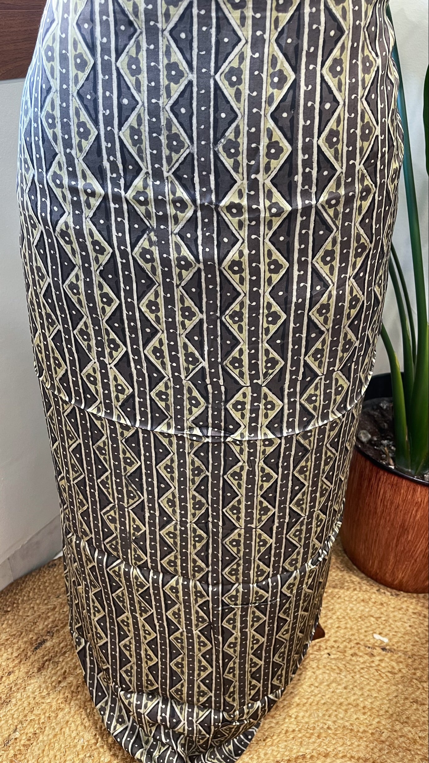 Presenting this sophisticated three-piece suit set, crafted from modal silk that drapes with effortless elegance. Each piece features authentic Ajrakh handblock printing and intricate sequin embroidery detailing. Perfect for festive occasions, celebrations, or making a distinctive style statement, this set combines traditional craftsmanship with contemporary silhouettes.