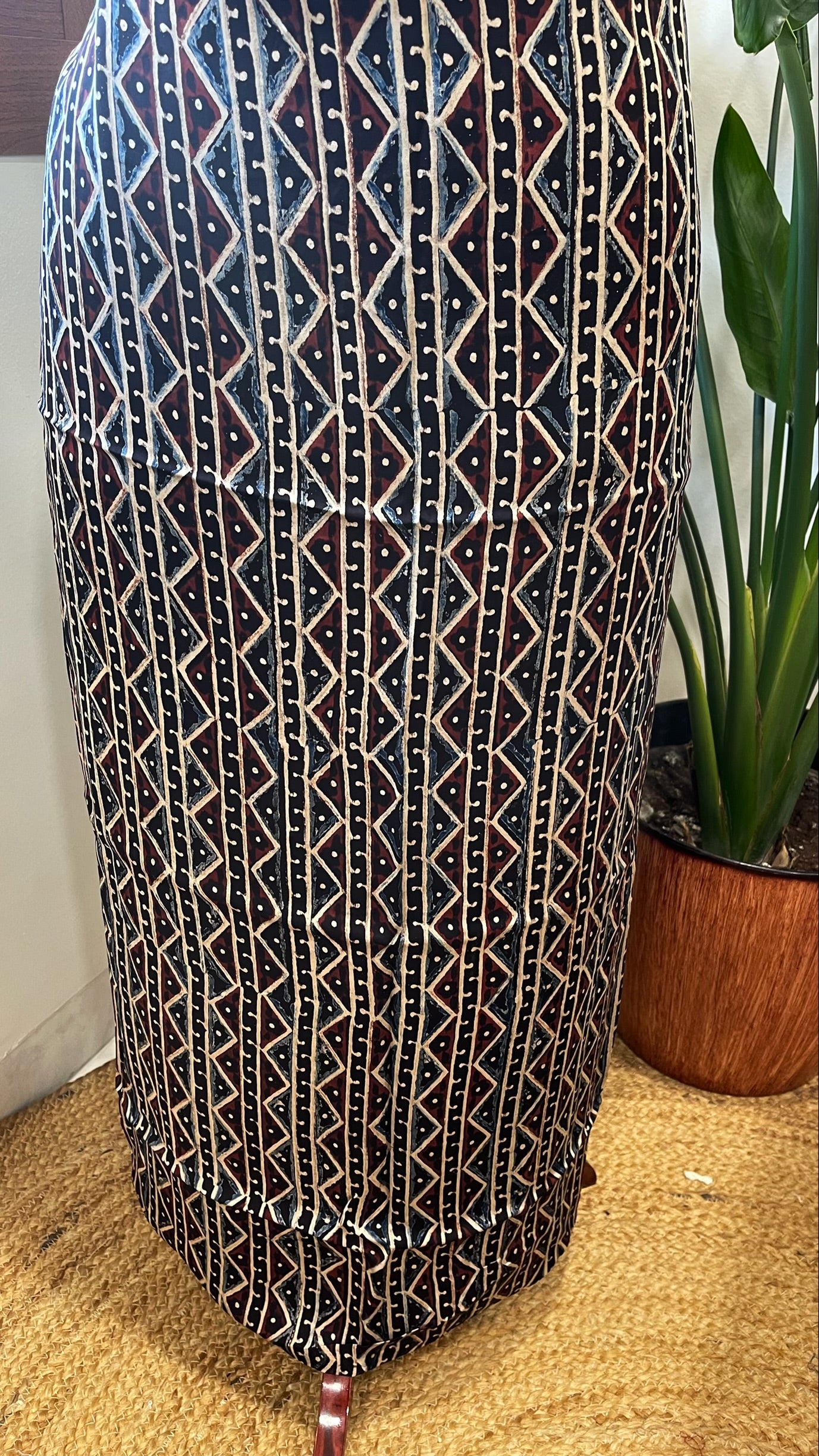 Presenting this sophisticated three-piece suit set, crafted from modal silk that drapes with effortless elegance. Each piece features authentic Ajrakh handblock printing and intricate sequin embroidery detailing. Perfect for festive occasions, celebrations, or making a distinctive style statement, this set combines traditional craftsmanship with contemporary silhouettes.