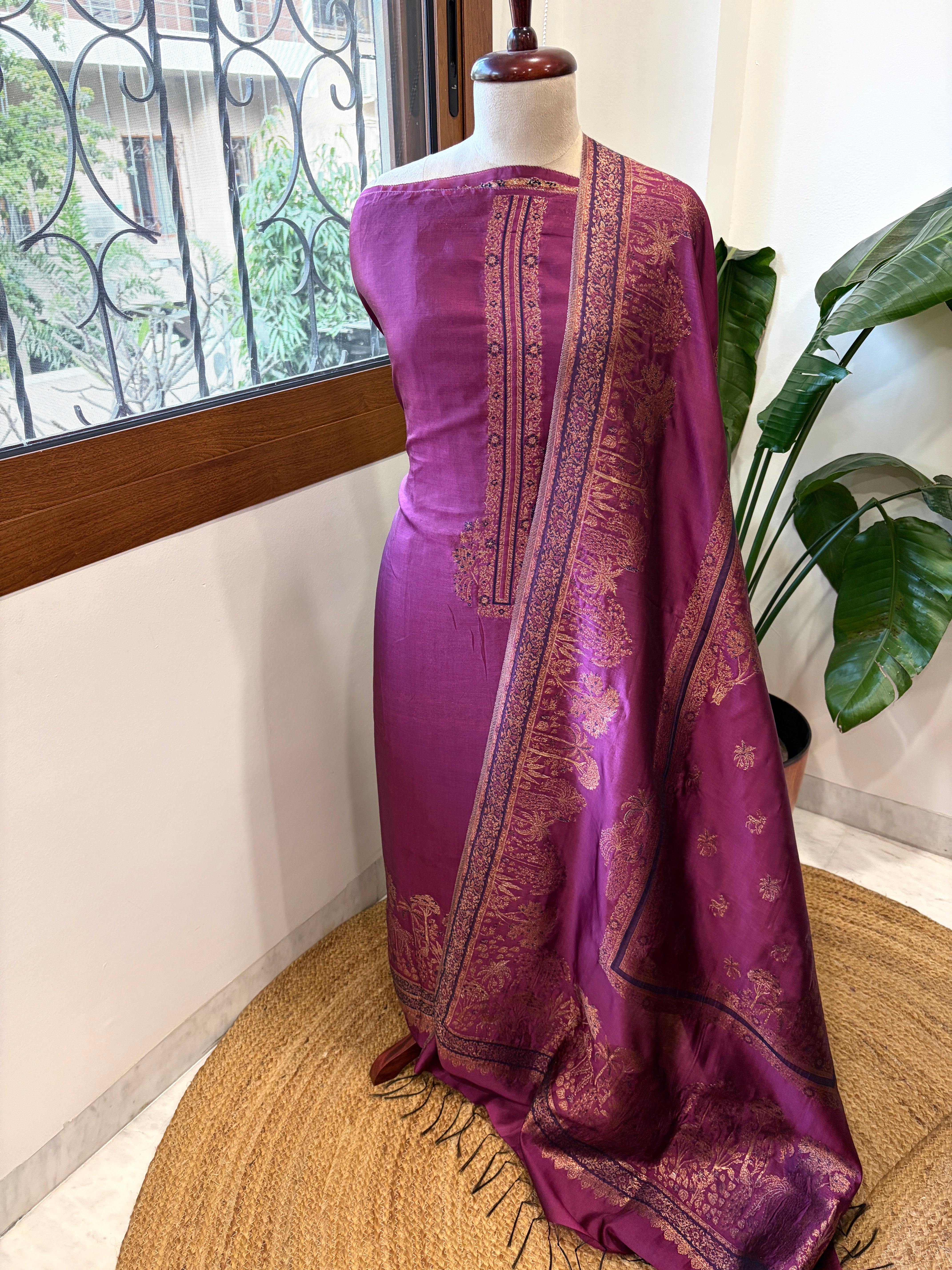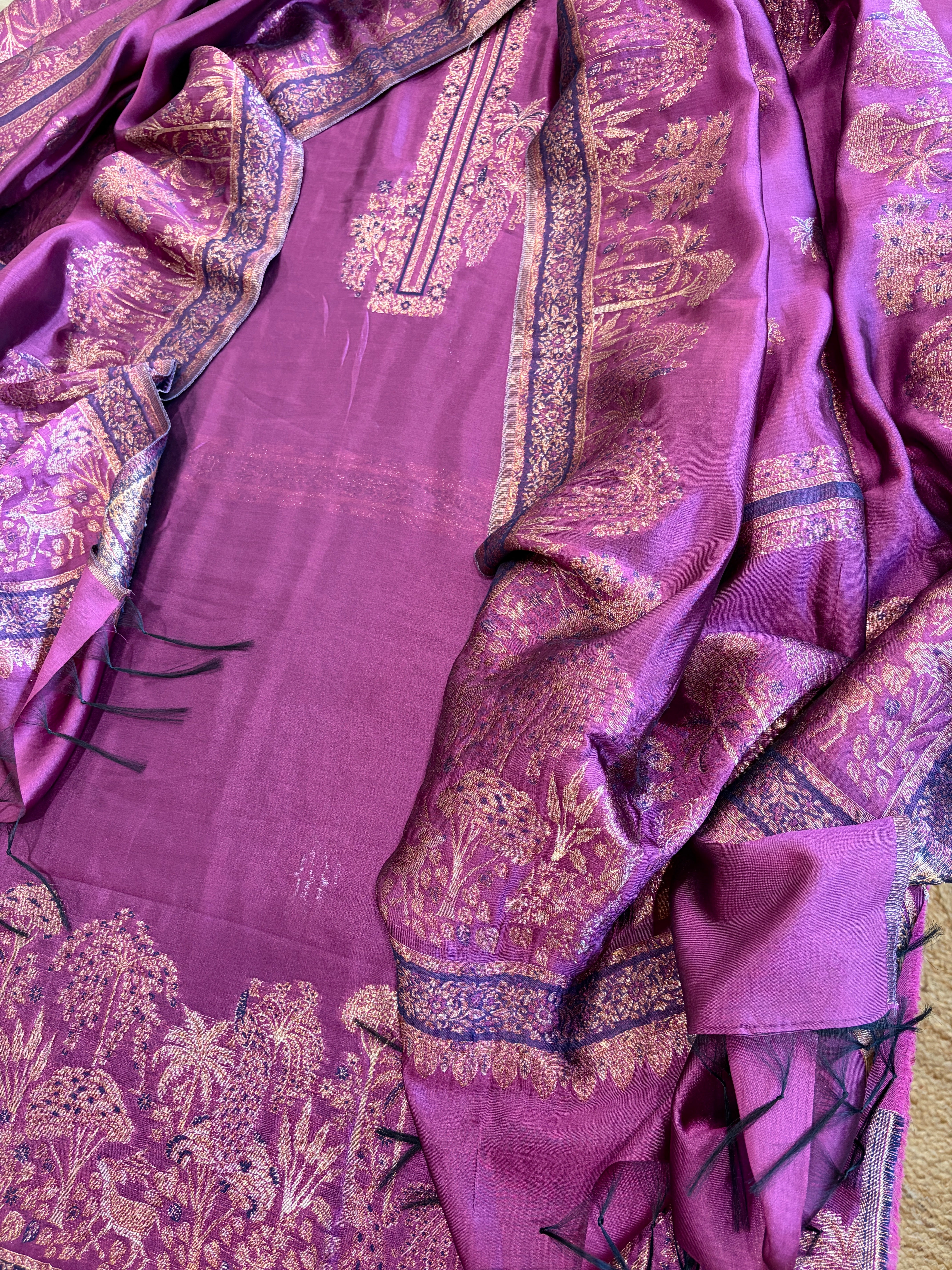 Experience the elegance of traditional craftsmanship with this exquisite 3-piece suit set featuring intricate handwoven Kaani and Zari weaving on pure silk. Perfect for celebrations, this suit set offers a luxurious look that honors heritage while ensuring you stand out with grace.