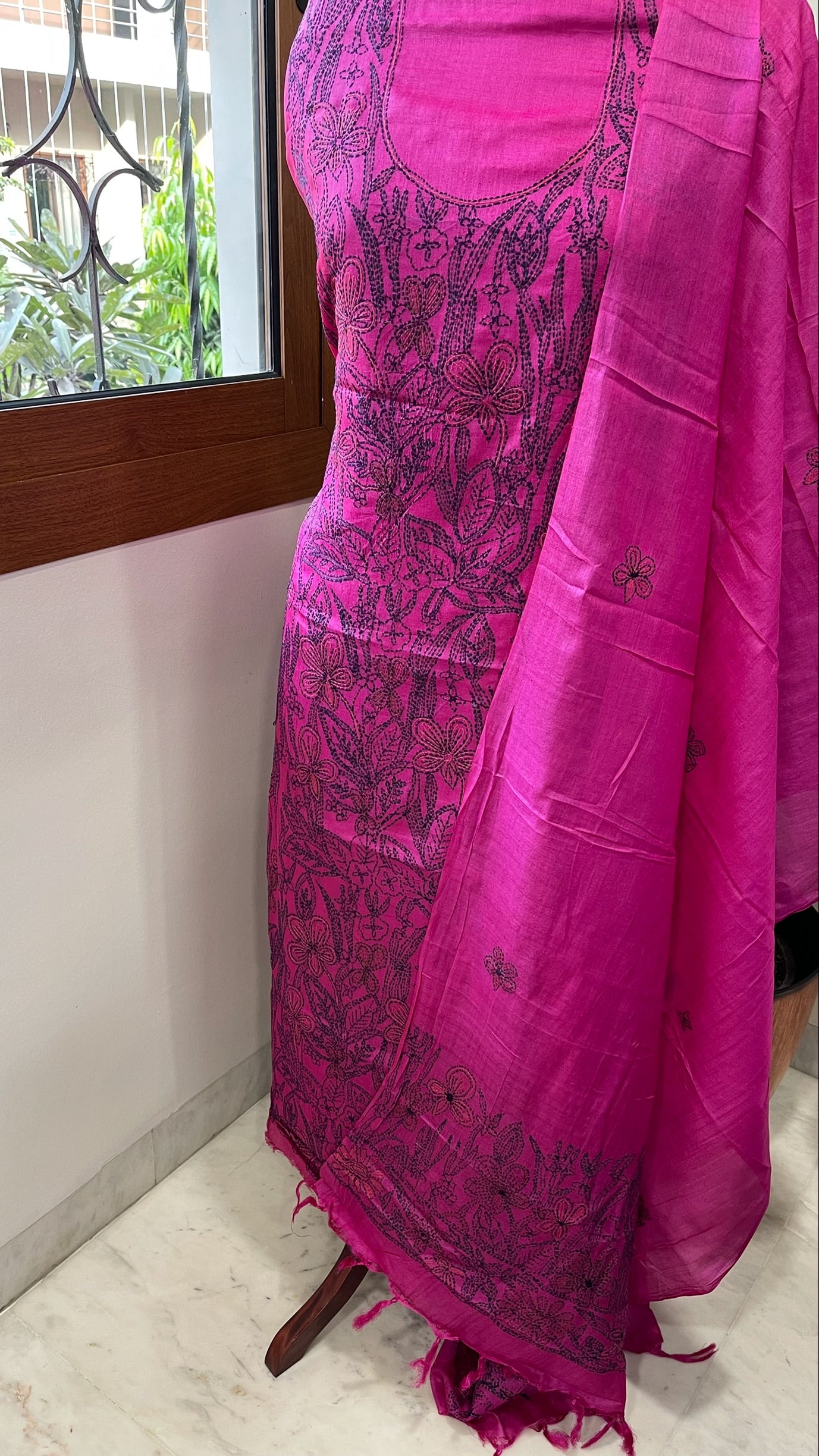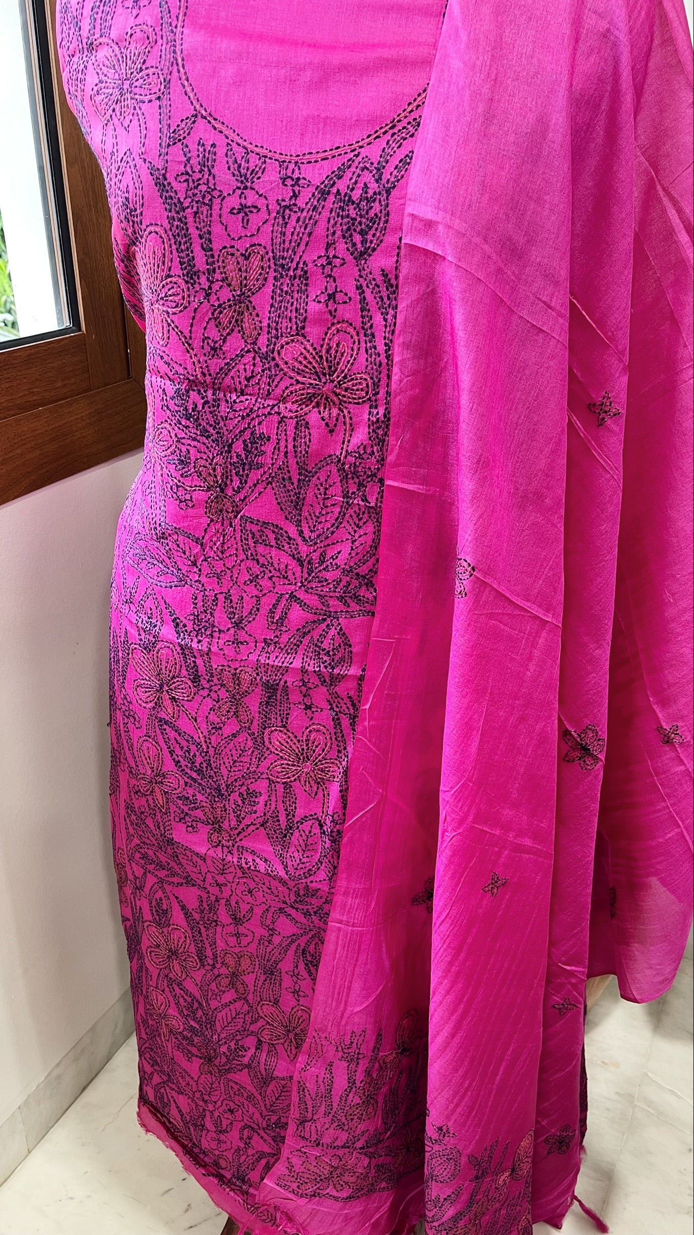 Experience the elegance of traditional craftsmanship with this exquisite 3-piece suit set featuring intricate Kantha handwork on pure tussar silk. Perfect for celebrations, this suit set offers a luxurious look that honors the Bengal heritage while ensuring you stand out with grace.