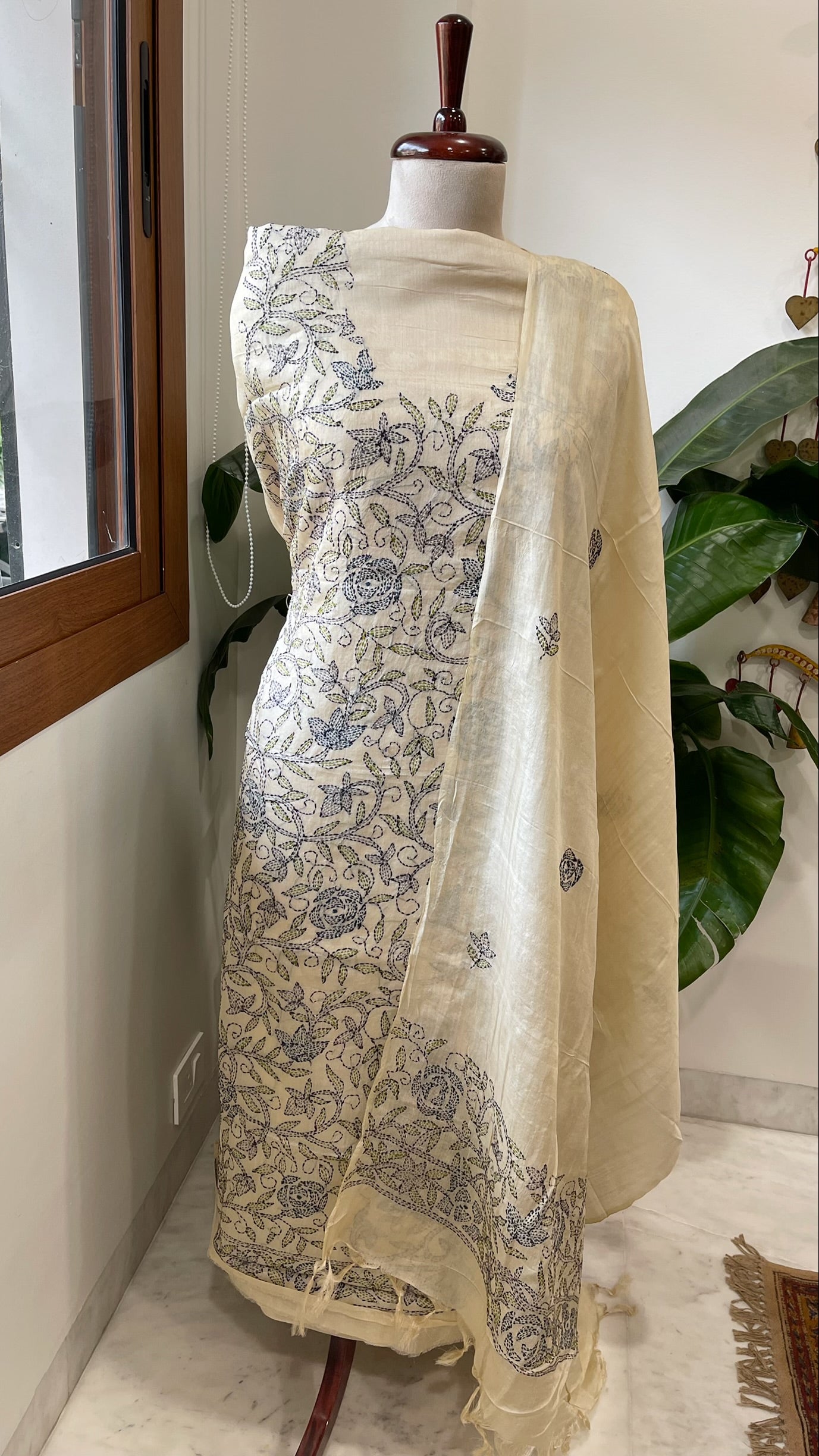 Cream Suit Set with Kantha Handwork in Pure Tussar Silk