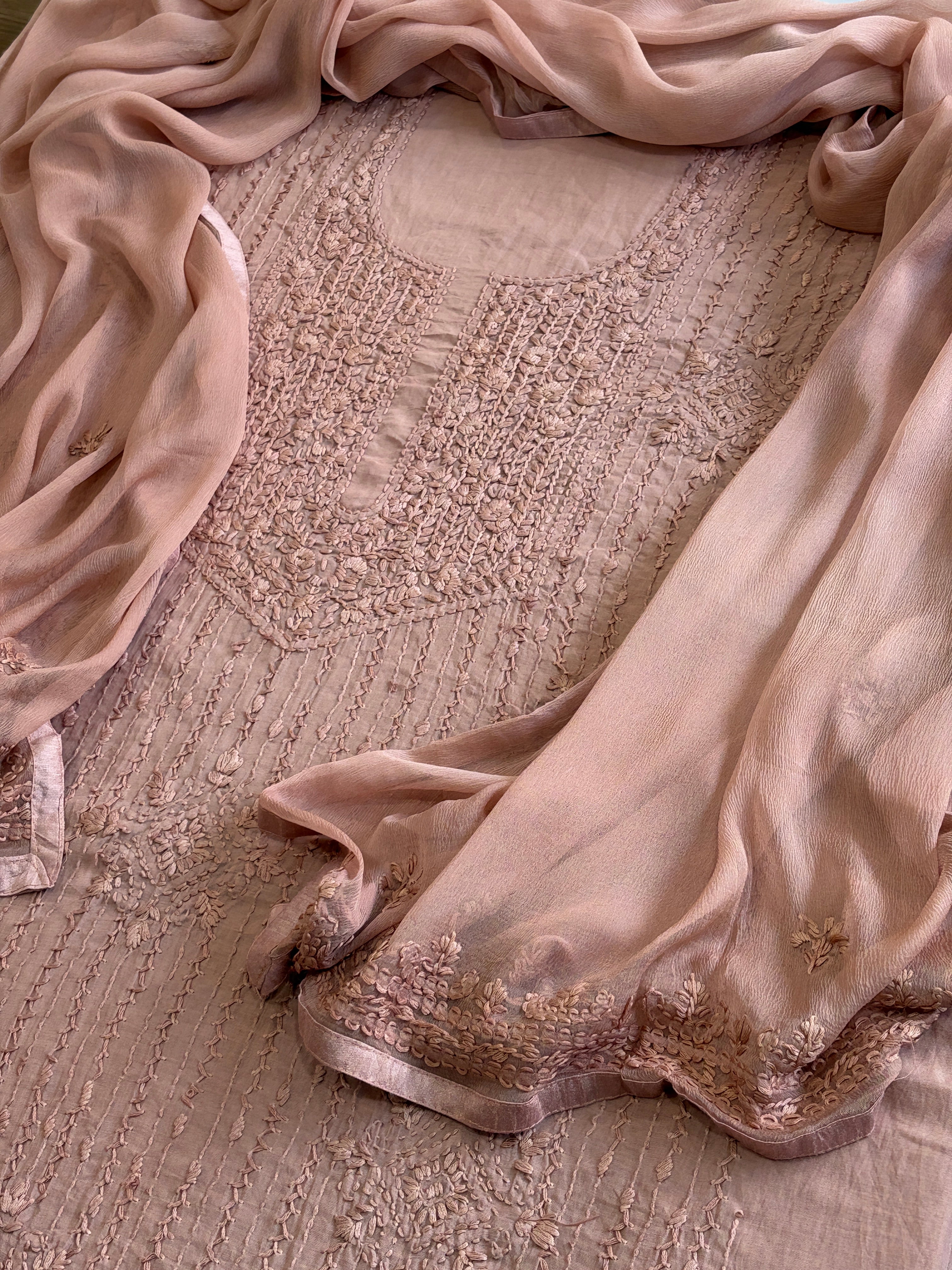 Antique Rose Suit Set with Lucknowi Handwork in Pure Mul Cotton