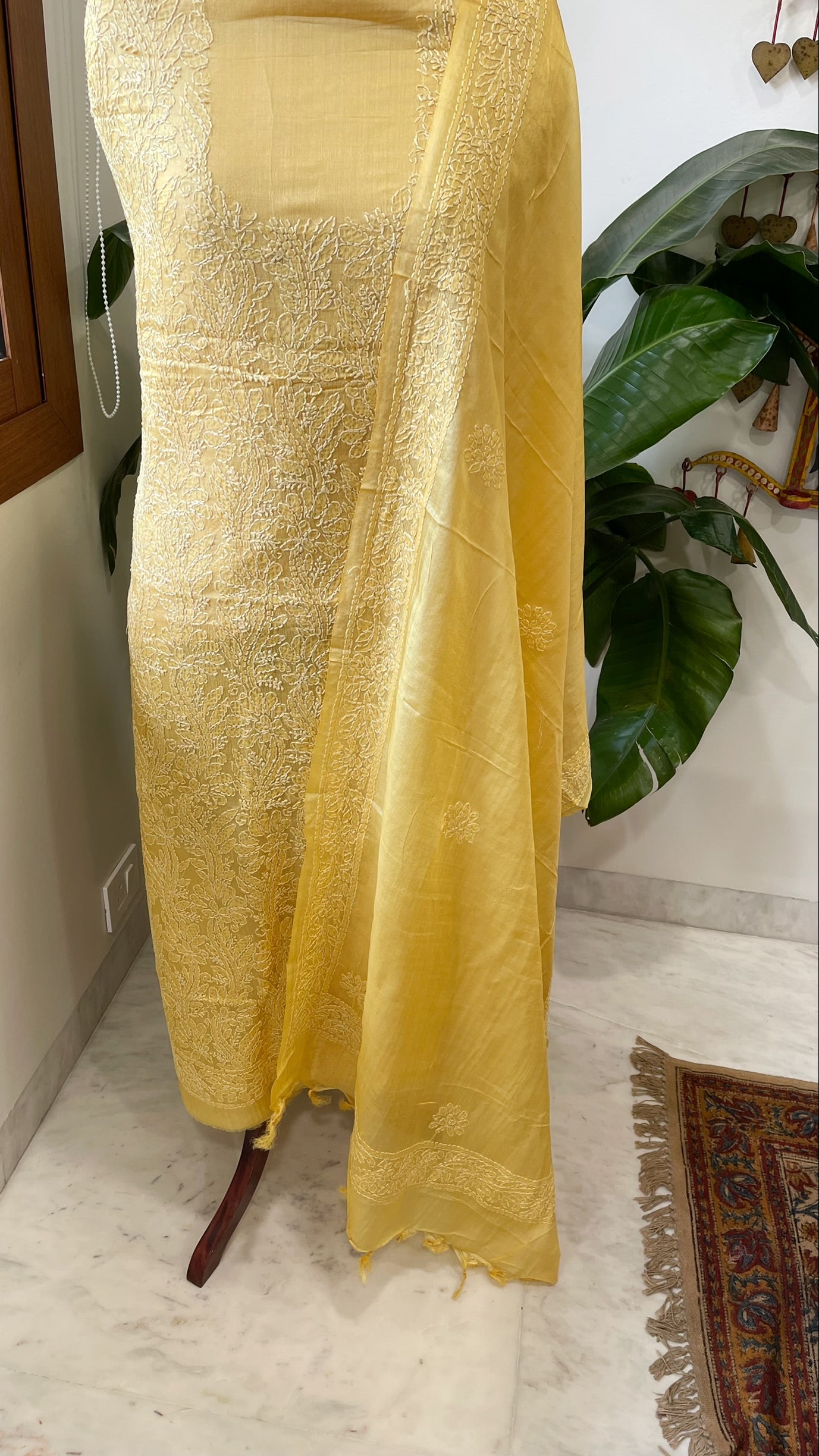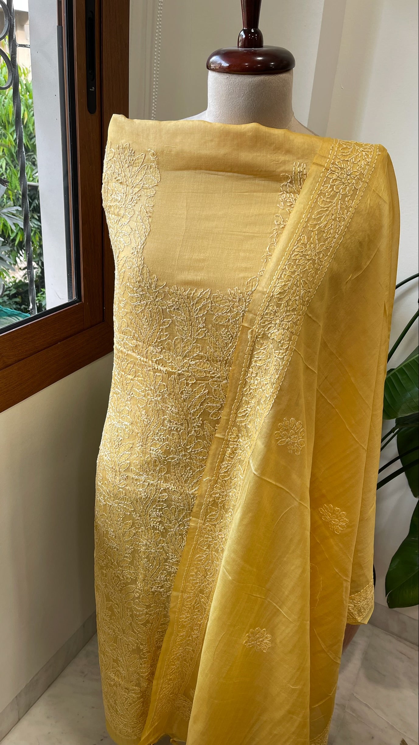 Experience the elegance of traditional craftsmanship with this exquisite 3-piece suit set featuring intricate Lucknowi handwork on pure tussar silk. Perfect for celebrations, this suit set offers a luxurious look that honors heritage while ensuring you stand out with grace.