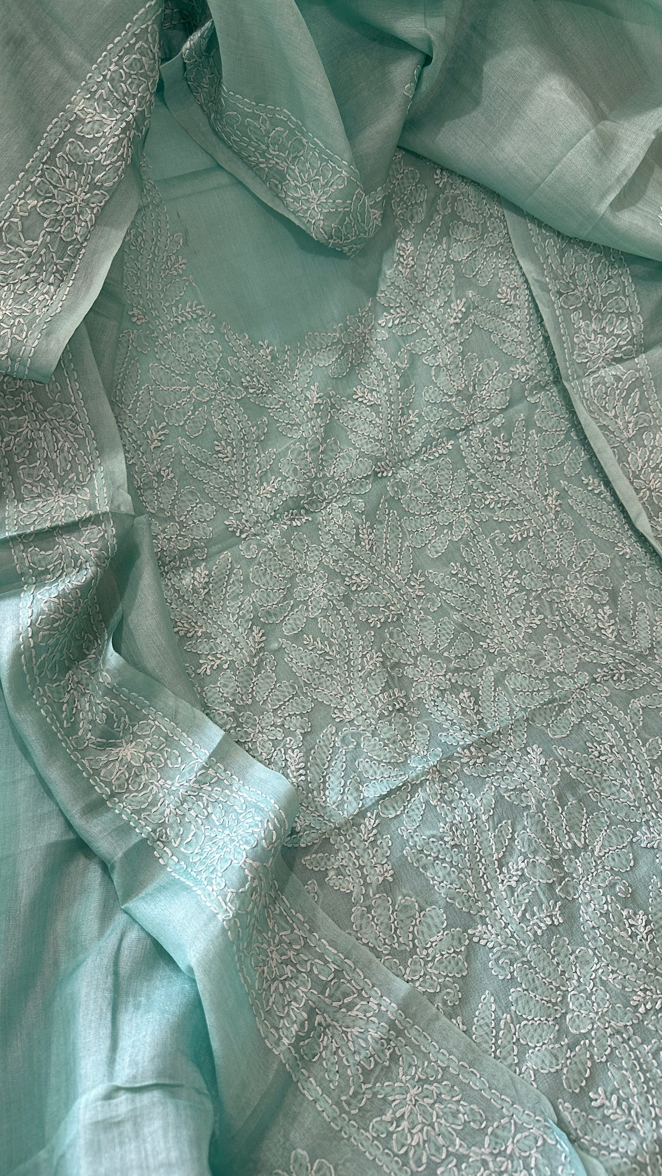 Aqua Blue Suit Set with Lucknowi Handwork in Pure Tussar Silk