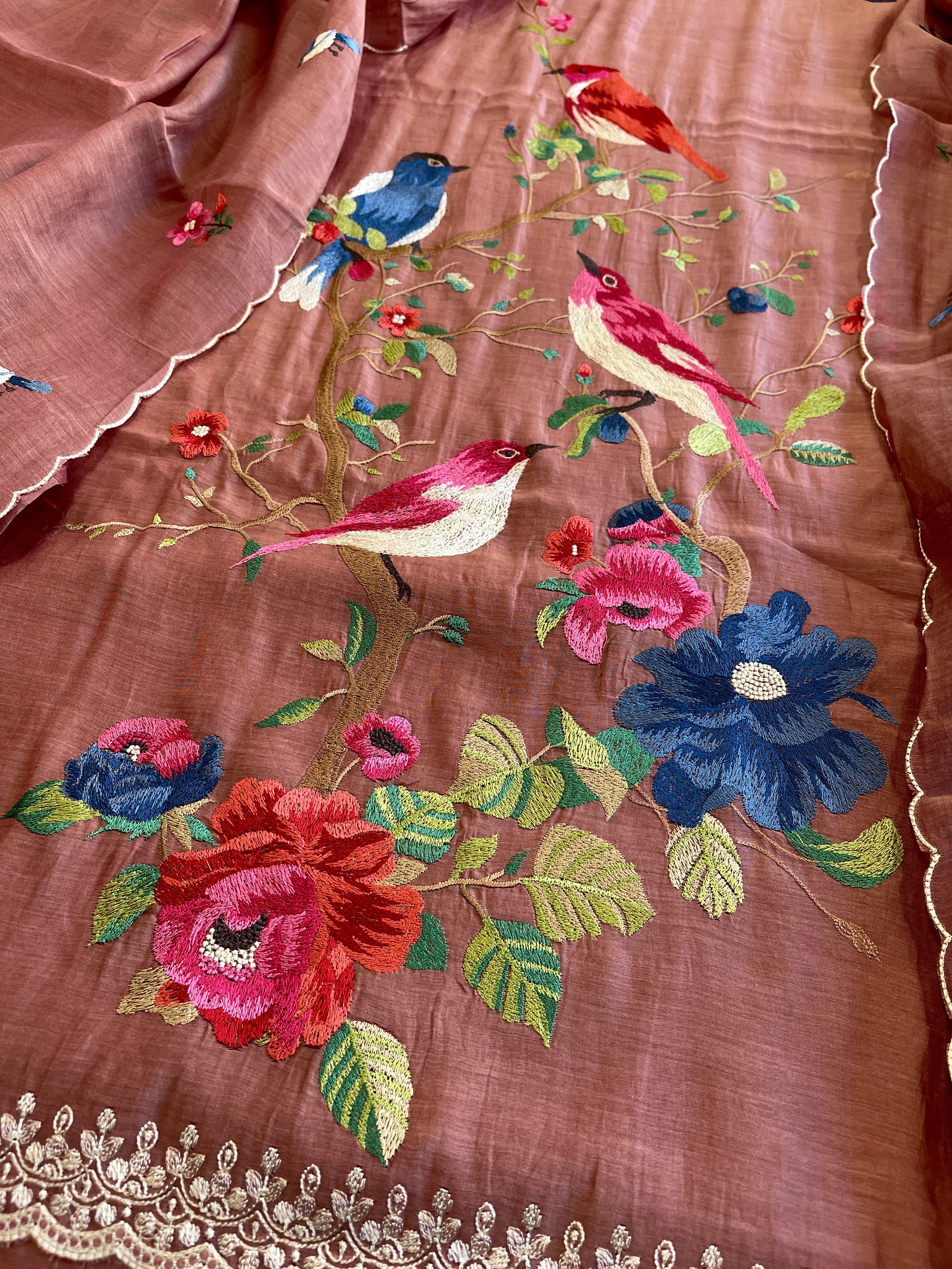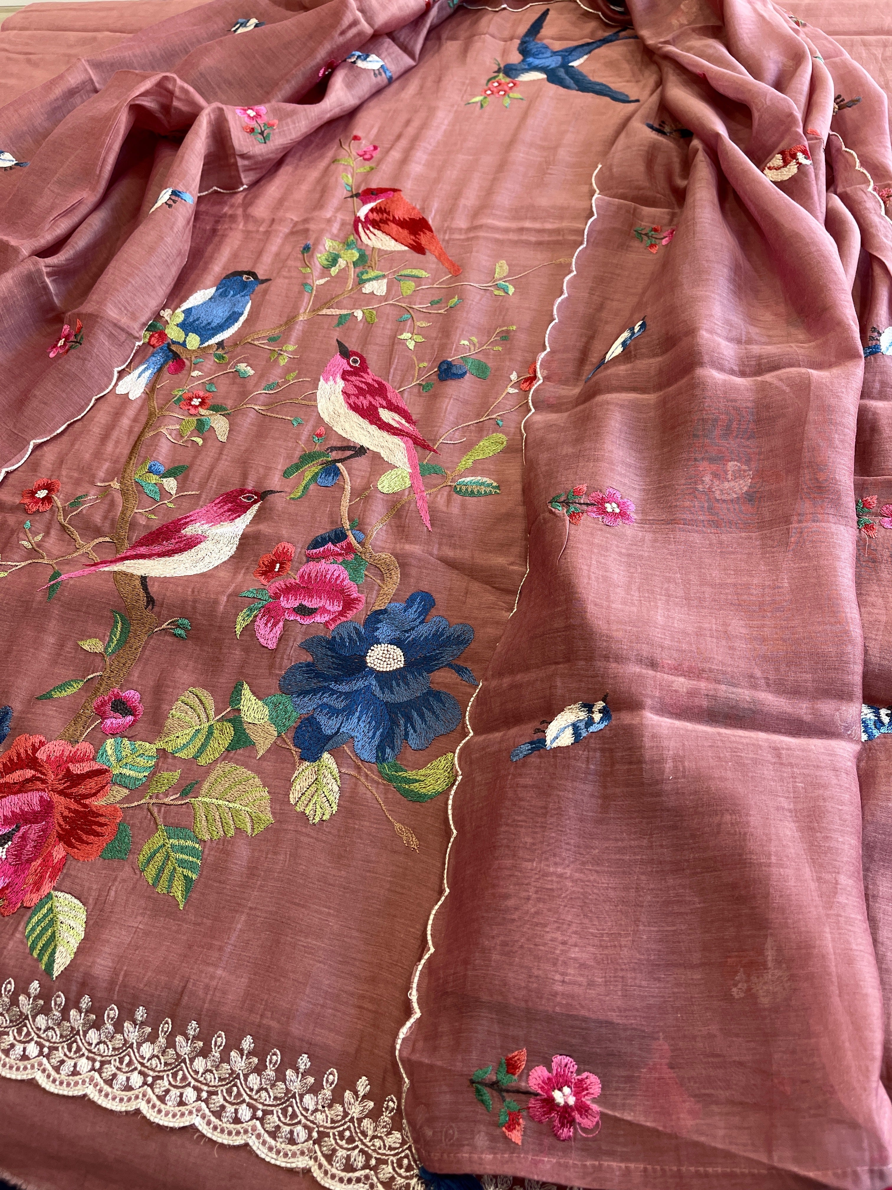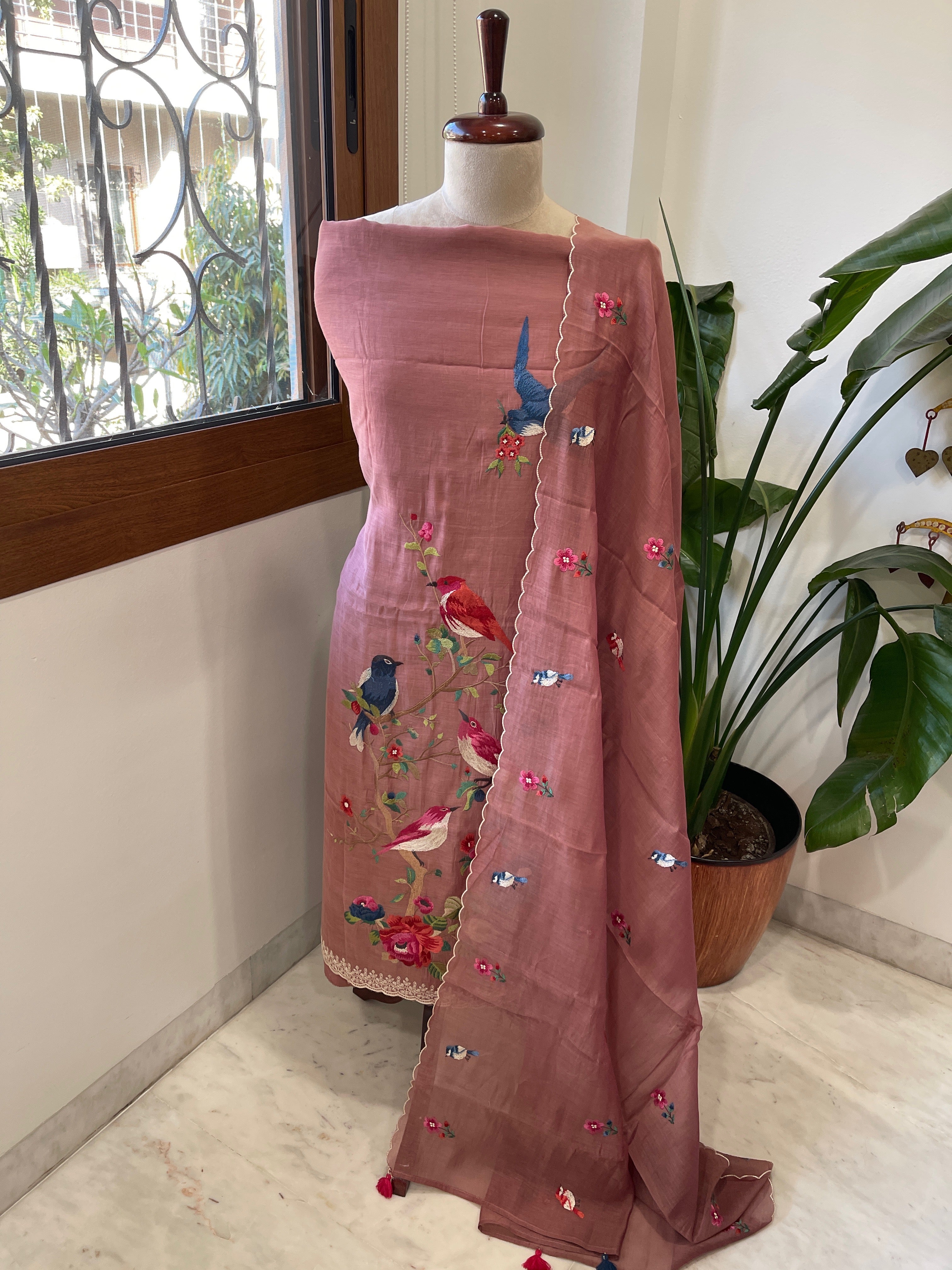 Experience the elegance of traditional craftsmanship with this exquisite 3-piece suit set featuring intricate thread embroidery on pure Mul Chanderi. Perfect for celebrations, this suit set offers a luxurious look that honors heritage while ensuring you stand out with grace.