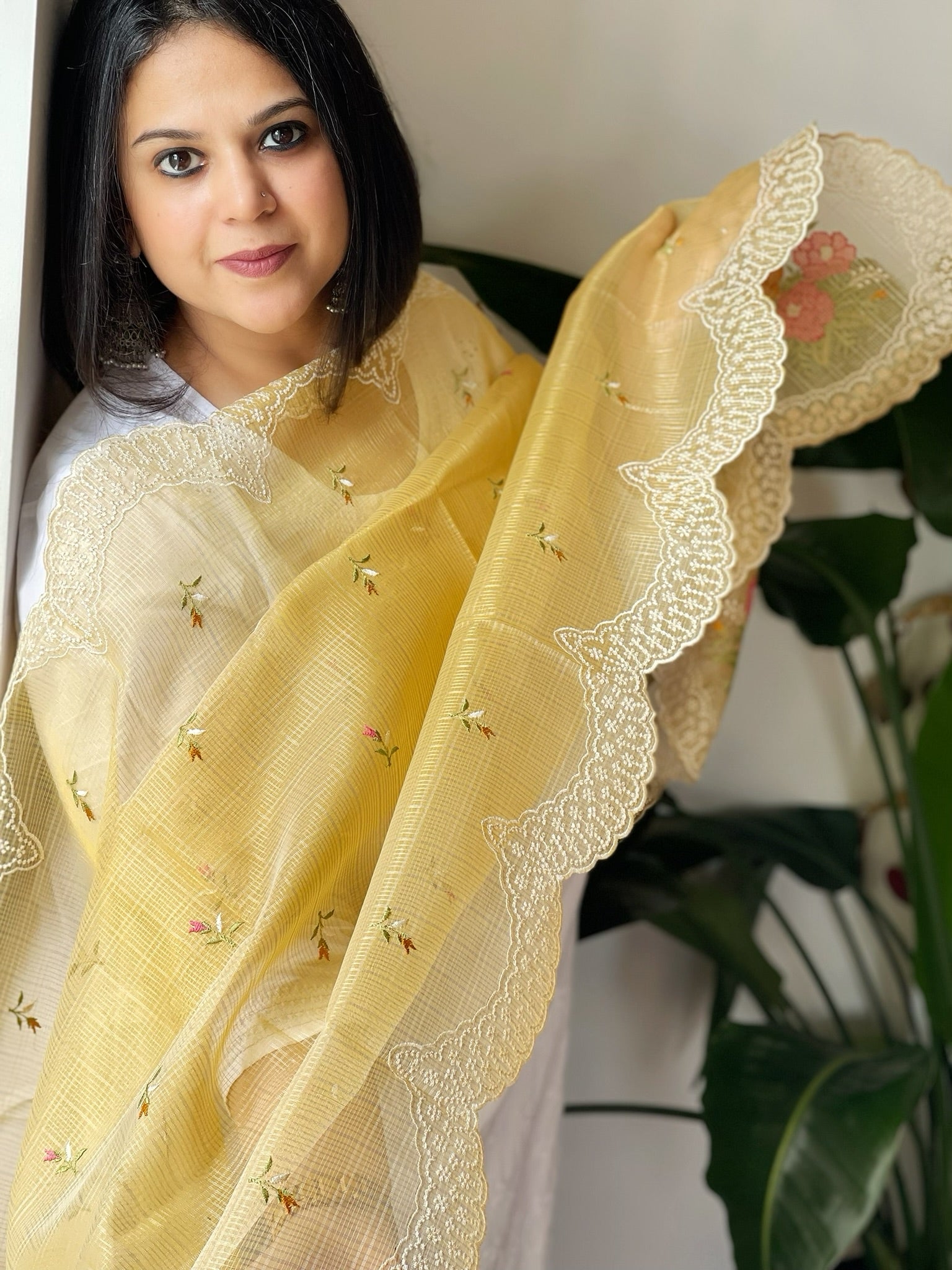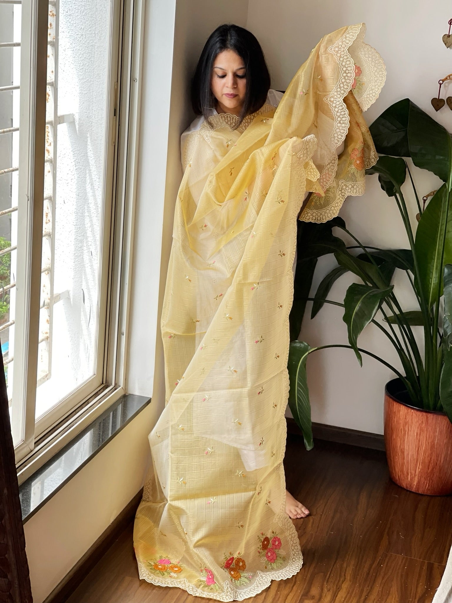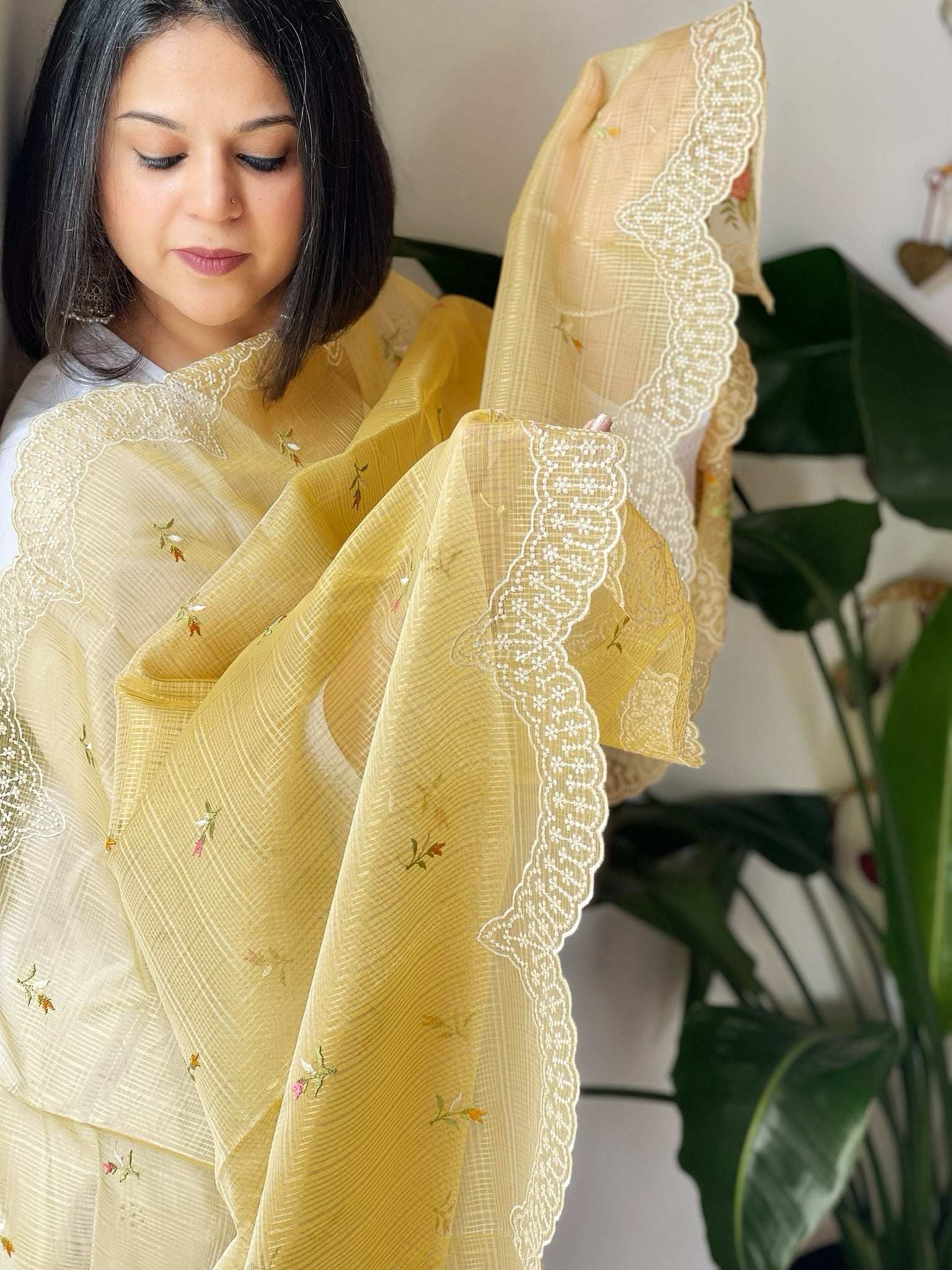 Yellow Tissue Organza Dupatta with cross-stitch embroidery