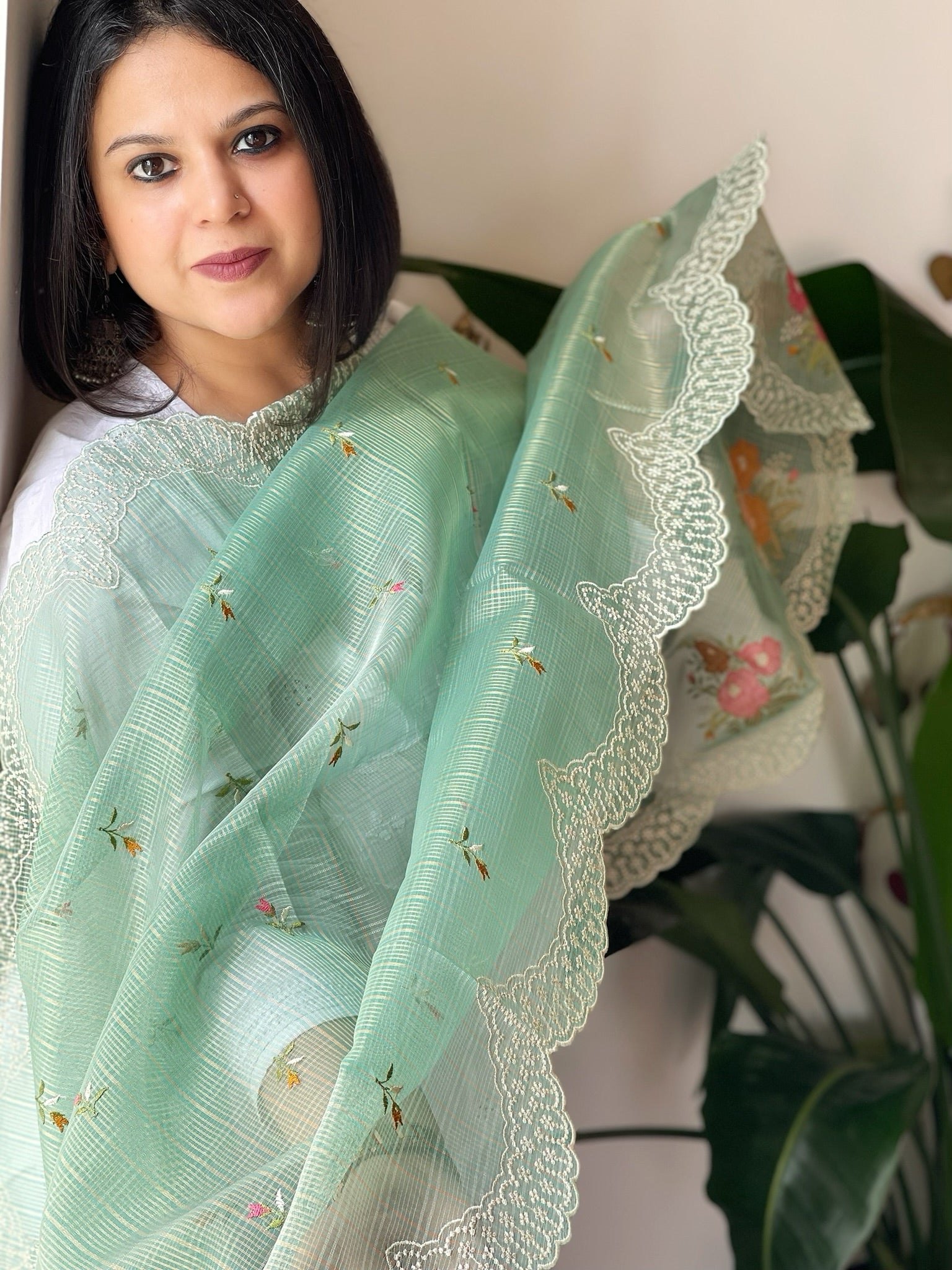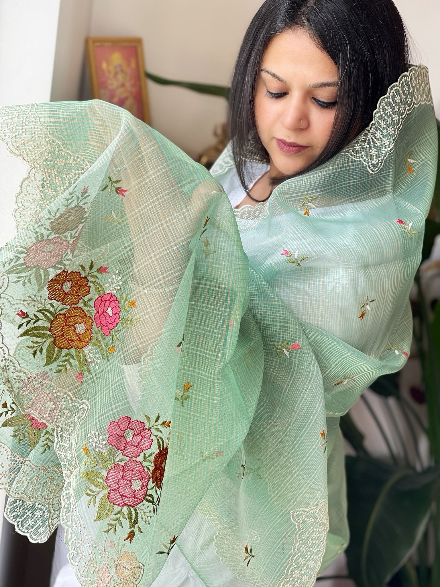 Aqua Blue Tissue Organza Dupatta with cross-stitch embroidery