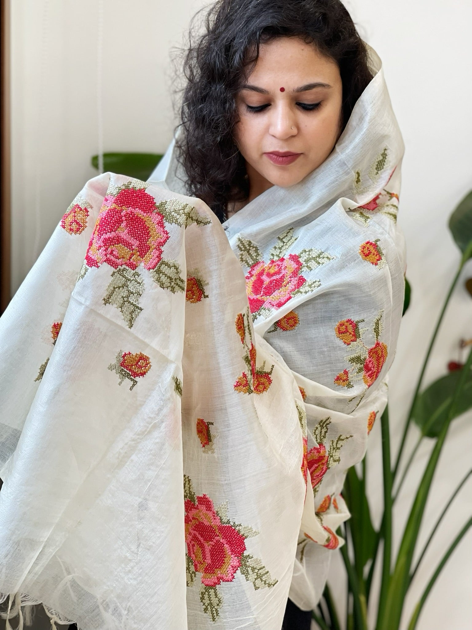 Elevate your style with our cross-stitch Thread Embroidery Dupatta made of pure tussar silk. The exquisite cross-stitch embroidery adds a touch of elegance to any outfit, perfect for special occasions or as officewear. With its charming design, all eyes will be on you.
