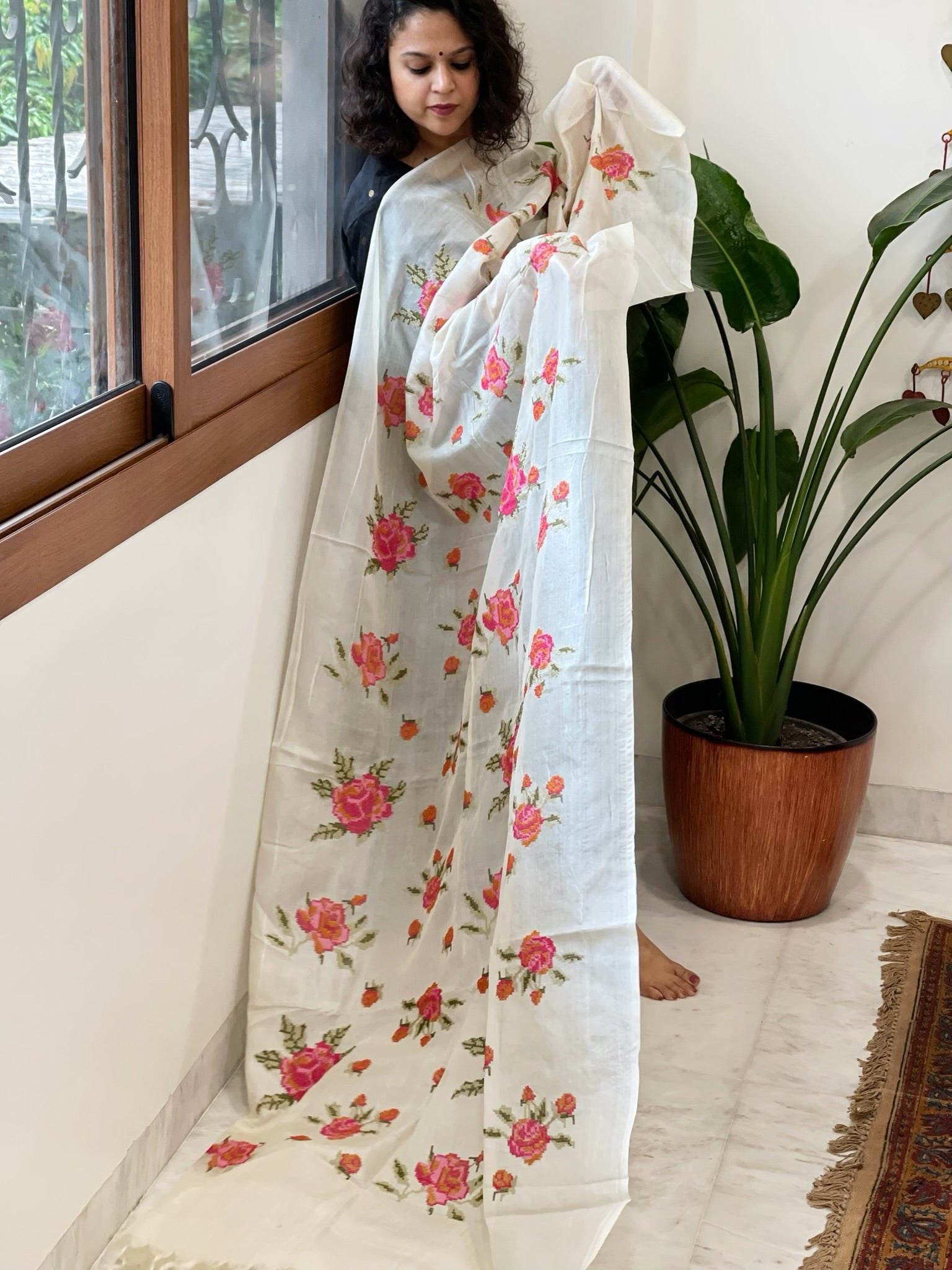 Elevate your style with our cross-stitch Thread Embroidery Dupatta made of pure tussar silk. The exquisite cross-stitch embroidery adds a touch of elegance to any outfit, perfect for special occasions or as officewear. With its charming design, all eyes will be on you.