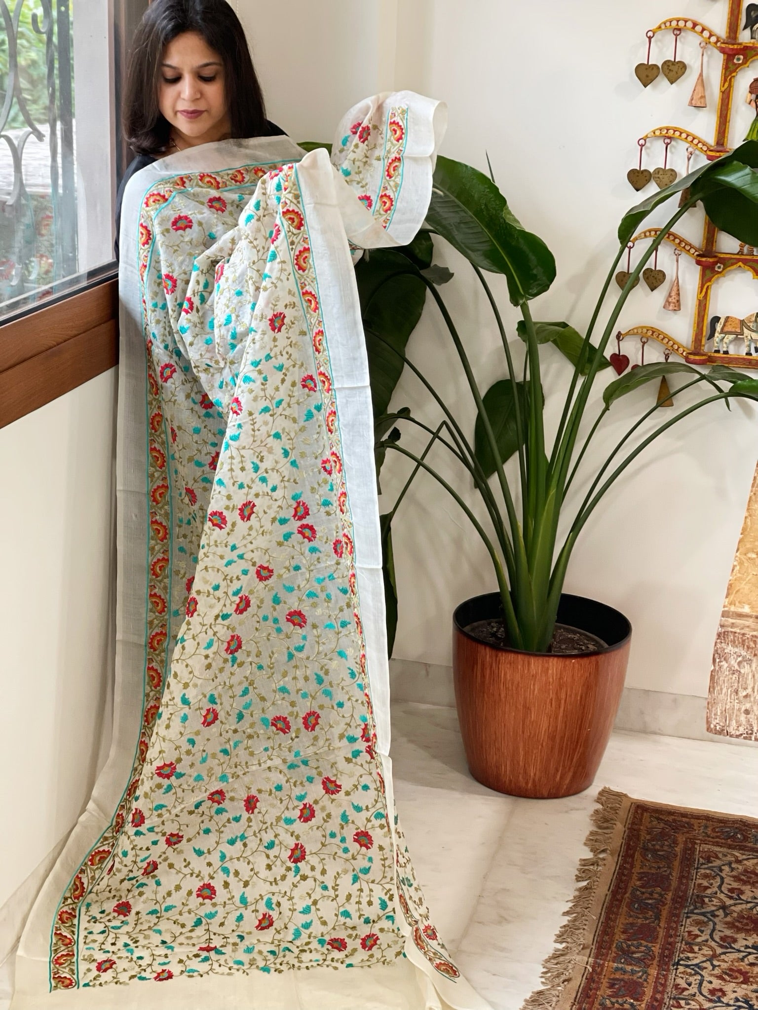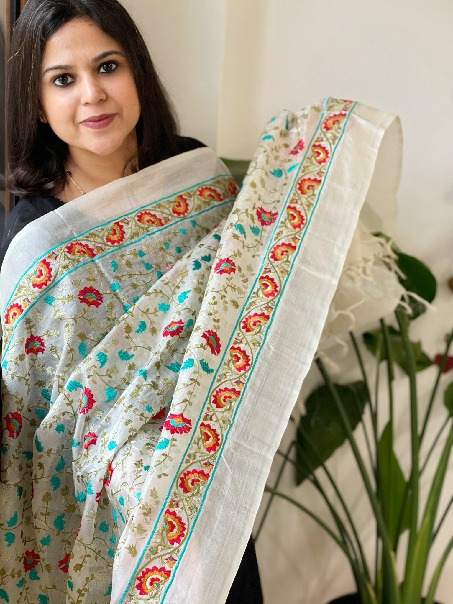 Elevate your ensemble with this Pure Tussar Silk dupatta featuring intricate Thread Jaal embroidery. Handcrafted from natural tussar silk, it offers a rich texture and subtle sheen, while the detailed thread work adds timeless elegance.