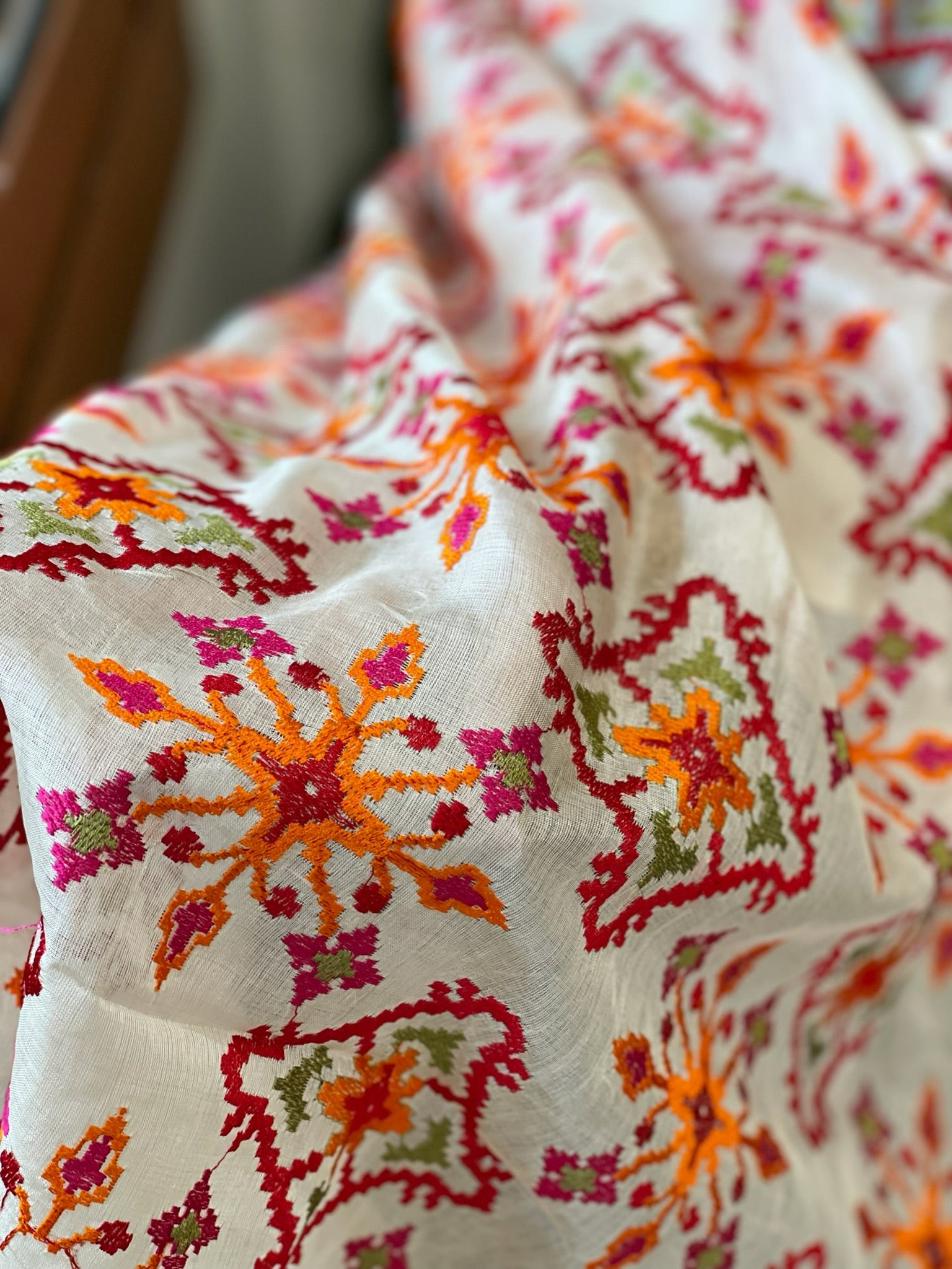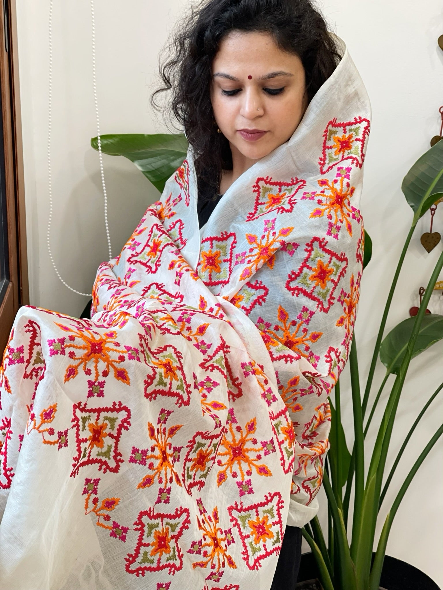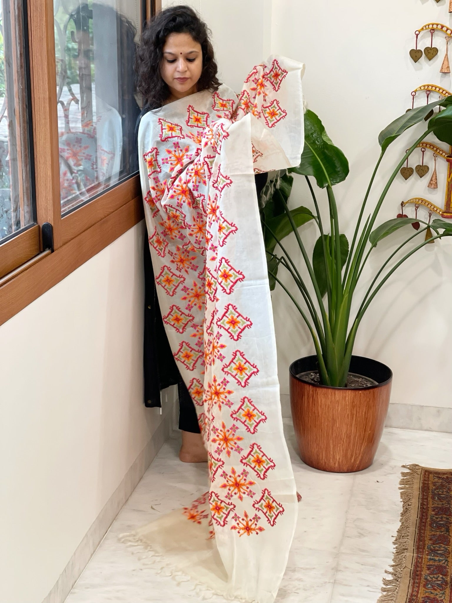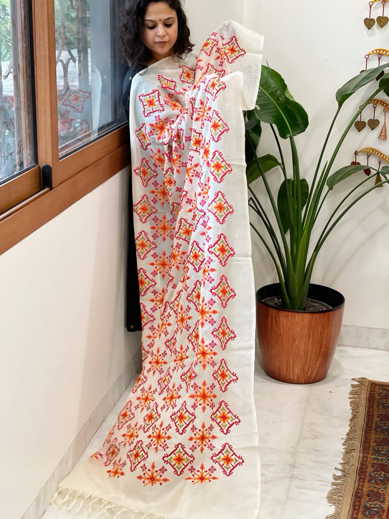 Elevate your ensemble with this Pure Tussar Silk dupatta featuring intricate Thread Jaal embroidery. Handcrafted from natural tussar silk, it offers a rich texture and subtle sheen, while the detailed thread work adds timeless elegance.