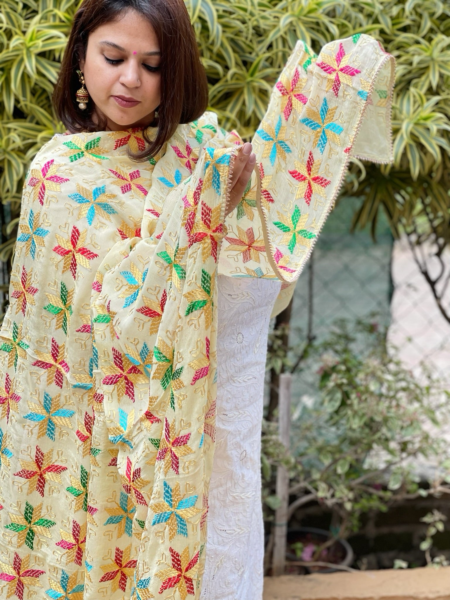Expertly crafted in Punjab, this handmade designer Phulkari Dupatta is a timeless piece made from pure Chinon fabric. The intricate Phulkari design adds a versatile touch to any outfit.