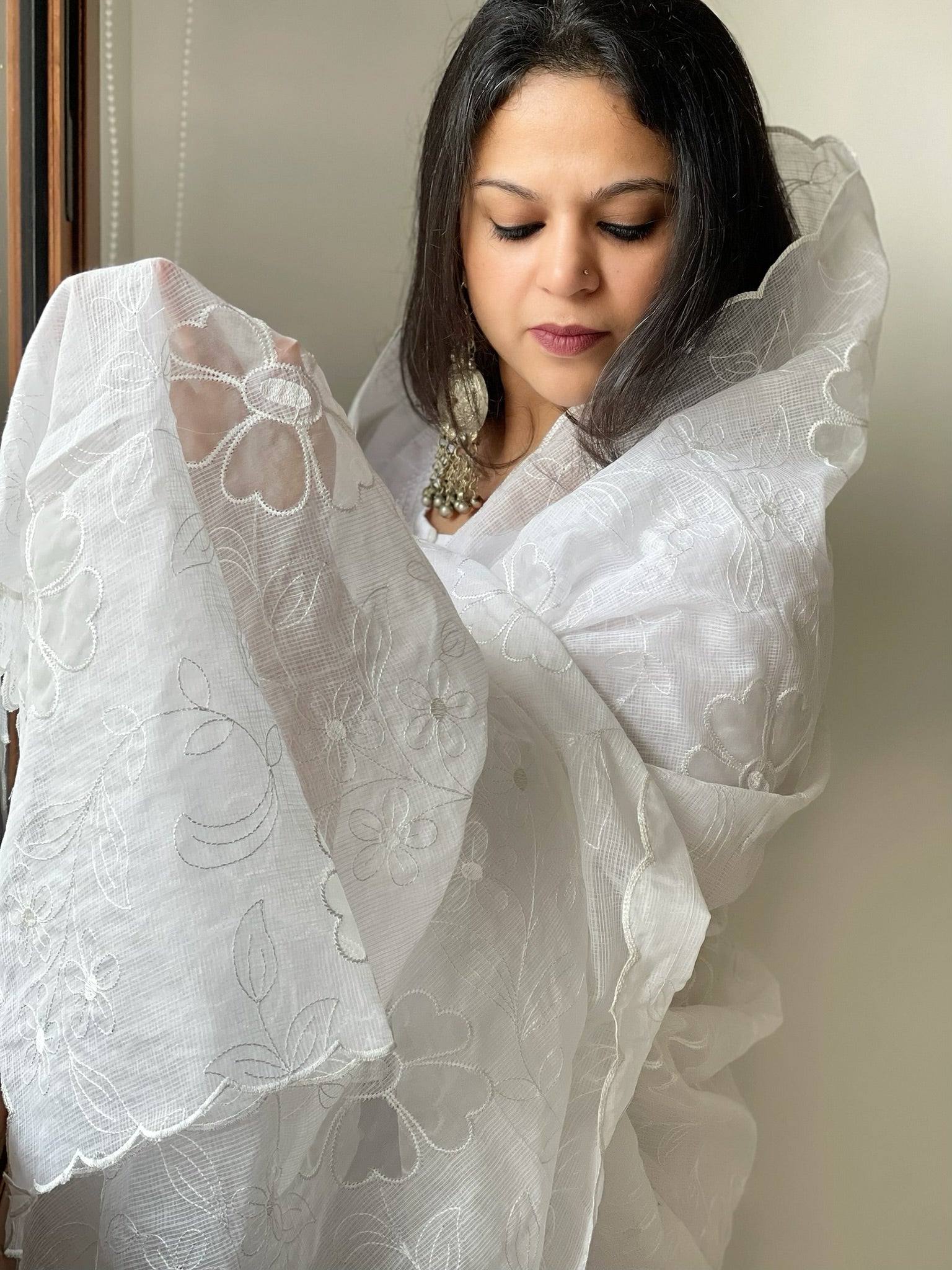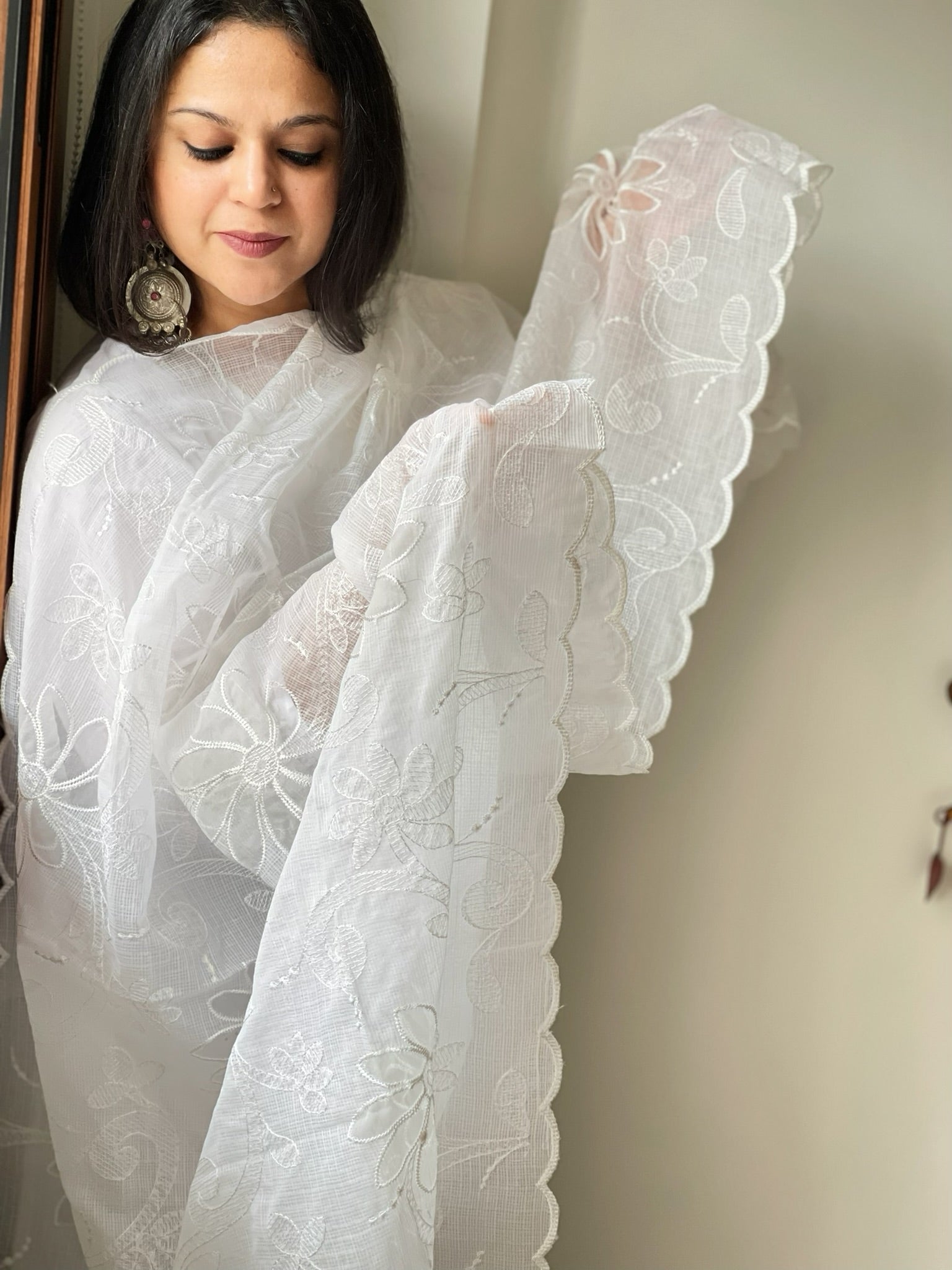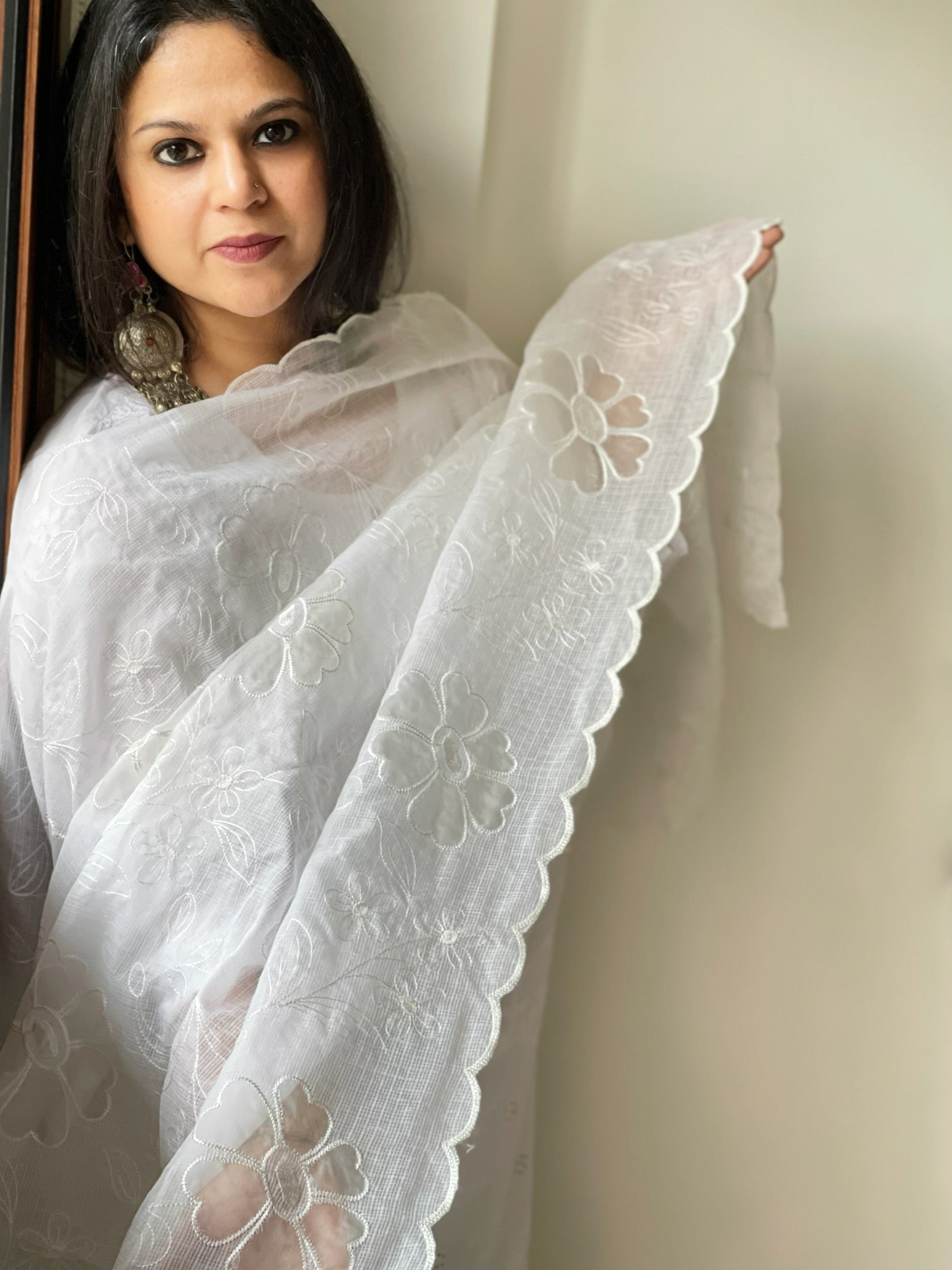 This White Kota Cotton Dupatta with Cut Work Jaal is a piece of art that exudes summery and lite vibes. Made from high-quality Kota cotton, it features delicate cut work jaal that adds a touch of elegance. Perfect for any occasion, this dupatta is both stylish and comfortable.